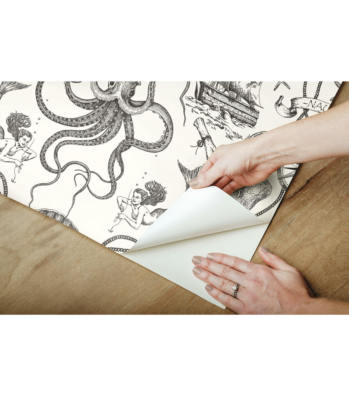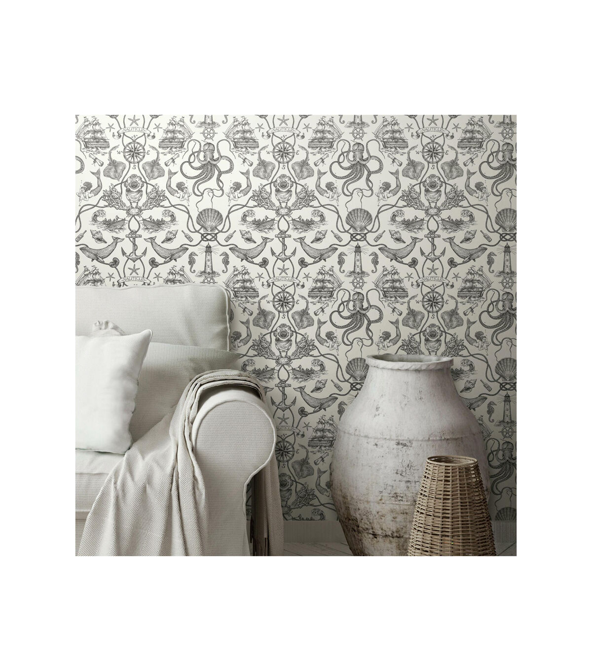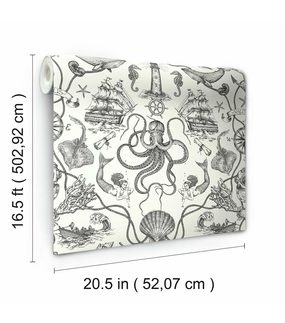 An amusing addition to bath or beach house, Deep Sea Toile Peel and Stick Wallpaper from RoomMates has it all - from seahorses to mermaids, ships to lighthouses, and much more taken from Davy Jones' locker. Simple and affordable, give walls, decor and accessories a refreshing transformation with very little effort. Great for DIY projects, temporary home decorating and more, Peel and Stick Wallpaper transforms any space or decor in minutes. Simply peel from the backing and stick to any clean flat surface. When it’s time to redecorate, remove in full strips without damaging painted walls or leaving any sticky residue behind. Bring the glories of nature into your home with Peel and Stick Wallpaper from RoomMates. 20.5 inches x 16.5 feet 20.5 Repeat. Straight Match. 28.18 square feet