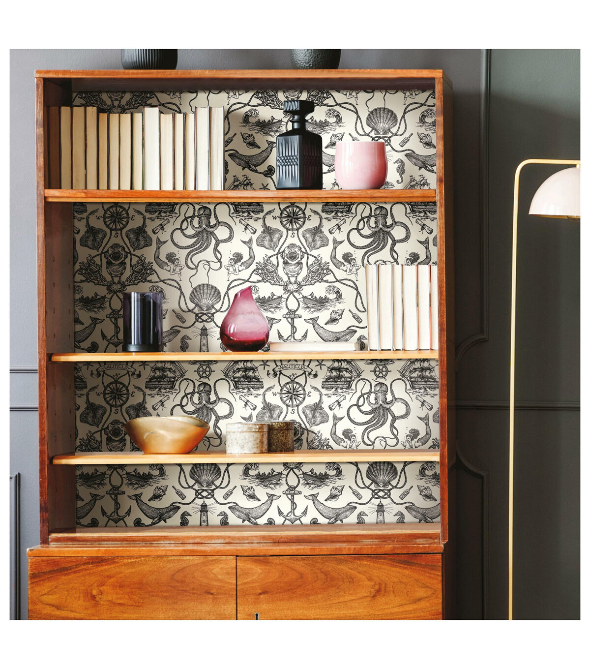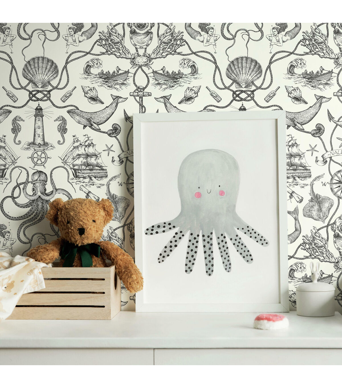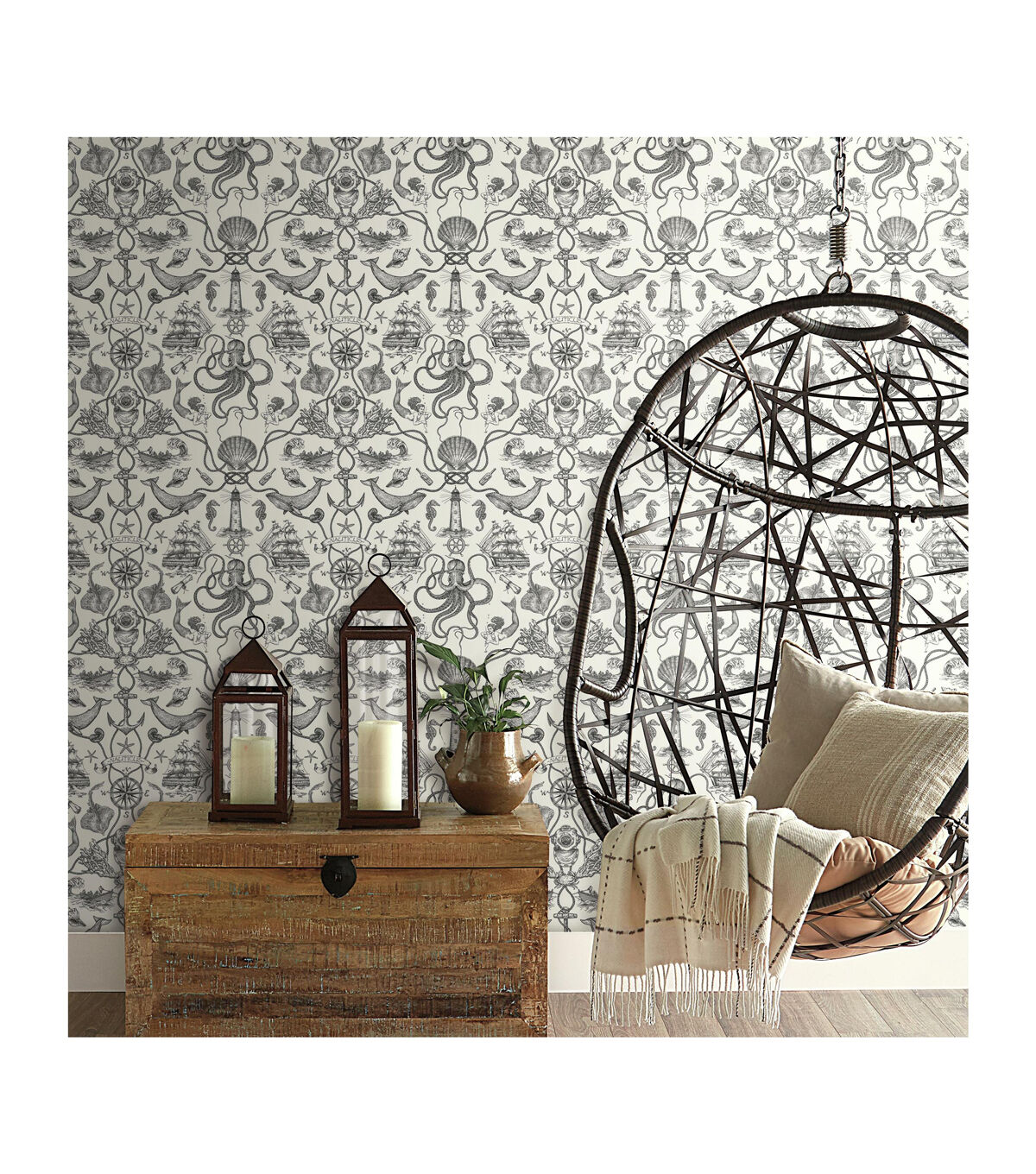 An amusing addition to bath or beach house, Deep Sea Toile Peel and Stick Wallpaper from RoomMates has it all - from seahorses to mermaids, ships to lighthouses, and much more taken from Davy Jones' locker. Simple and affordable, give walls, decor and accessories a refreshing transformation with very little effort. Great for DIY projects, temporary home decorating and more, Peel and Stick Wallpaper transforms any space or decor in minutes. Simply peel from the backing and stick to any clean flat surface. When it’s time to redecorate, remove in full strips without damaging painted walls or leaving any sticky residue behind. Bring the glories of nature into your home with Peel and Stick Wallpaper from RoomMates. 20.5 inches x 16.5 feet 20.5 Repeat. Straight Match. 28.18 square feet