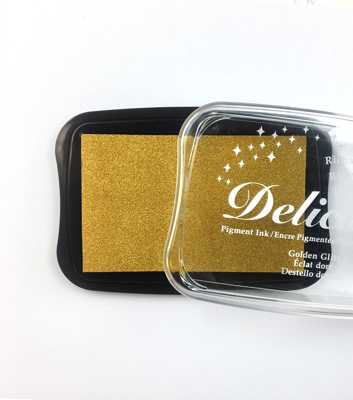 TSUKINEKO-Delicata Pigment Ink Pad. Exquisite metallic gold ink that will not tarnish or lose its luster. Dries quickly on porous papers. Metallic results are most stunning without embossing. Quick and easy alternative to gold leafing without the clean up! This package contains one 4x2-1/2 inch ink pad. Acid free, water based, archival. Conforms to ASTM D4236. Imported.