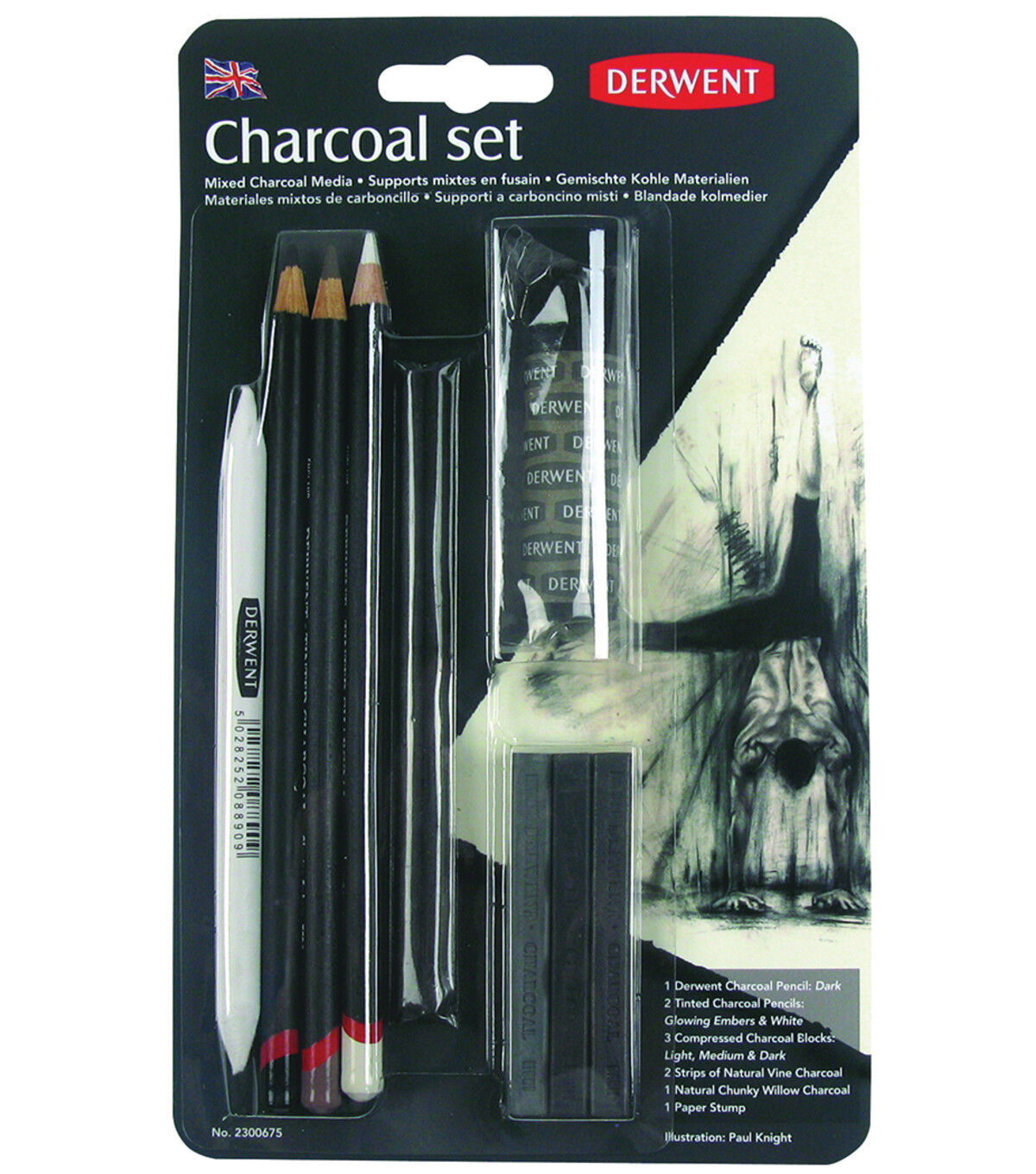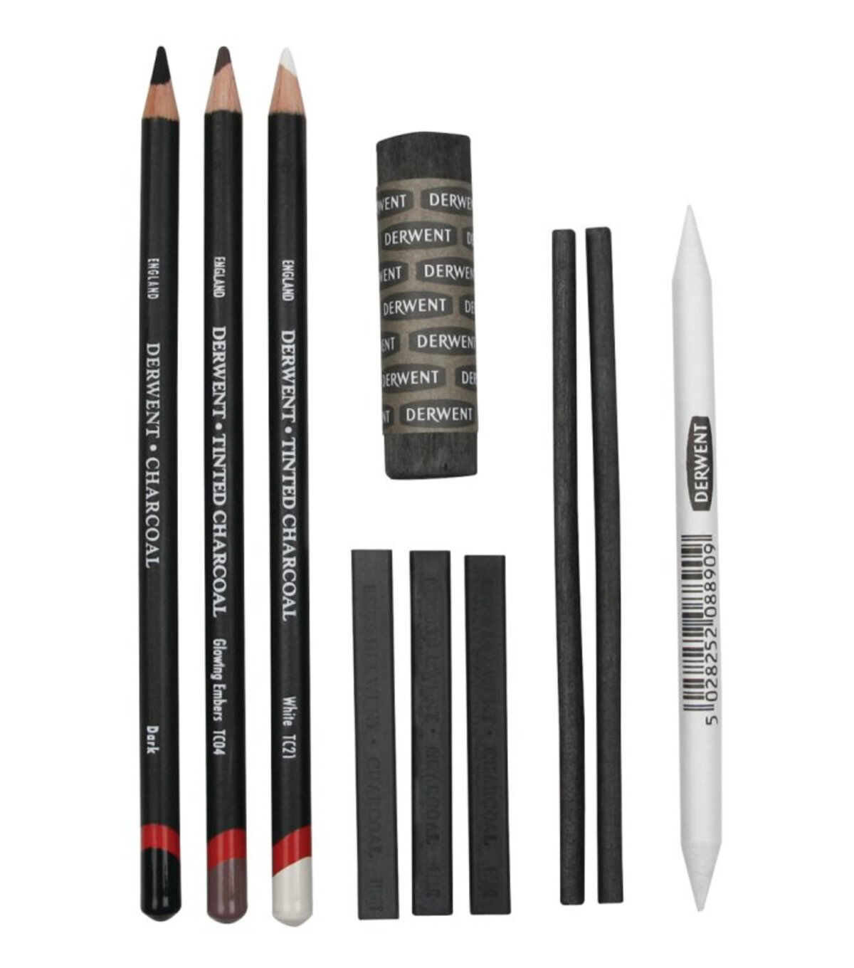 This charcoal collection has been specially selected to include a comprehensive range of charcoal media. This 10-piece set includes one dark charcoal pencil for intense lines, two tinted charcoal pencils in the colors glowing embers and white for natural color and highlights, three compressed charcoal blocks for larger drawings, two strips of natural vine charcoal for organic mark making, and one natural chunky willow charcoal to make broad expressive strokes.