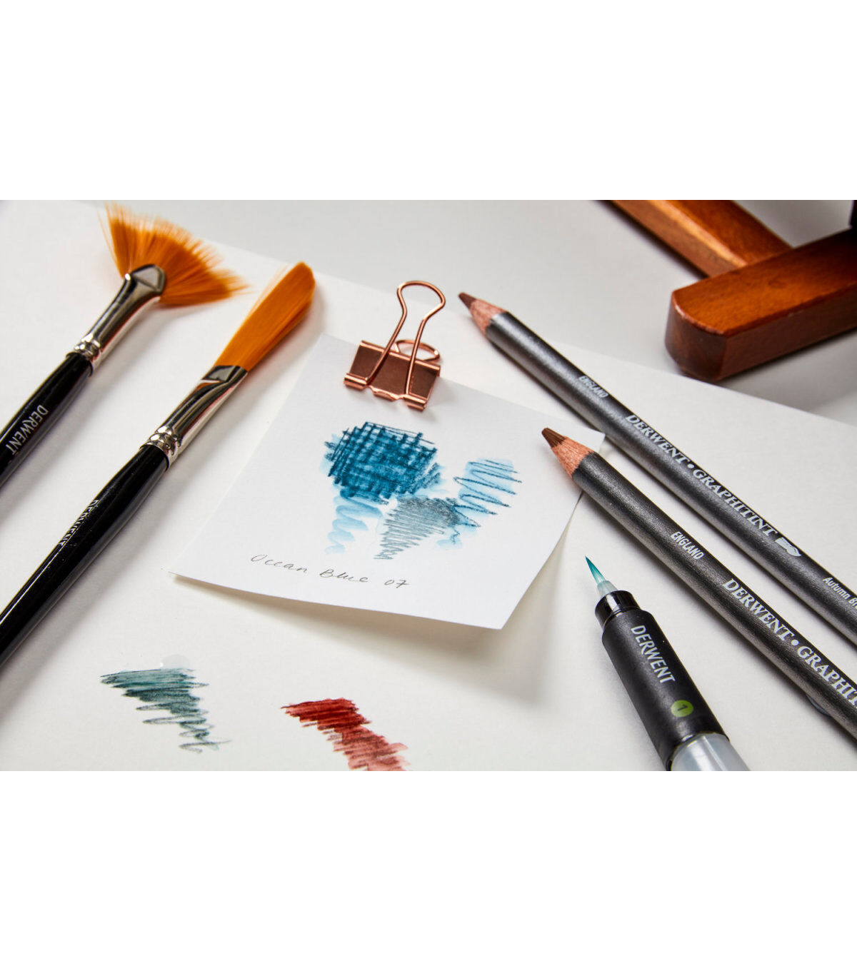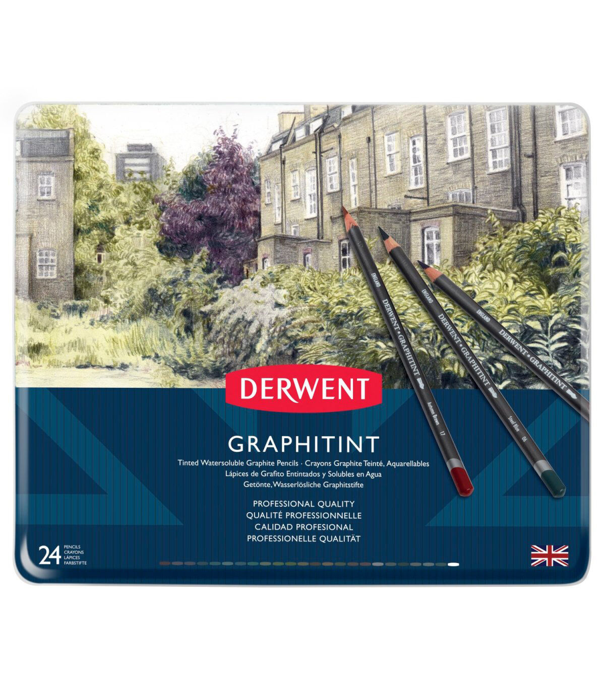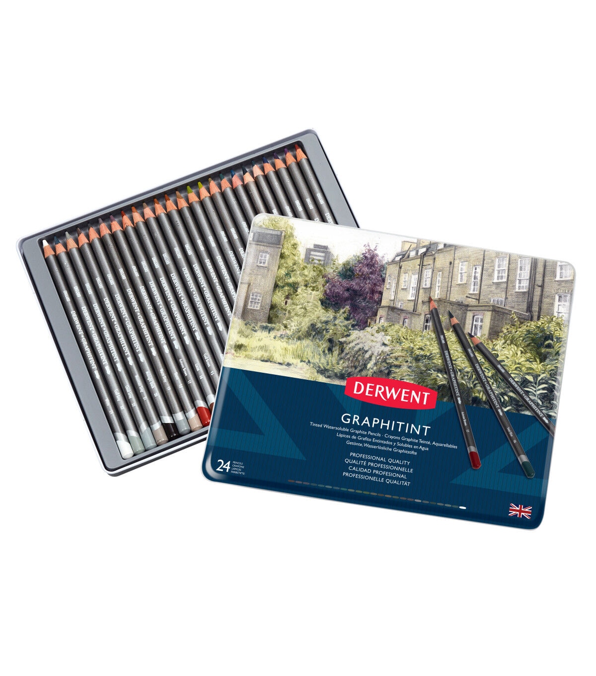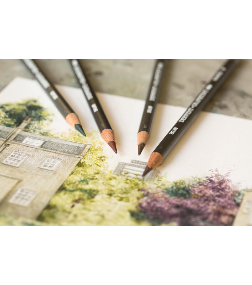 Derwent Graphitint Pencils are fine art graphite pencils with a hint of soft, subtle color. Used dry, Graphitint produces subtle shades of gray with just a suggestion of color, but add water to wash out the lines and make the color much more vibrant. Set colors include Port, Juniper, Aubergine, Dark Indigo, Shadow, Steel Blue, Ocean Blue, Slate Green, Green Grey, Meadow, Ivy, Sage, Chestnut, Russet, Cool Brown, Cocoa, Autumn Brown, Storm, Warn Grey, Midnight Black, Mountain Grey, Cloud Grey, Cool Grey and White.