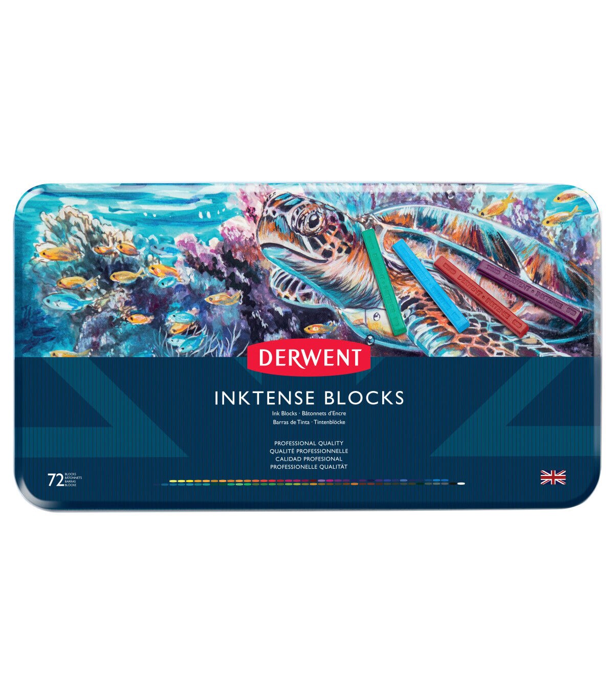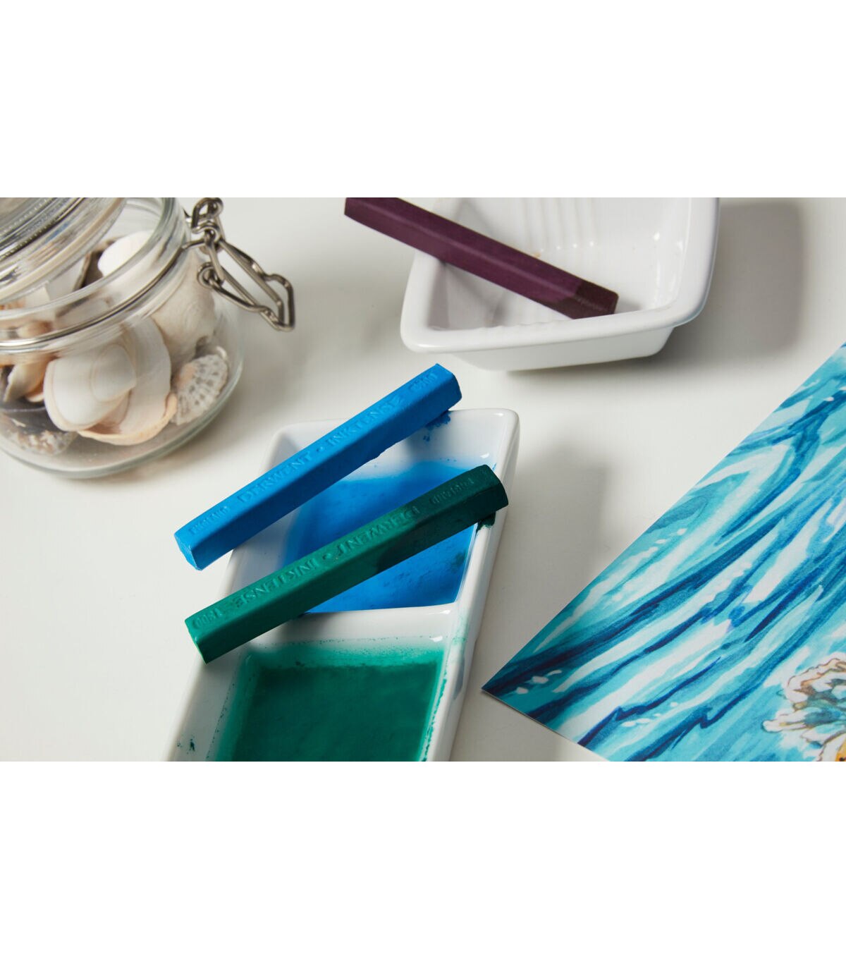These versatile blocks of color can be used wet or dry, as colored pencils, watercolor, or even paint pans - simply dab your brush and go. All the brilliance of Inktense pencils in a chunky block that makes it easy to cover large areas, sketch freely and use a variety of techniques. Once dry, the color is permanent and you can work over the top of it. These blocks can also be used on fabric to create stunning silk paintings and other craft projects. Set colors include Sherbet Lemon, Sun Yellow, Cadmium Yellow, Sicilian Yellow, Golden Yellow, Sienna Gold, Cadmium Orange, Burnt Orange, Tangerine, Mid Vermilion, Scarlet Pink, Poppy Red, Hot red, Chili Red, Cherry, Carmine Pink, Crimson, Shiraz, Red Violet, Fuchsia, Deep Rose, Thistle, Dusky Purple, Mauve, Dark Purple, Deep Violet, Violet, Lagoon, Peacock Blue, Navy Blue, Iron Blue, Deep Blue, Iris Blue, Bright Blue, Deep Indigo, Sea Blue, Dark Aquamarine, Turquoise, Mallard Green, Green Aquamarine, Teal Green, Iron Green, Ionian Green, Vivid Green, Apple Green, Field Green, Beech Green, Hookers Green, Felt Green, Light Olive, Spring Green, Fern, Leaf Green, Mustard, Amber, Tan, Oak, Saddle Brown, Baked Earth, Willow, Red Oxide, Madder Brown, Dark Chocolate, Bark, Sepia Ink, Indian Ink, Chinese Ink, Charcoal Grey, Payne's Grey, Neutral Grey, Ink Black, Antique White.