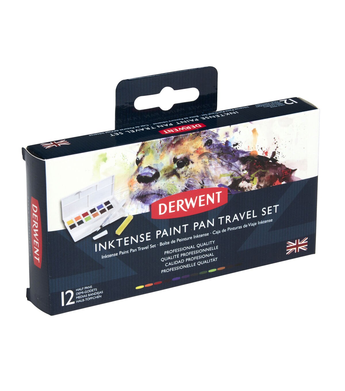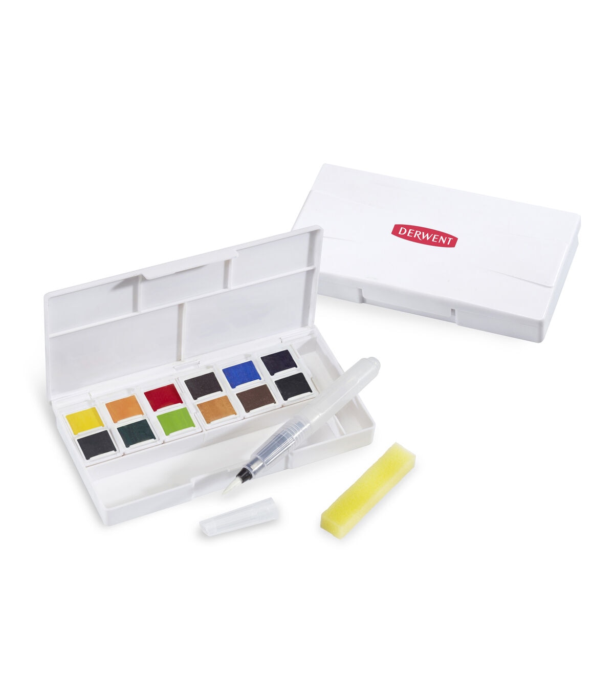 The Derwent Inktense Paint Pan Travel Set-Assorted Colors contains the unique Inktense formulation found in the brand's pencil and block ranges. Unlike traditional watercolor, washes of vivid paint can be applied without dissolving previously dried layers. Ideal for travel with everything needed to paint on the go. This pack contains 12 paint pans in assorted colors, one mini water brush, one sponge and five mixing palettes.