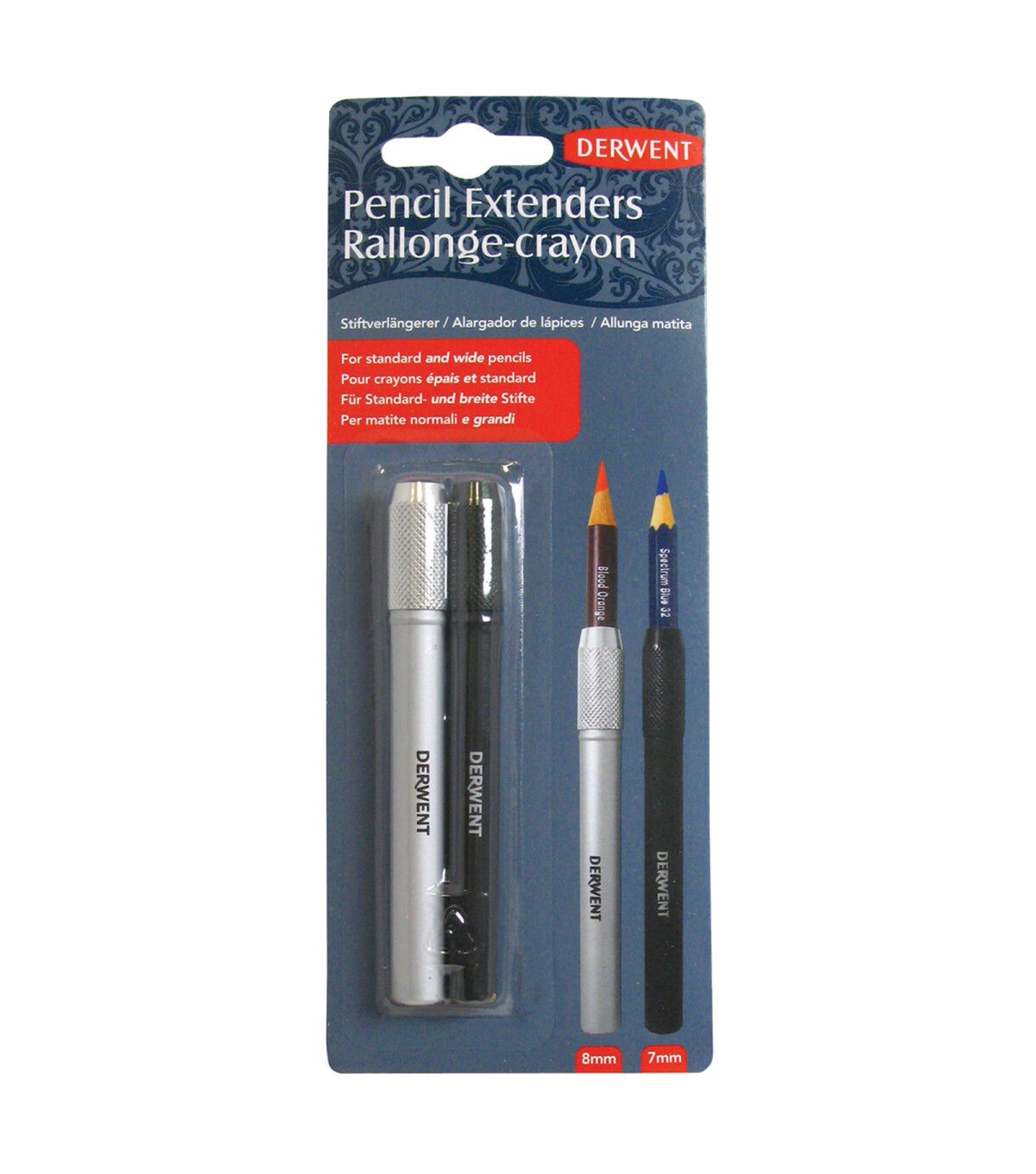 Prolong the life of your pencils with these handy extenders. The silver one fits larger Derwent diameter pencils (up to 9mm) such as Inktense and Artists, while the black one fits all other standard size Derwent pencils (up to 7mm in diameter) such as Graphic and Watercolor. This set contains one of each size.