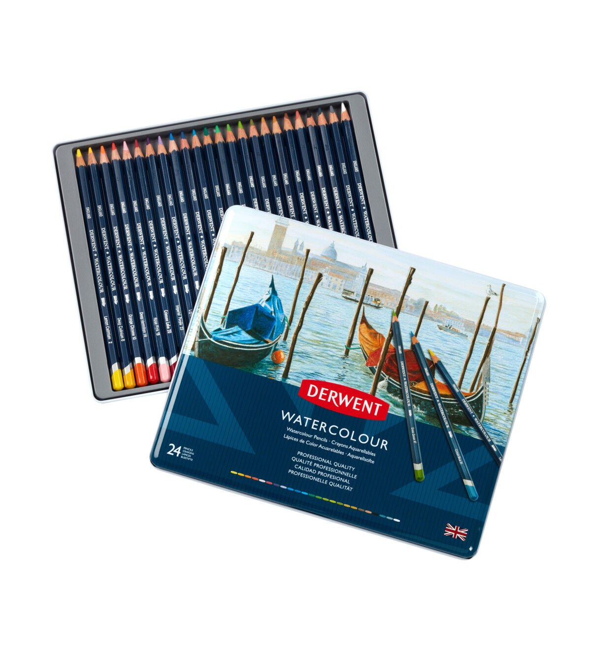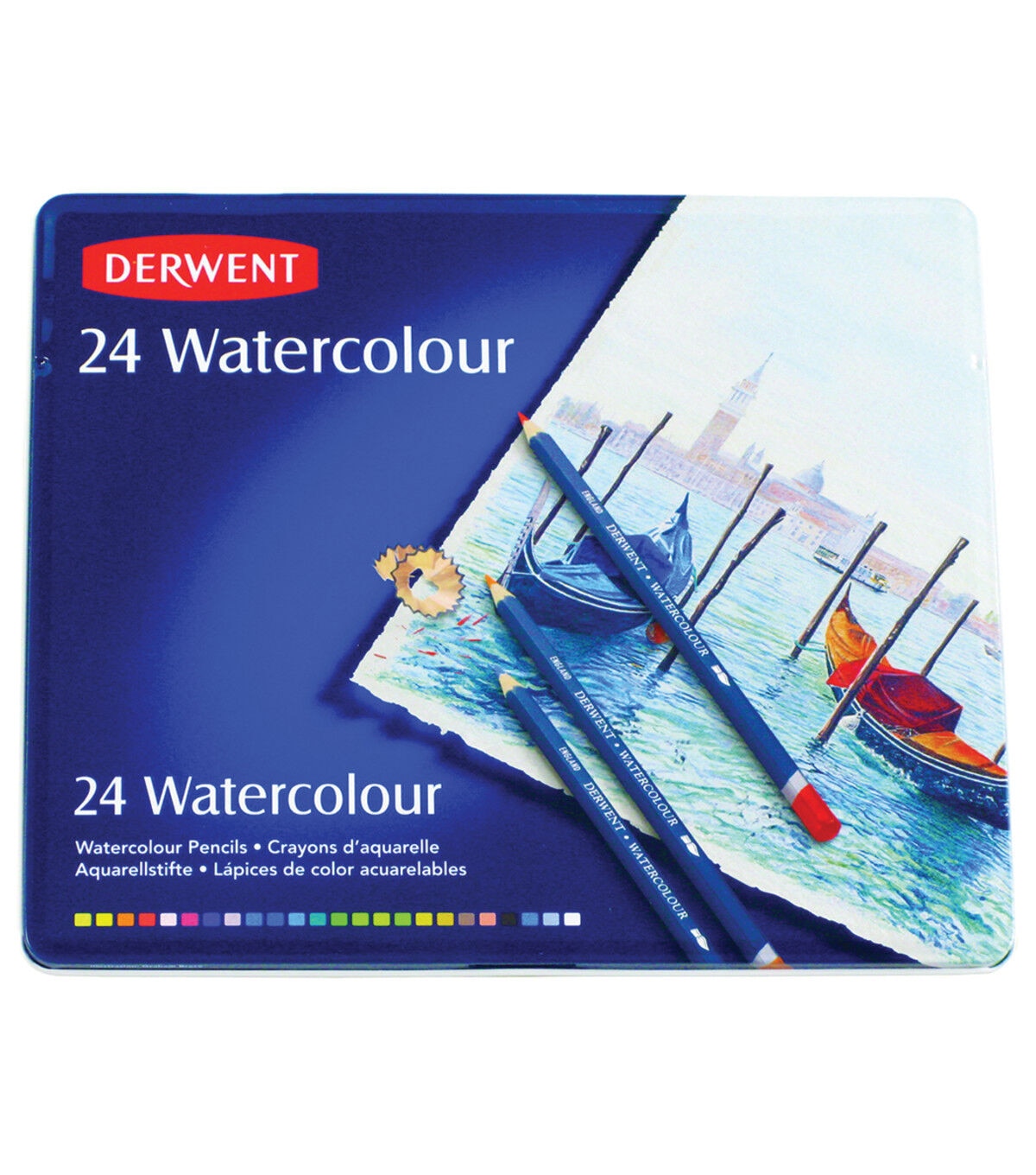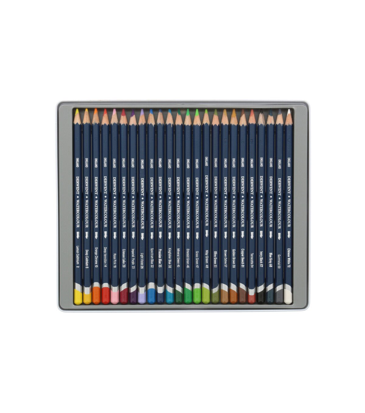 A winning combination of pure, consistent color with great versatility. Use dry as a conventional color pencil or wash over with a brush to achieve true watercolor effects. Watercolor is not permanent, so once the color is dry you can re-wet it and move it about again. Set colors include Lemon Cadmium, Deep Cadmium, Orange Chrome, Deep Vermilion, Rose Pink, Crimson Lake, Imperial Purple, Light Violet, Spectrum Blue, Prussian Blue, Kingfisher Blue, Mineral Green, Emerald Green, Grass Green, May Green, Olive Green, Brown Ochre, Golden Brown, Copper Beech, Terracotta, Ivory Black, Blue Grey, Gunmetal and Chinese White. Includes assorted colors, 24 pencils, Easy to blend and layer, Includes tin storage case
