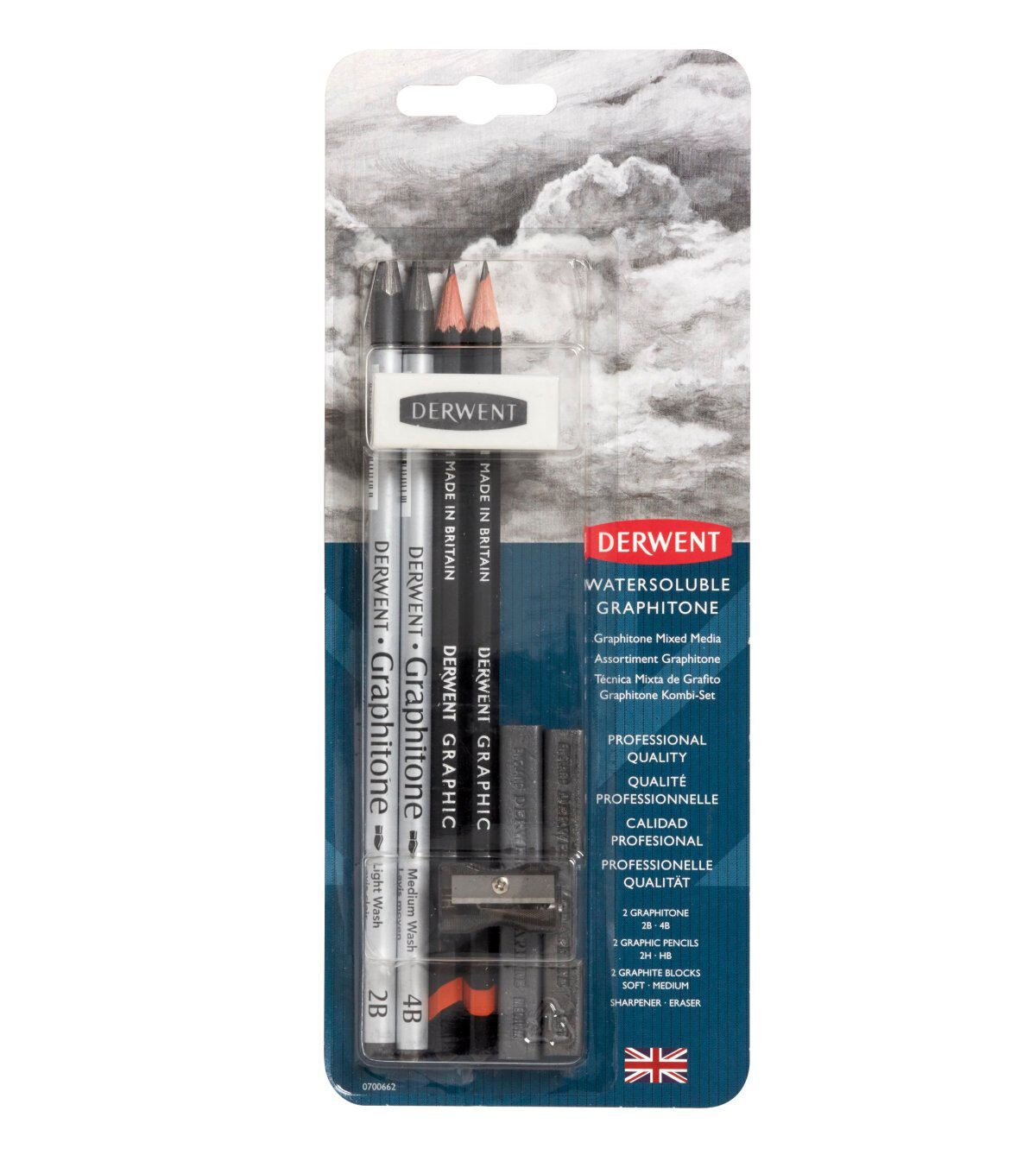 Adding water to graphite creates subtle washes, unique textures and workable surfaces that add to your creative process. This Watersoluble Graphitone Mixed Media set includes 2 Watersoluble Graphitone sticks (2B and 8B), 2 Graphic Pencils (2H and HB), 2 Graphite Blocks (Soft and Medium).
