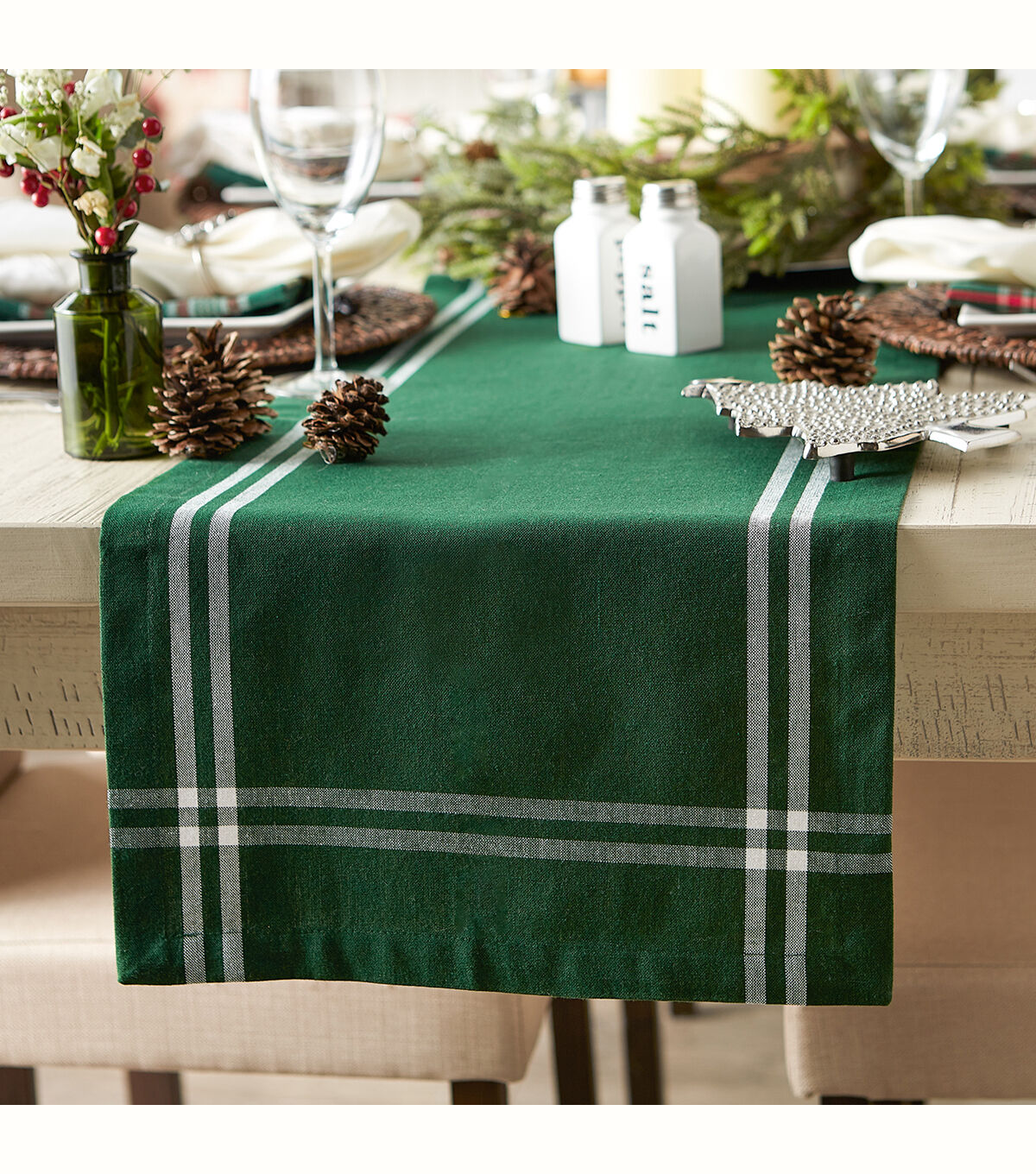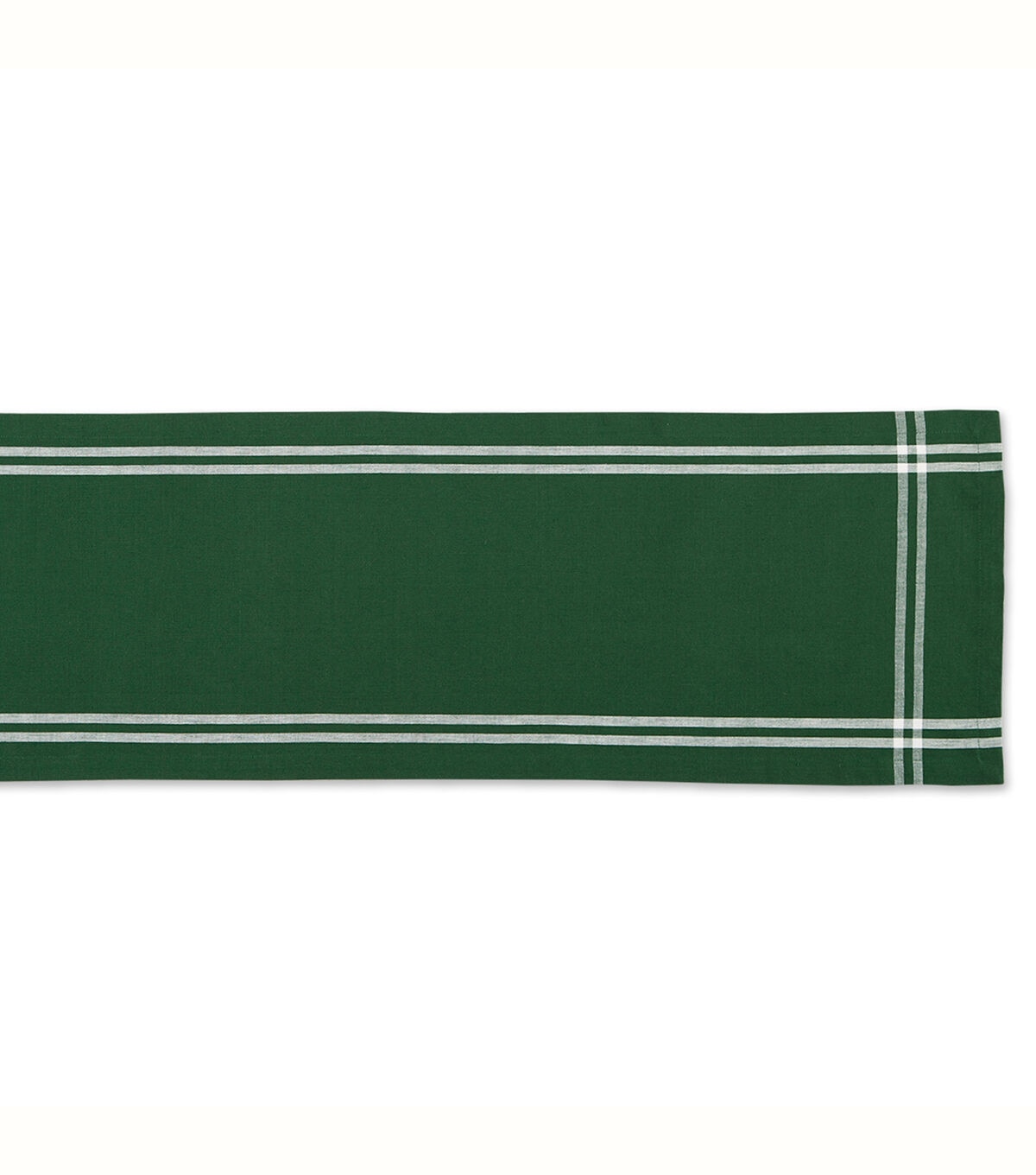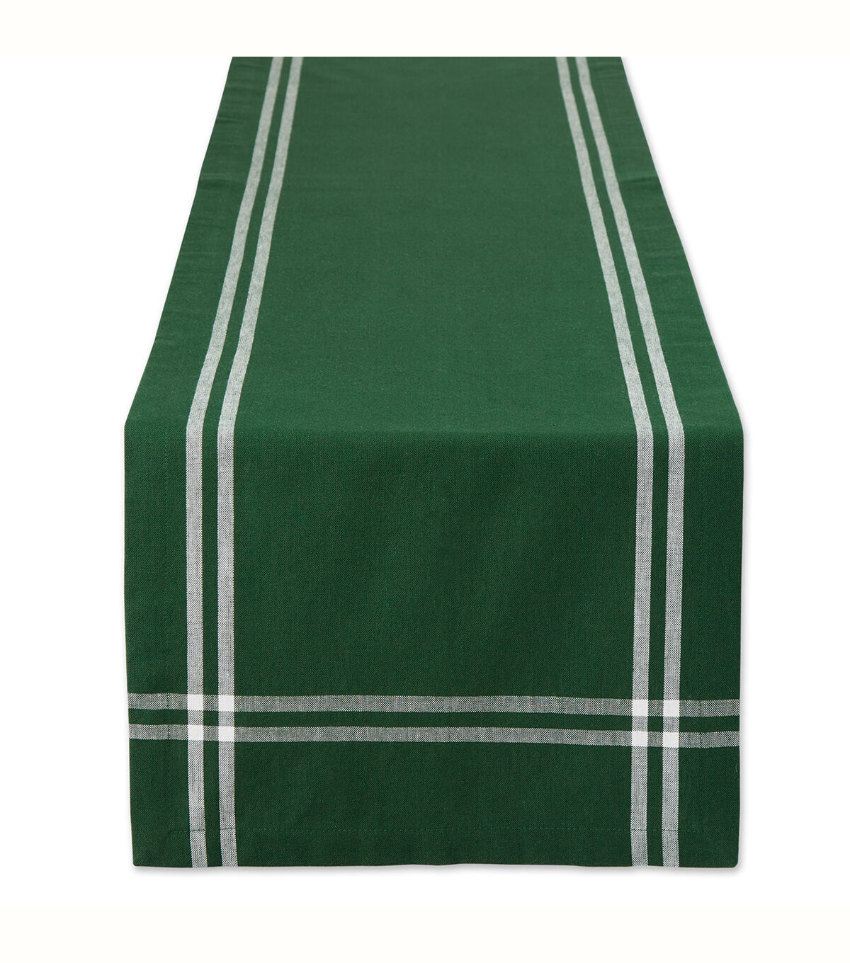 Design Imports Balsam Border Stripe Table Runner 14x72 -This table runner is 100% cotton and measures 14"x72". Table runner is constructed with 1" hem and mitered corners. Perfect for a winter party, Christmas dinner or any day you want to show a little love to your family and guests by setting a beautiful table. Or think outside the box and use on a coffee table, console table, bedroom dresser or book shelf to give a polished look. Machine wash cold separately. Gentle cycle. Tumble dry low. Low iron. Wash separately before use. Matching napkins and tablecloths available.