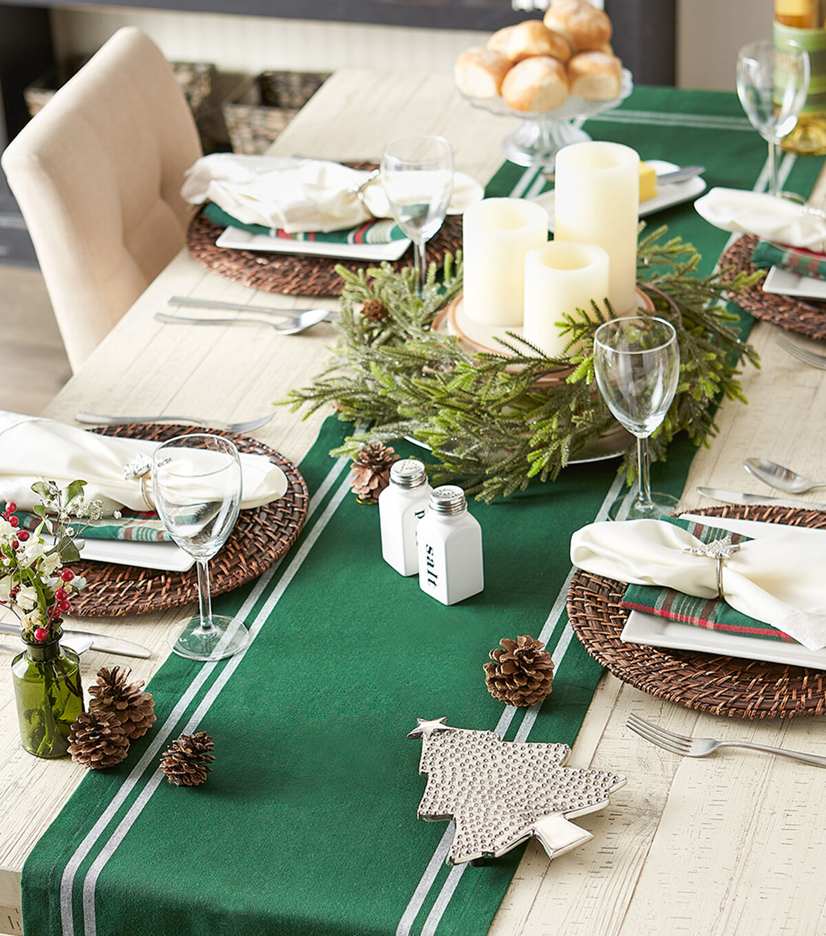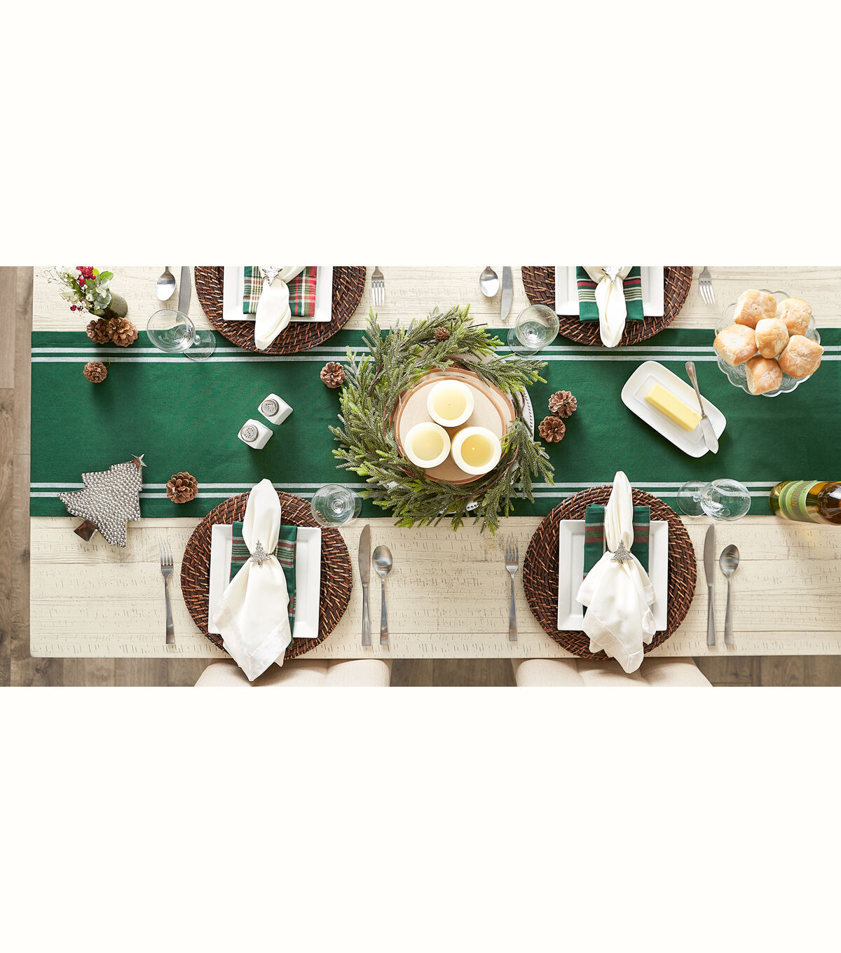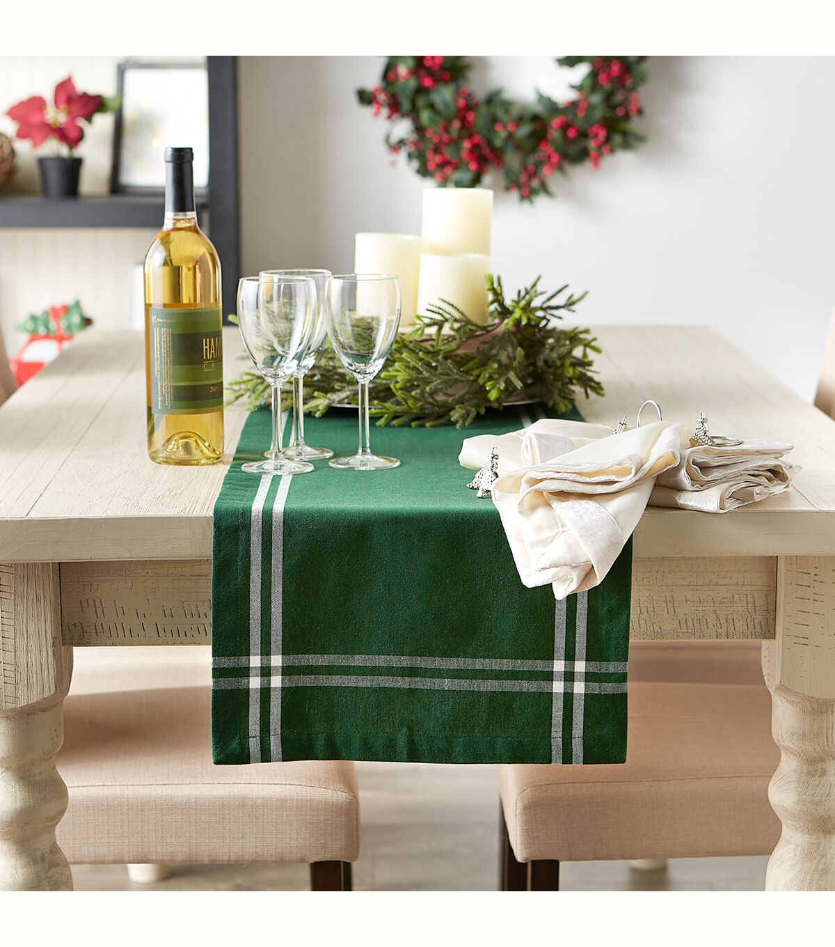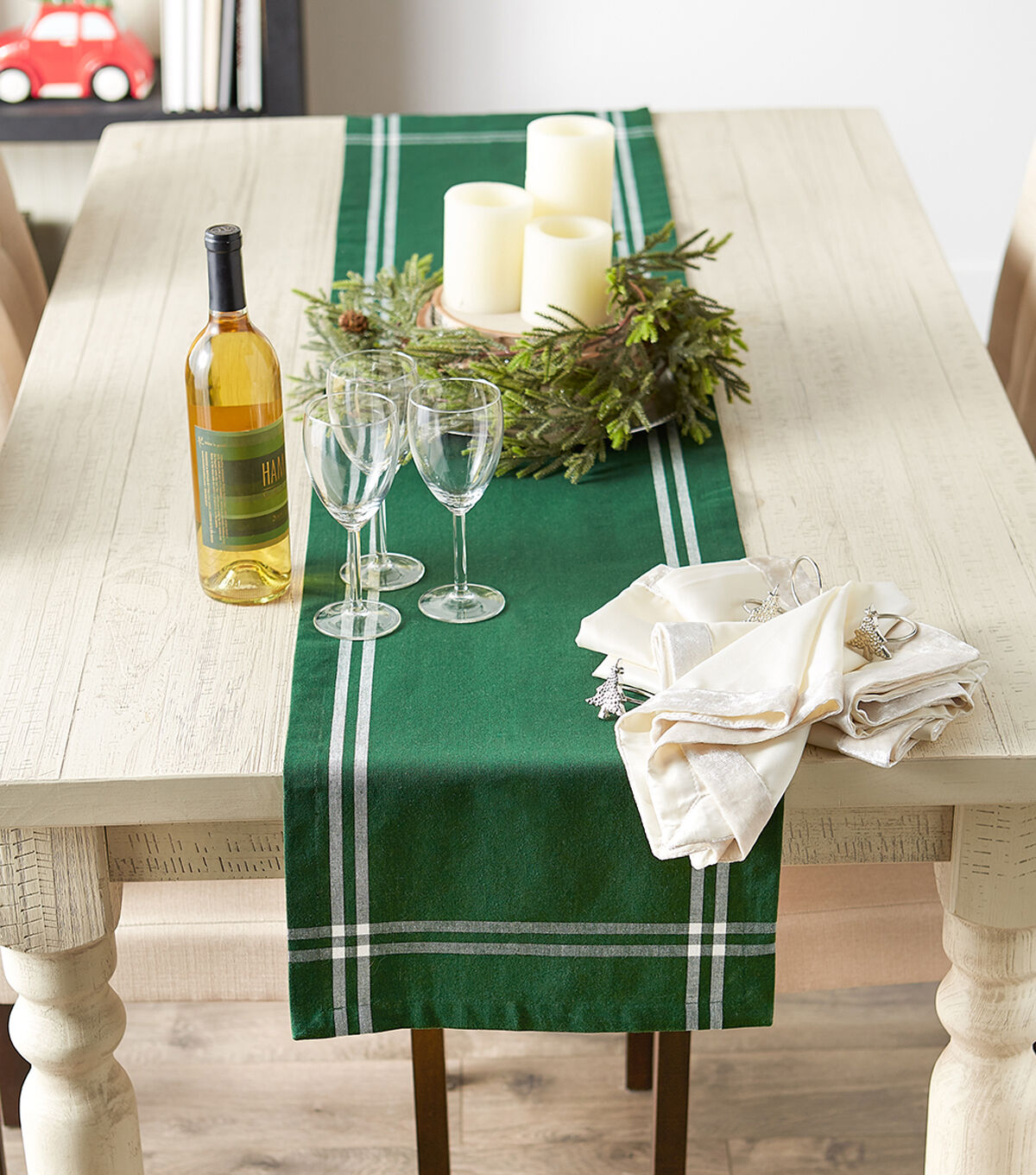Design Imports Balsam Border Stripe Table Runner 14x72 -This table runner is 100% cotton and measures 14"x72". Table runner is constructed with 1" hem and mitered corners. Perfect for a winter party, Christmas dinner or any day you want to show a little love to your family and guests by setting a beautiful table. Or think outside the box and use on a coffee table, console table, bedroom dresser or book shelf to give a polished look. Machine wash cold separately. Gentle cycle. Tumble dry low. Low iron. Wash separately before use. Matching napkins and tablecloths available.