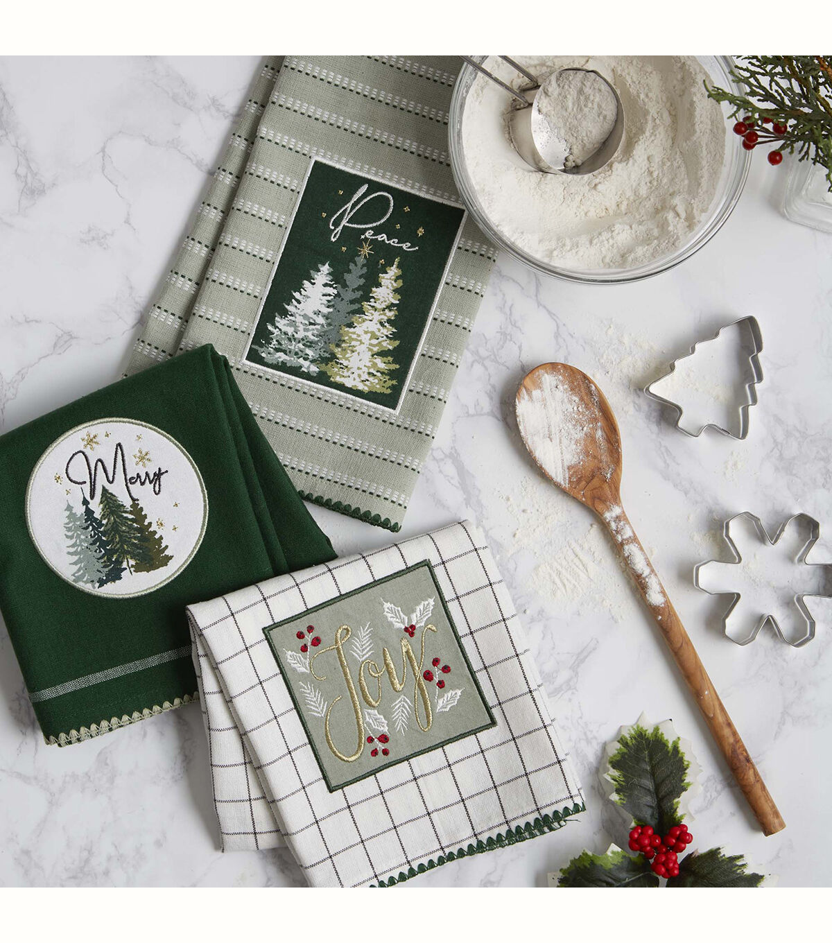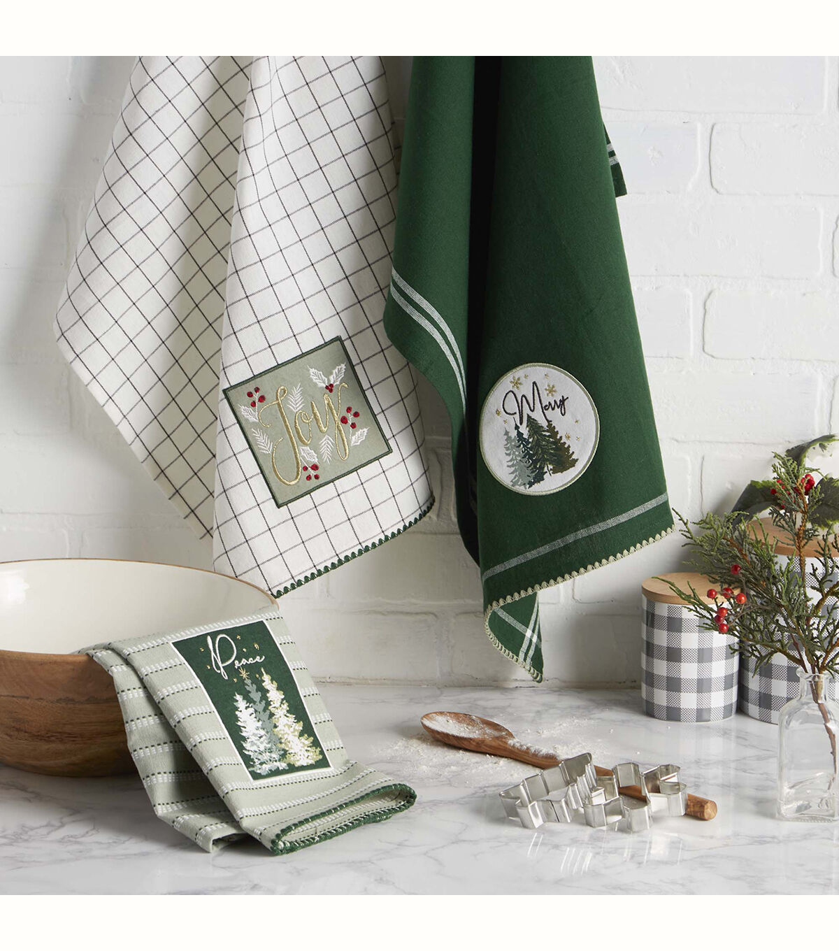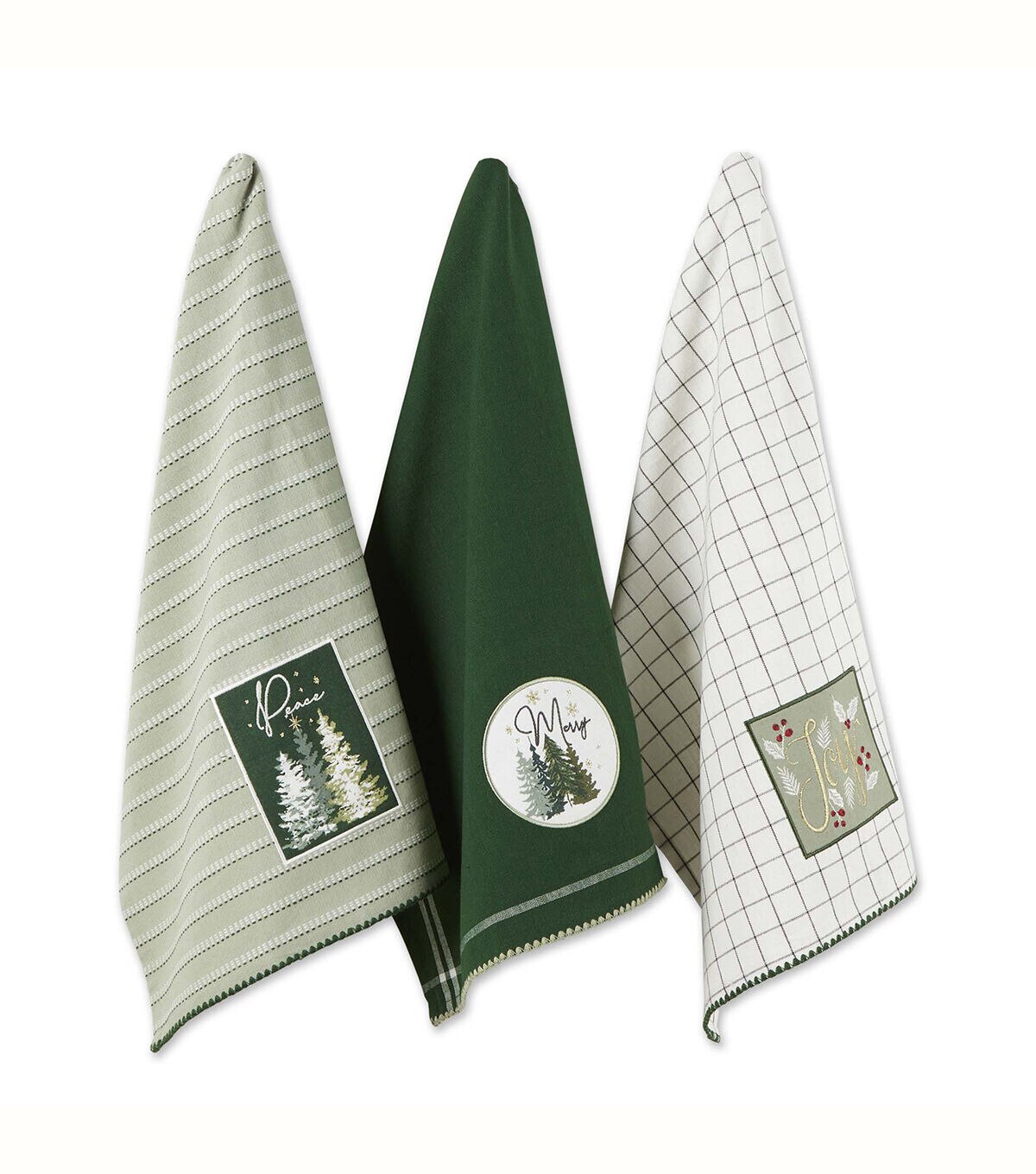 Design Imports Set of 3 Assorted Winter Woods Embellished Kitchen Towels - Each set contains 3 coordinating kitchen towels each measuring 18"x28". Each kitchen towel is 100% cotton. Each set contains one each: Peace Snowy Trees embellished kitchen towel; Merry Trees embellished kitchen towel and Joy Sprigs embellished kitchen towel. Each towel features lace stitched trim along bottom 18" hem. Each kitchen towel has a hanging loop in corner and 3/8" hem. This set makes a lovely hostess or Secret Santa gift. These kitchen towels will add a little holiday cheer to your kitchen! Machine wash cold separately. Gentle cycle. Tumble dry low. Low iron. Wash separately before use.