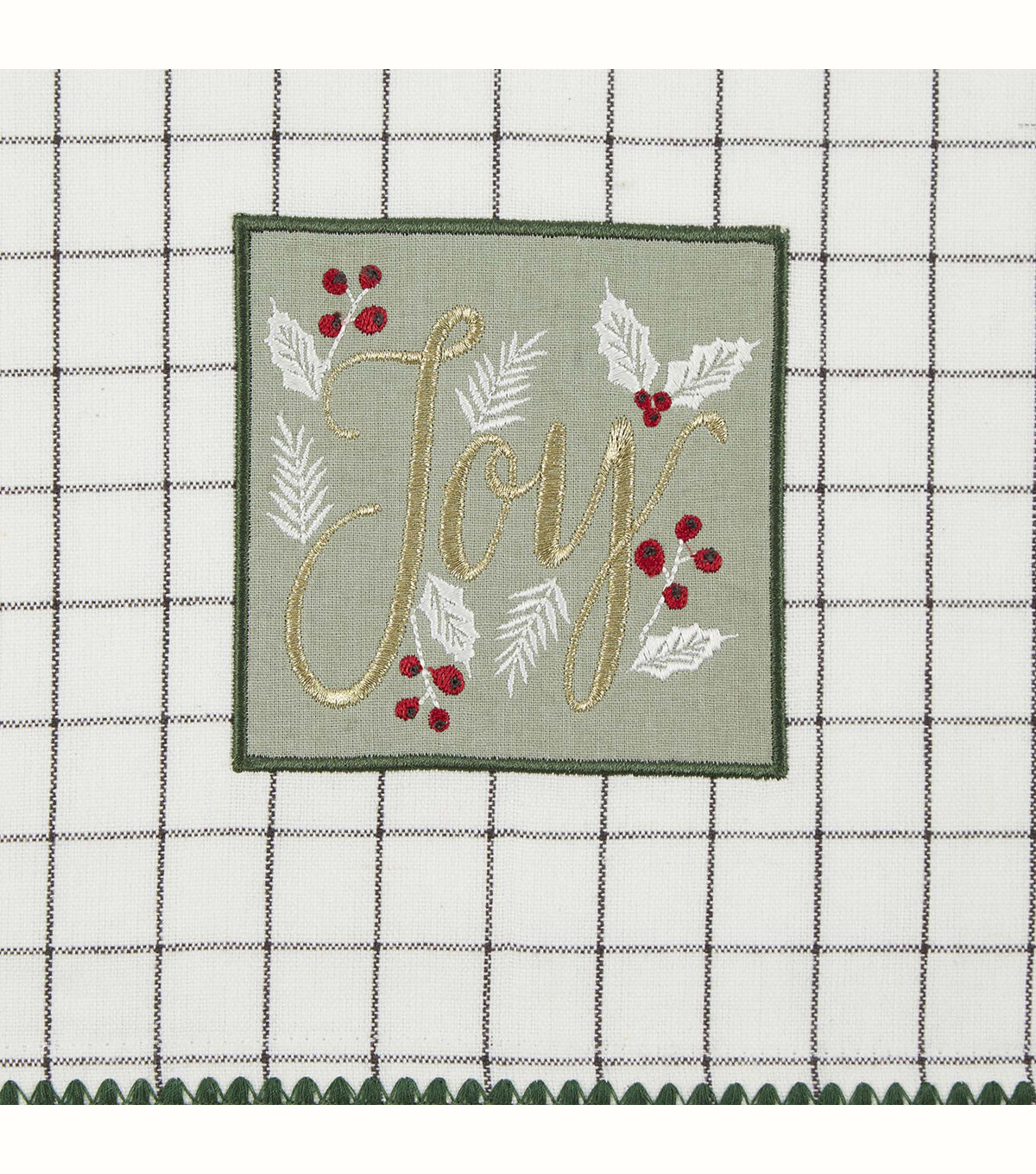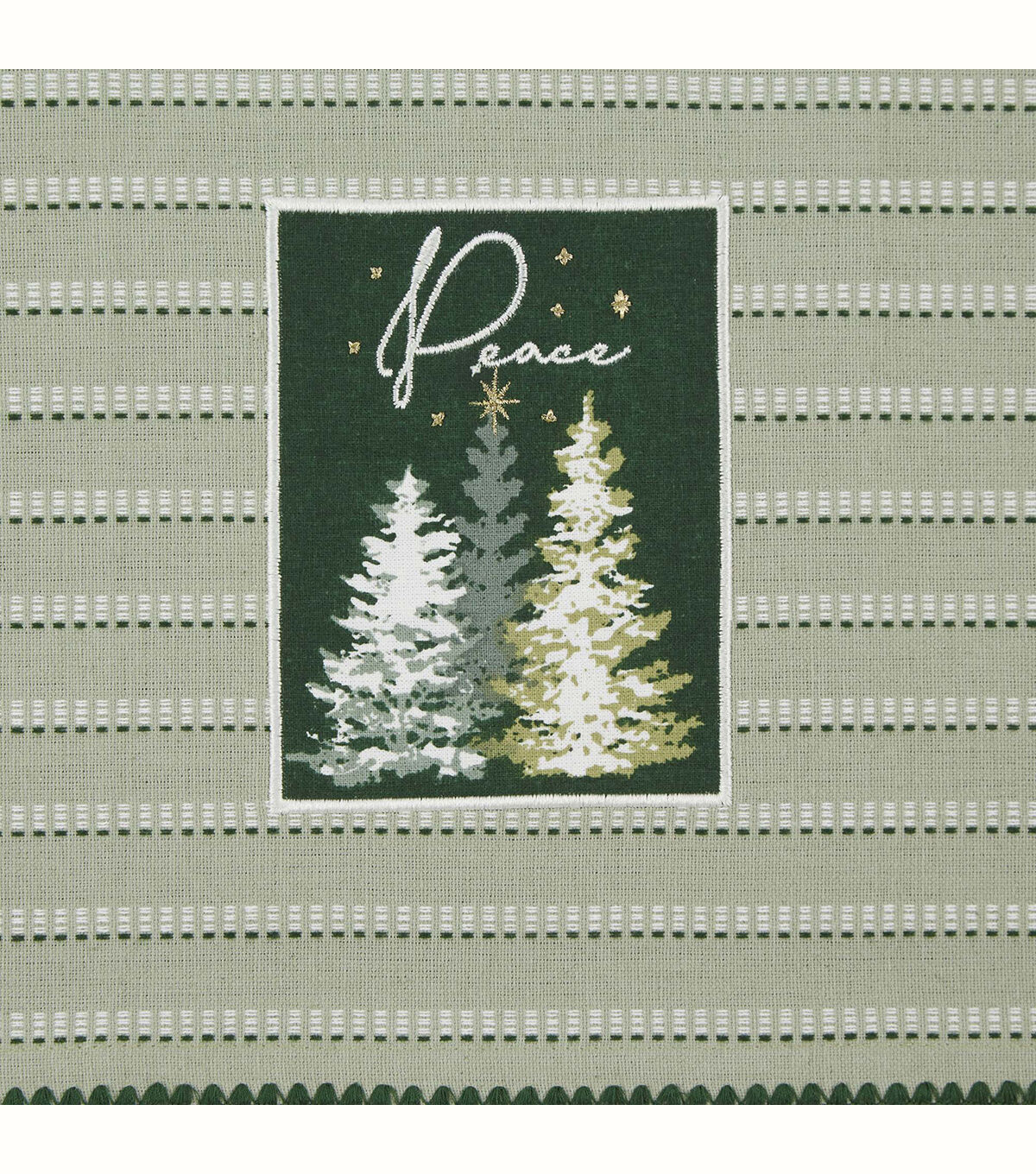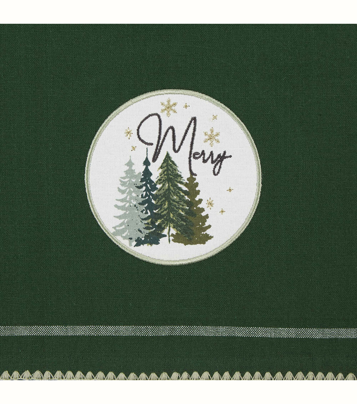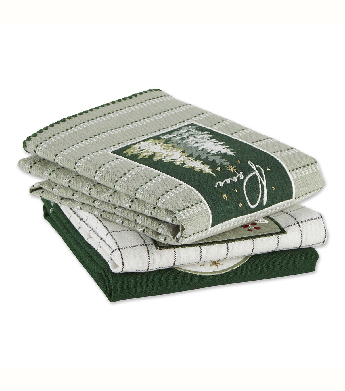 Design Imports Set of 3 Assorted Winter Woods Embellished Kitchen Towels - Each set contains 3 coordinating kitchen towels each measuring 18"x28". Each kitchen towel is 100% cotton. Each set contains one each: Peace Snowy Trees embellished kitchen towel; Merry Trees embellished kitchen towel and Joy Sprigs embellished kitchen towel. Each towel features lace stitched trim along bottom 18" hem. Each kitchen towel has a hanging loop in corner and 3/8" hem. This set makes a lovely hostess or Secret Santa gift. These kitchen towels will add a little holiday cheer to your kitchen! Machine wash cold separately. Gentle cycle. Tumble dry low. Low iron. Wash separately before use.
