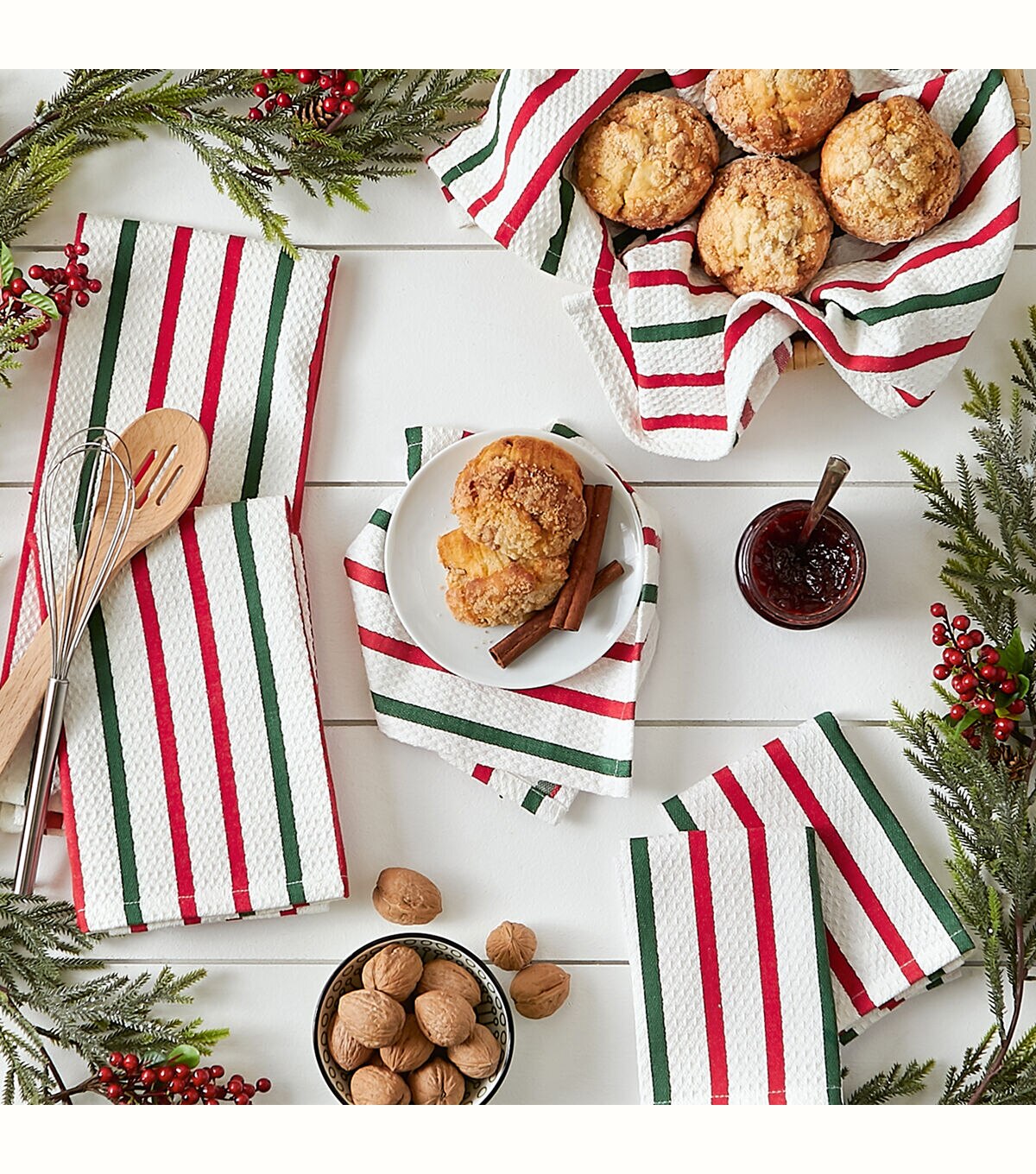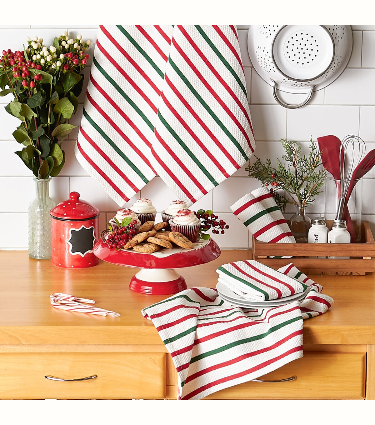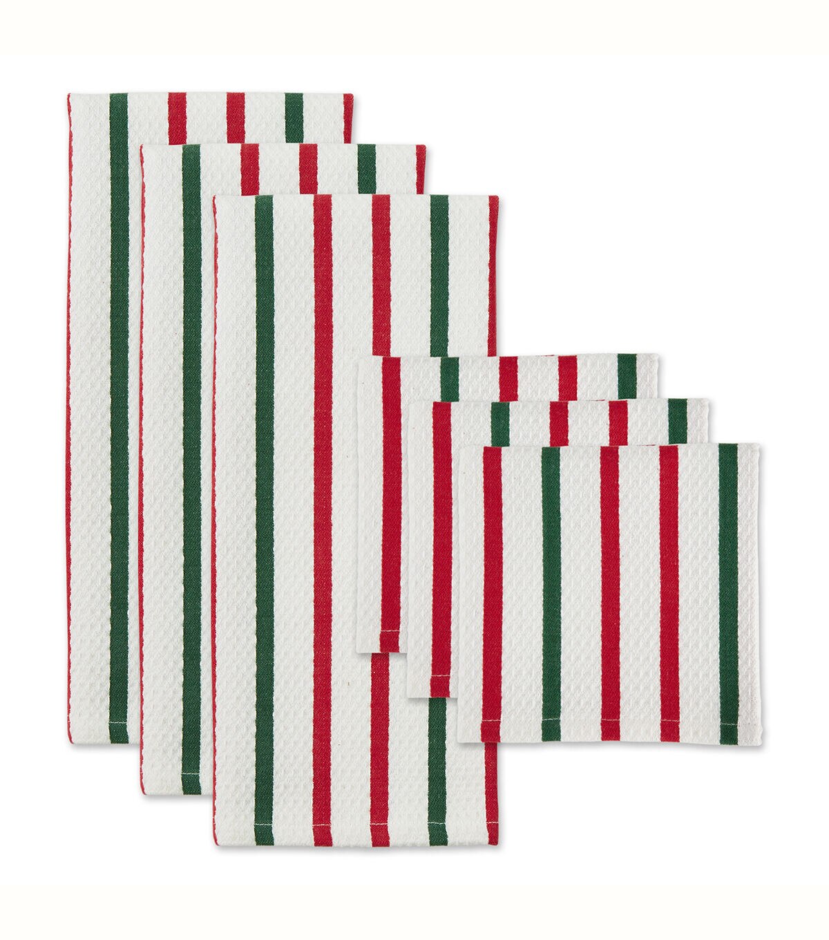 Design Imports Set of 6 Holiday Stripes Kitchen Towels & Dishcloths - Each set includes 3 100% cotton kitchen towels that measures 18"x 28" and 3 100% cotton dishcloths that measures 13" x 13" in our popular holiday stripe heavyweight fabric. This set is perfect to tackle all of your drying and cleaning kitchen tasks throughout the holiday season and everyday. With each wash, these kitchen towels and dishcloths become more absorbent, helping to clean up even the biggest messes. Machine wash cold separately. Makes a great stocking stuffer! Gentle cycle. Tumble dry low. Low iron. Wash separately before use.