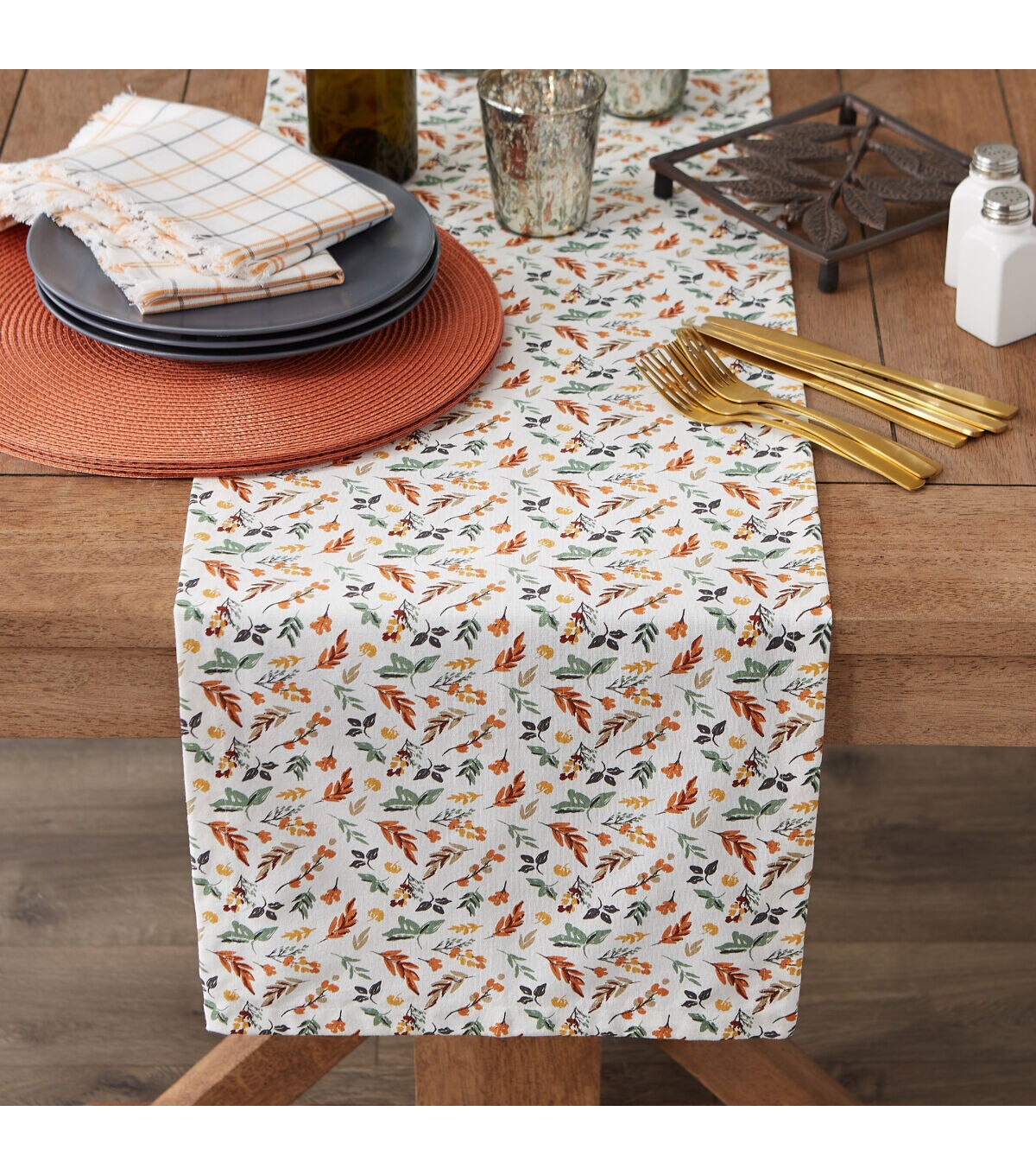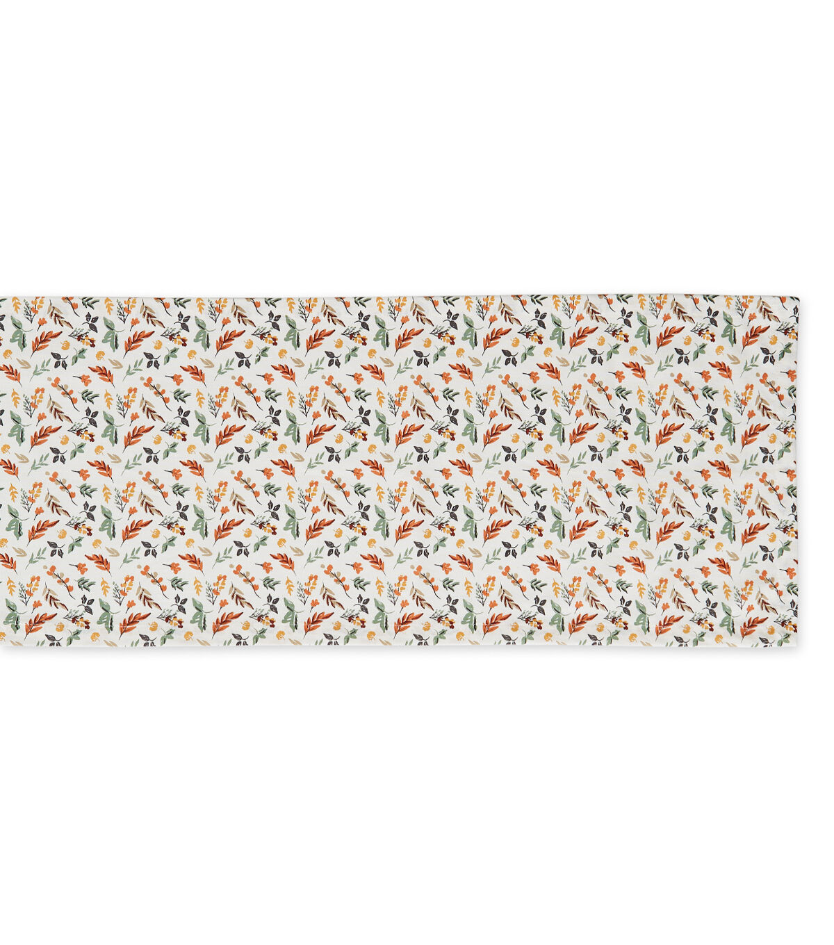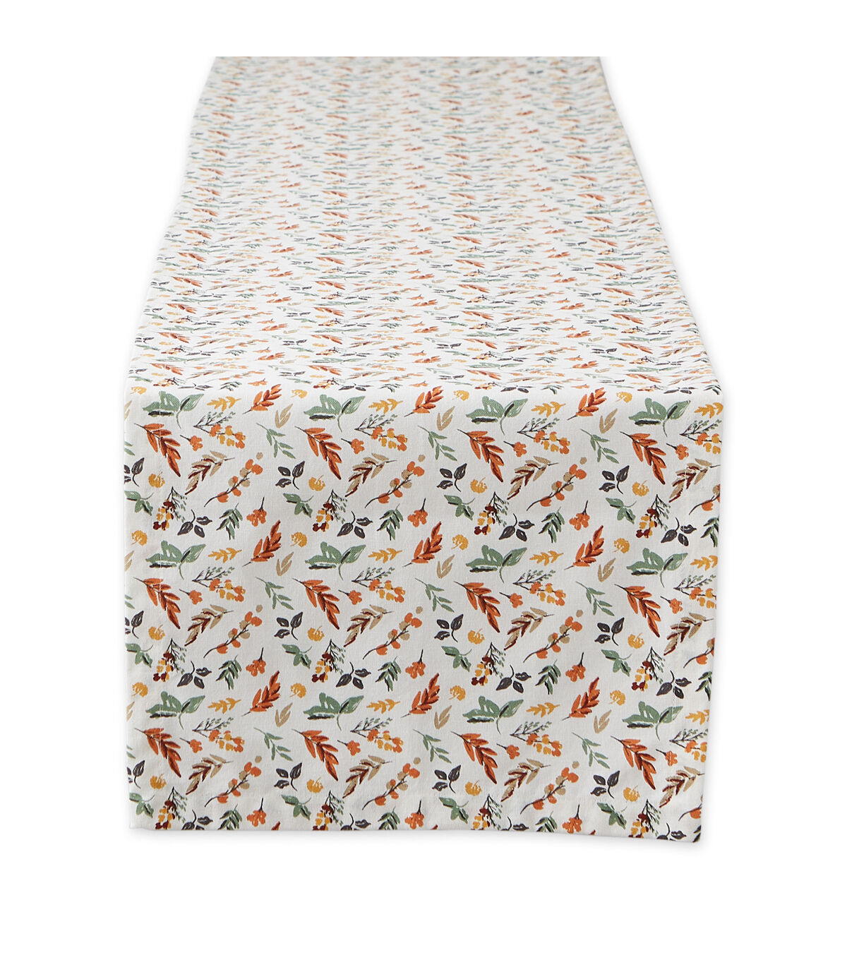 This table runner is 100% cotton and measures 14"x72". Beautiful on it's own or layer with other items from this collection. This table runner is constructed with mitered corners with a 1" hem. The festive Autumn design coordinates with many table settings. Machine wash cold separately. Gentle cycle. Tumble dry low. Low iron. Wash separately before use