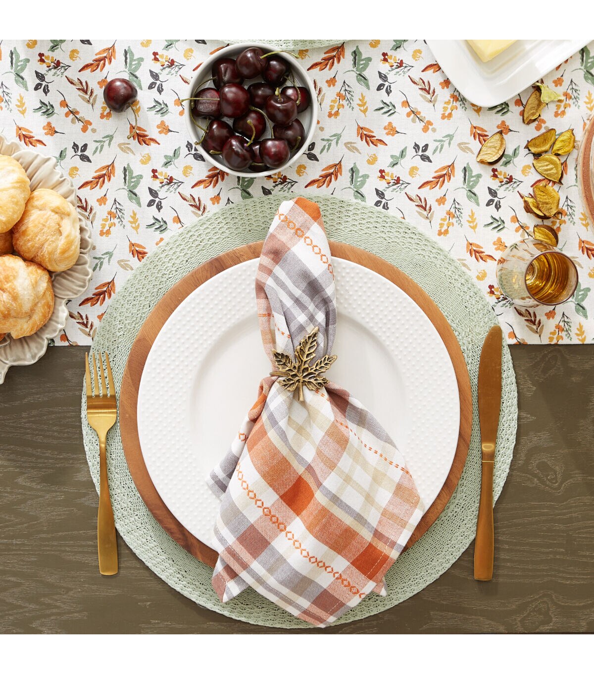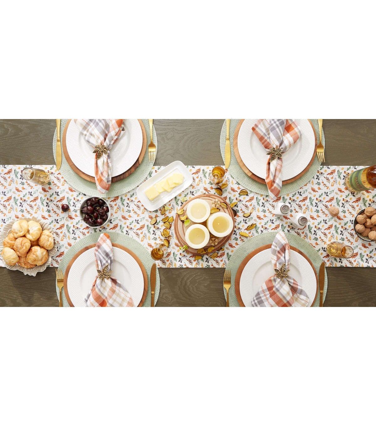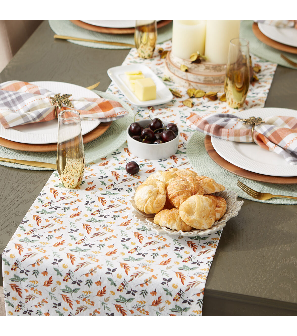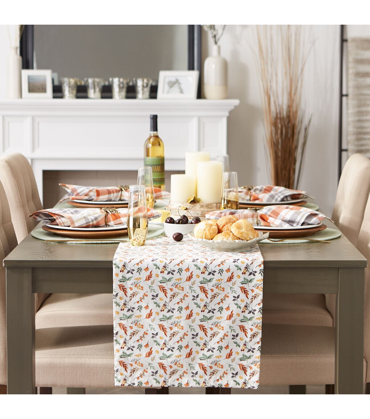 This table runner is 100% cotton and measures 14"x72". Beautiful on it's own or layer with other items from this collection. This table runner is constructed with mitered corners with a 1" hem. The festive Autumn design coordinates with many table settings. Machine wash cold separately. Gentle cycle. Tumble dry low. Low iron. Wash separately before use