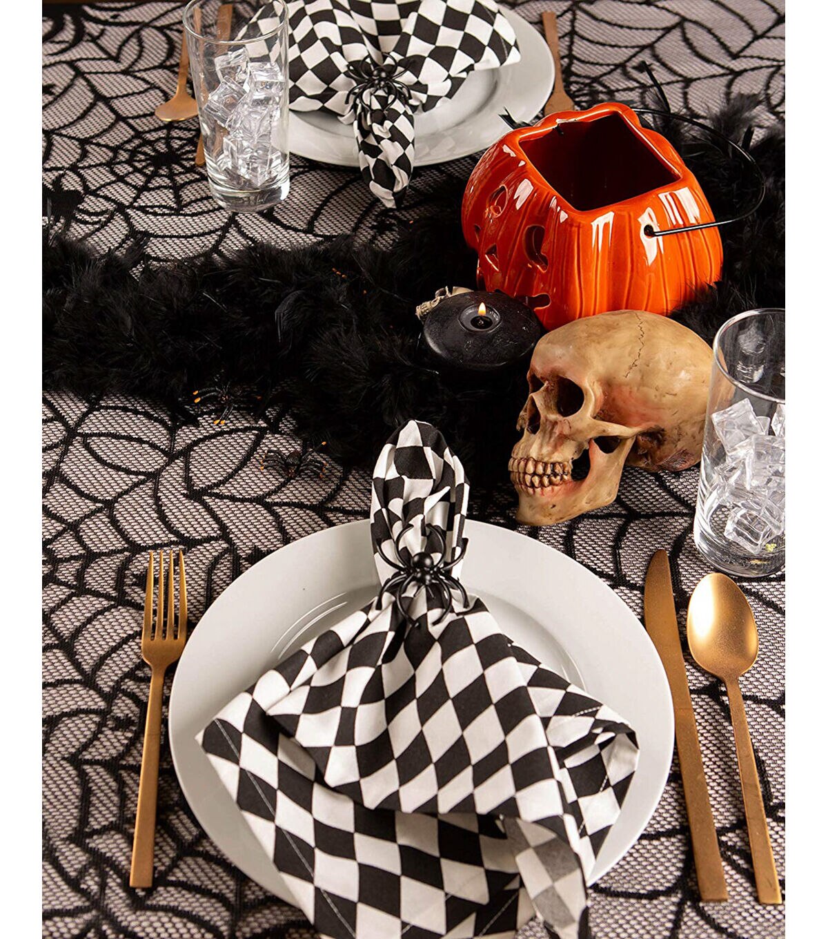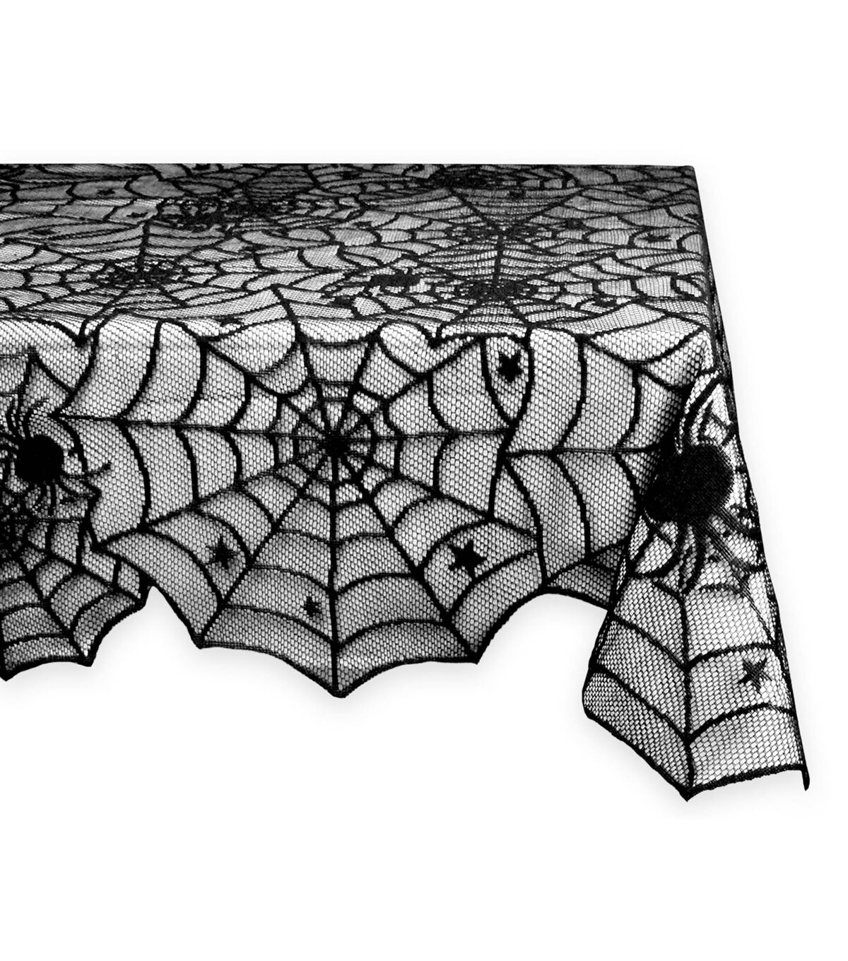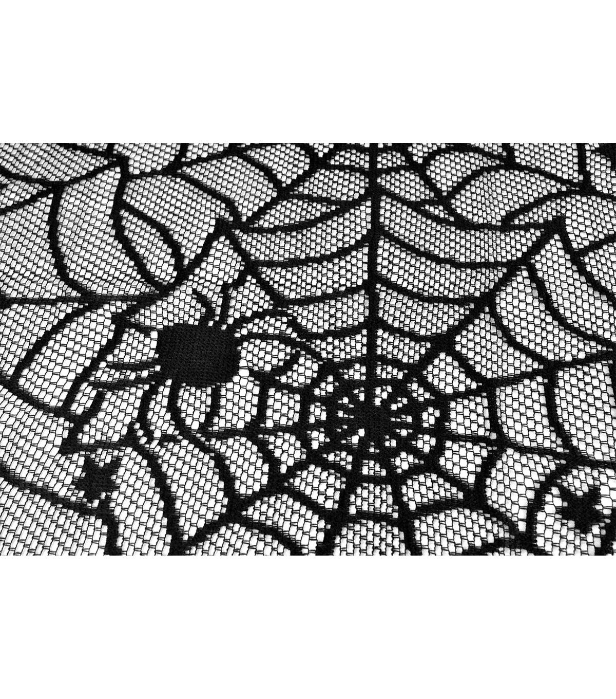 Design Imports Halloween Black Spider Web Lace Tablecloth is 100% polyester. This tablecloth measures 54"x72". Halloween lace tablecloth works great as an overlay for a solid color tablecloth or on its own. Lace tablecloth is a beautiful seamless one piece design. It adds the perfect touch to your table for Halloween dinner, Halloween parties or scary movie nights! Machine washable for easy clean up!