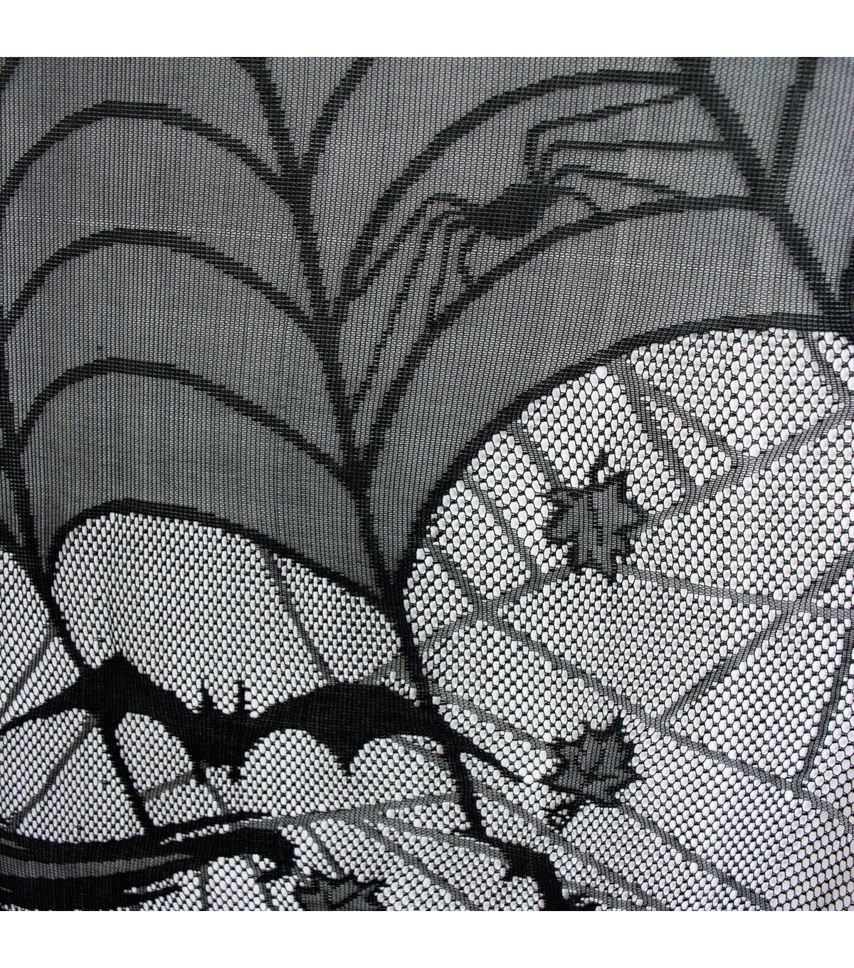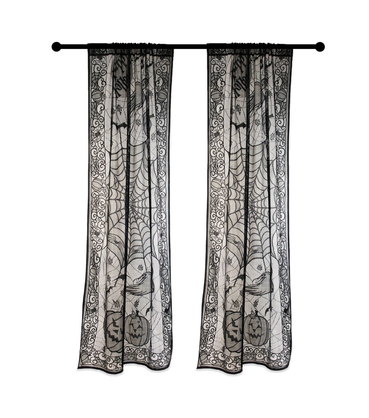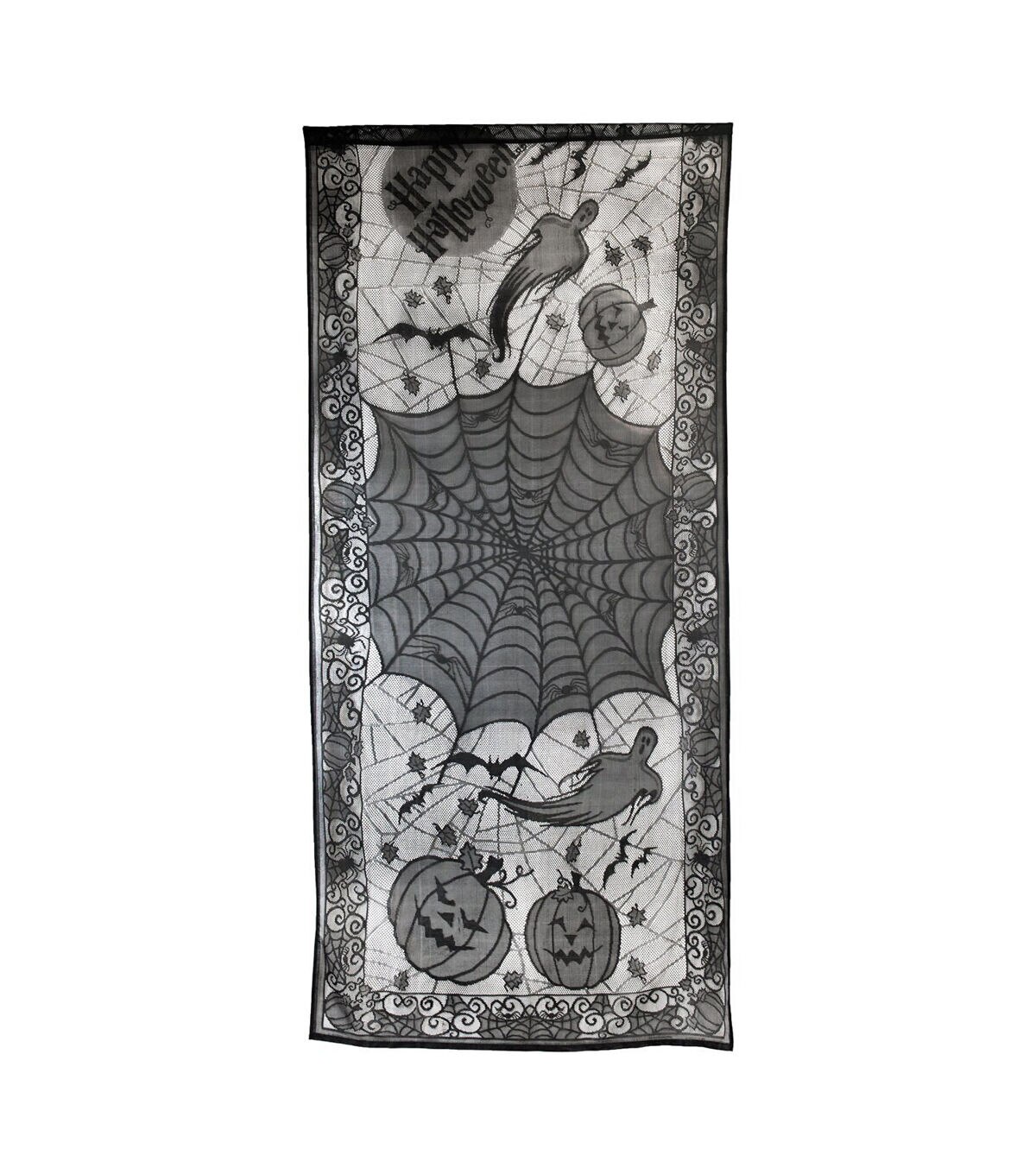 DII Happy Halloween Lace Window Panel - measures 38"x84" - 100% Polyester. Heat cut edges for hem. The top is a turned 3" hem opened at both sides to push a curtain rod thru. Bottom turned hem of Lattice curtain is 2cm. DII’s Halloween Lace Panel is sure to add the perfect spooky touches to your haunted house! Perfect for your front porches, table top, or a wall. Great for a party or for entire month of October!