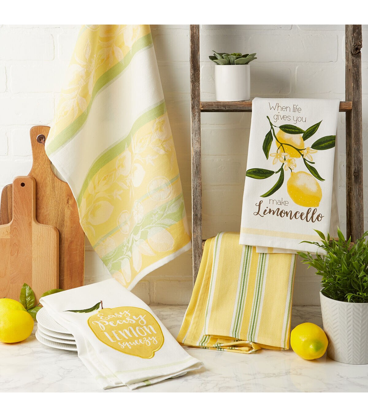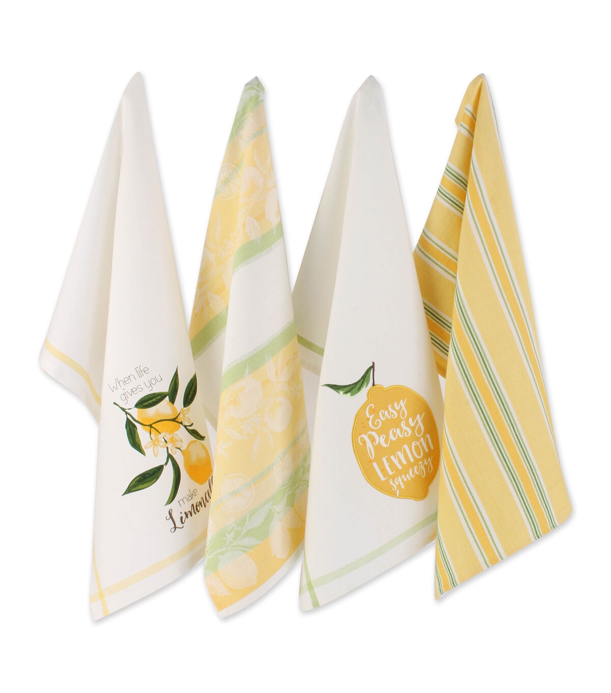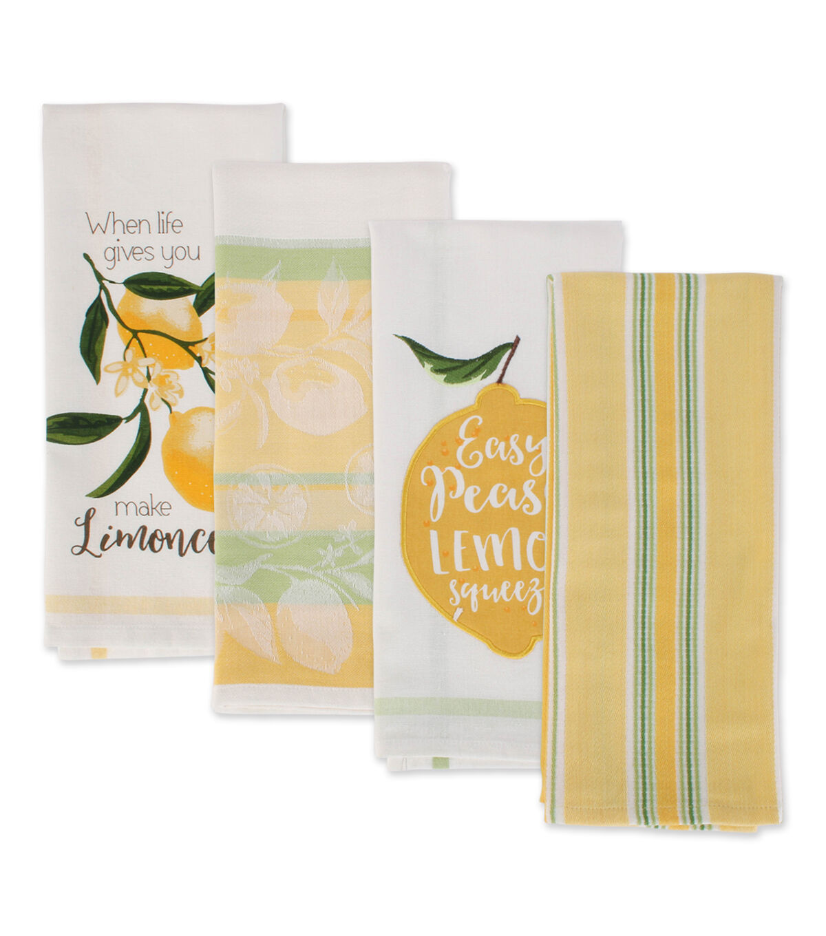 Design Imports Lemon Bliss Embellished Kitchen Towel Set/4 - These 100% cotton Kitchen Towels measure 18"x28". Each set includes 4 coordinating kitchen towels each with a lemon theme, color or message. These towels are certain to brighten up any kitchen or work area. Each towel features a Hanging loop in corner, 3/8" hem . These towels are beautiful as well as ultra-absorbent, durable and handy for mopping up messes in the kitchen or anywhere else a spill may occur. Fast drying towels produce minimal lint and are great for drying dishes and glasses, as well as for general kitchen duty. With each wash, these towels become more absorbent. The material and construction provides long lasting kitchen towels that you can use over and over again. Machine wash cold, gentle cycle, tumble dry low, low iron. For best results remove from dryer before fully dry to minimize shrinkage. Design Imports Lemon Bliss Collection