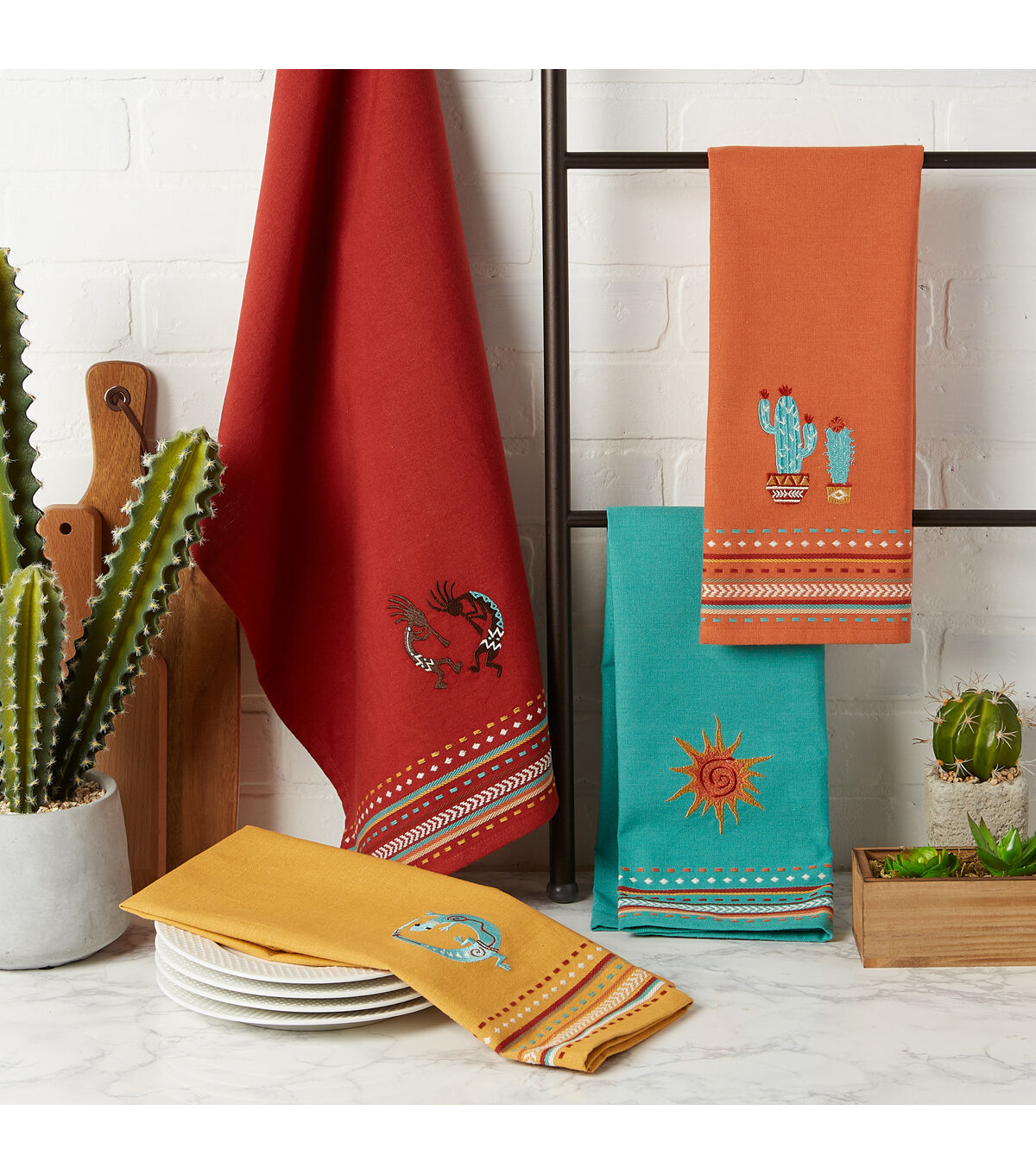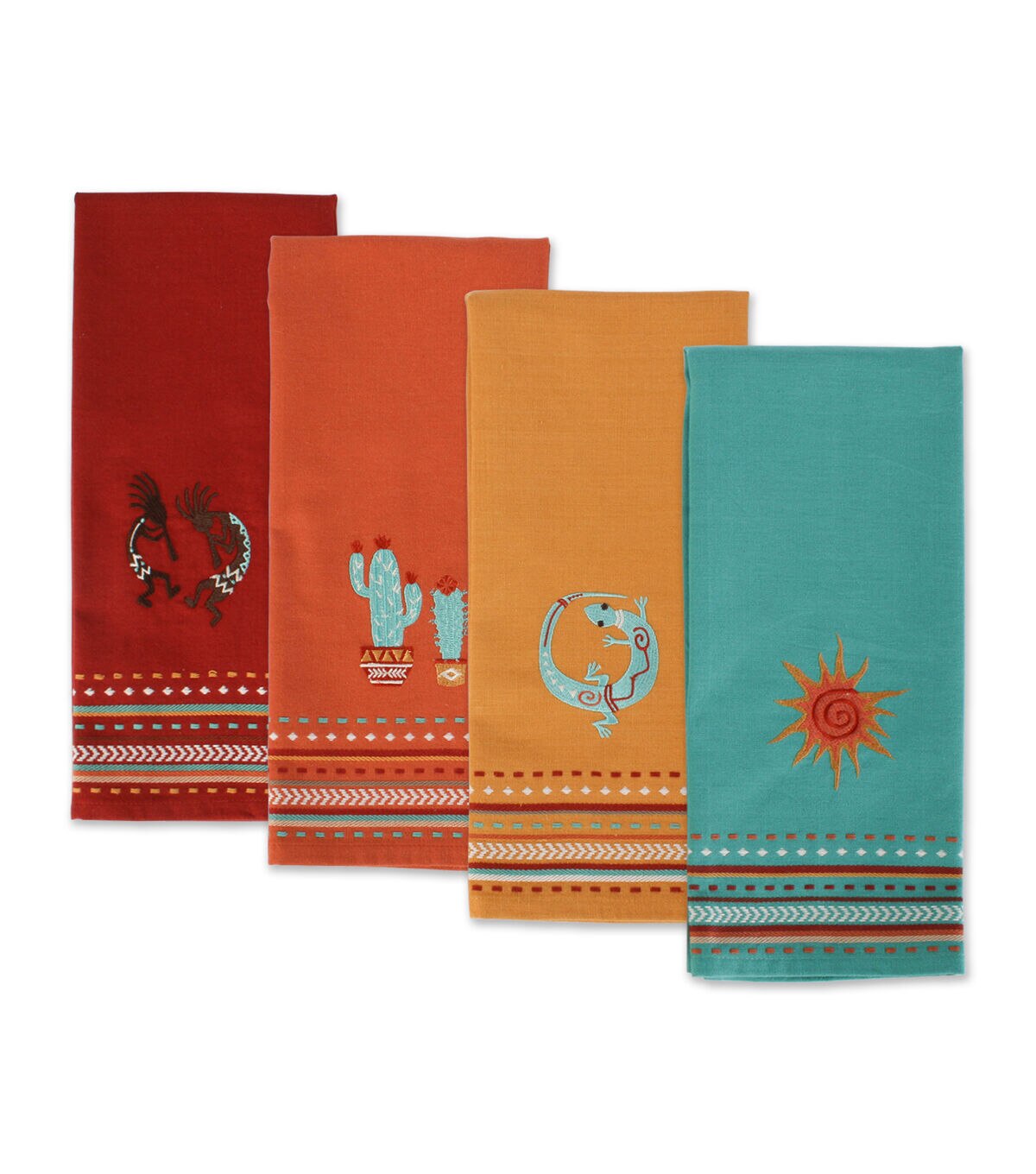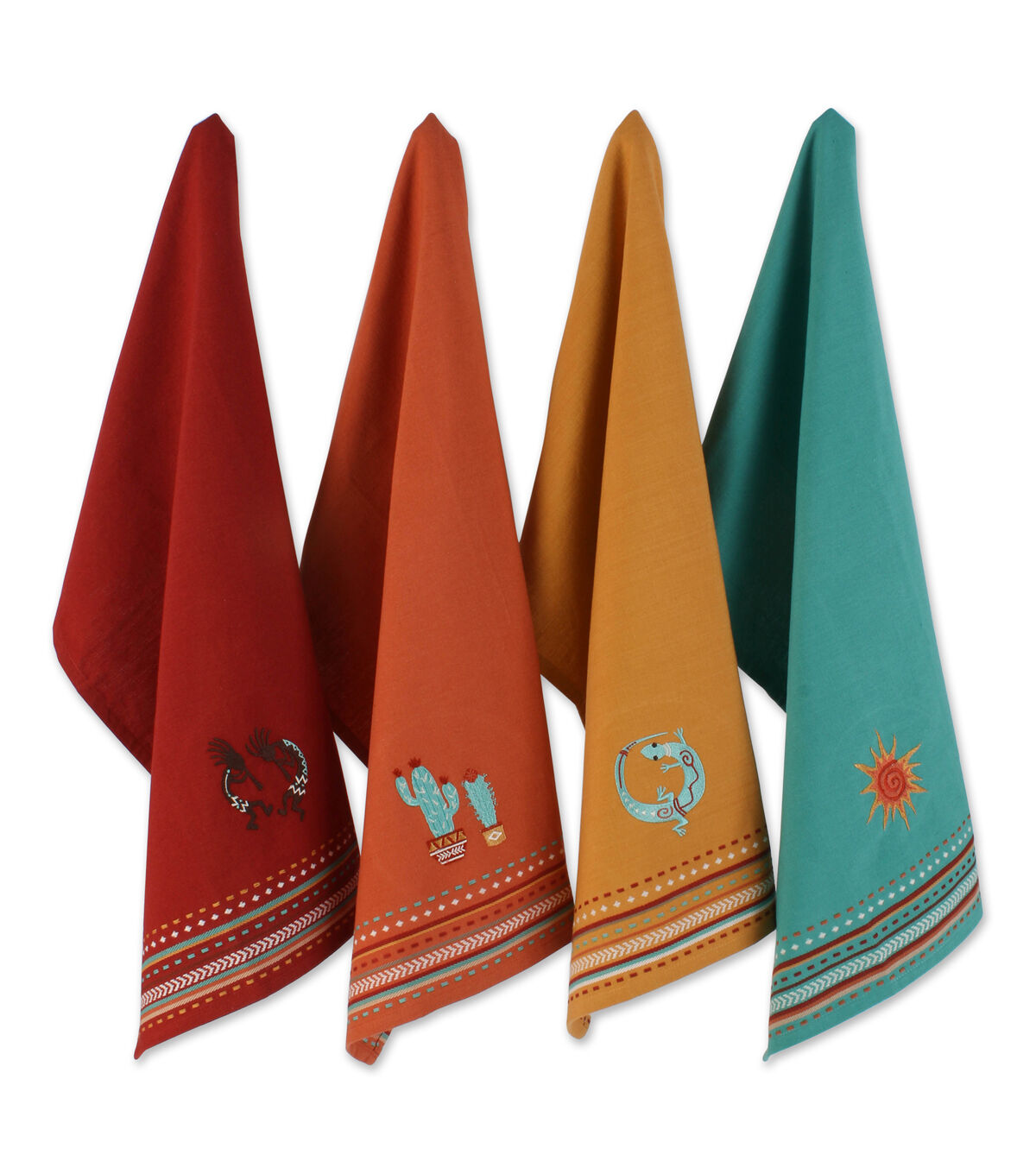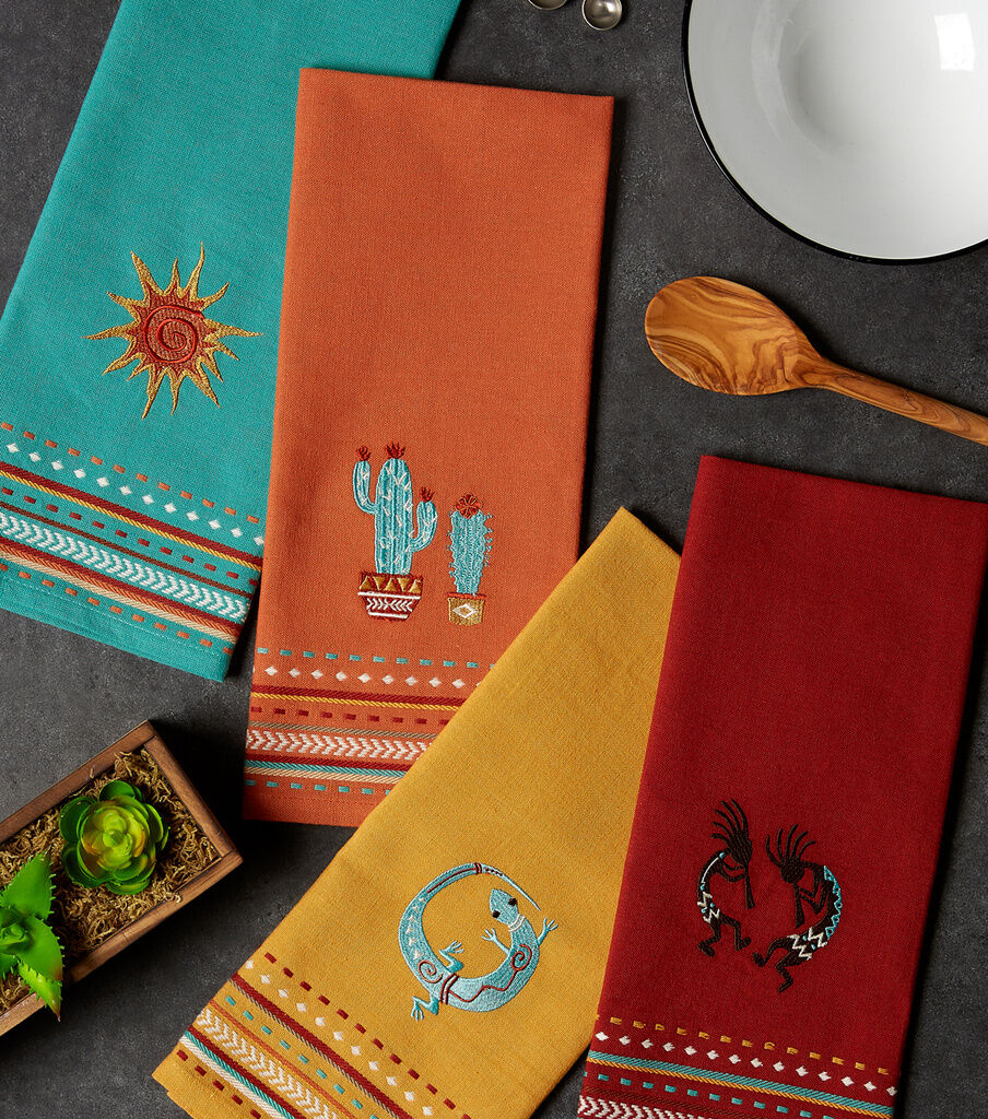 Design Imports Southwest Embellished Kitchen Towel Set/4 - 100% Cotton Kitchen Towels measuring 18x28". Each set includes 4 different kitchen towels each with an embellished emblem indicative of the southwest: Kokopelli, Cactus, Lizard and Sun. Each towel features a Hanging loop in corner and 3/8" hem . These towels are a fun and festive as well as ultra-absorbent, durable and handy for mopping up messes in the kitchen or anywhere else a spill may occur. Fast drying towels produce minimal lint and are great for drying dishes and glasses, as well as for general kitchen duty. With each wash, these towels become more absorbent. The material and construction provides long lasting kitchen towels that you can use over and over again. and embellished with a design to enjoy spring and summer colors. Machine wash cold, gentle cycle, tumble dry low, low iron. For best results remove from dryer before fully dry to minimize shrinkage. Design Imports Southwest Collection