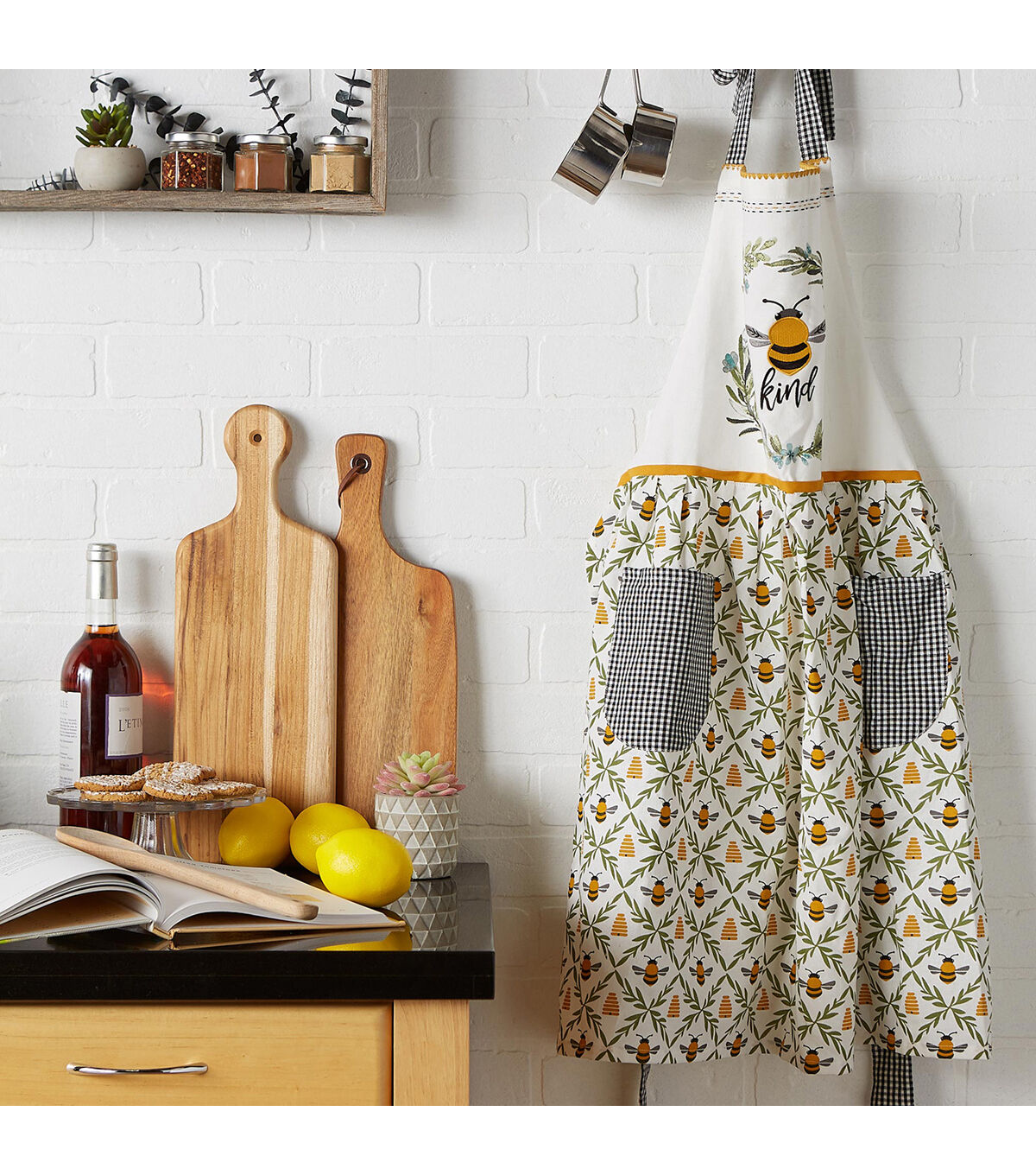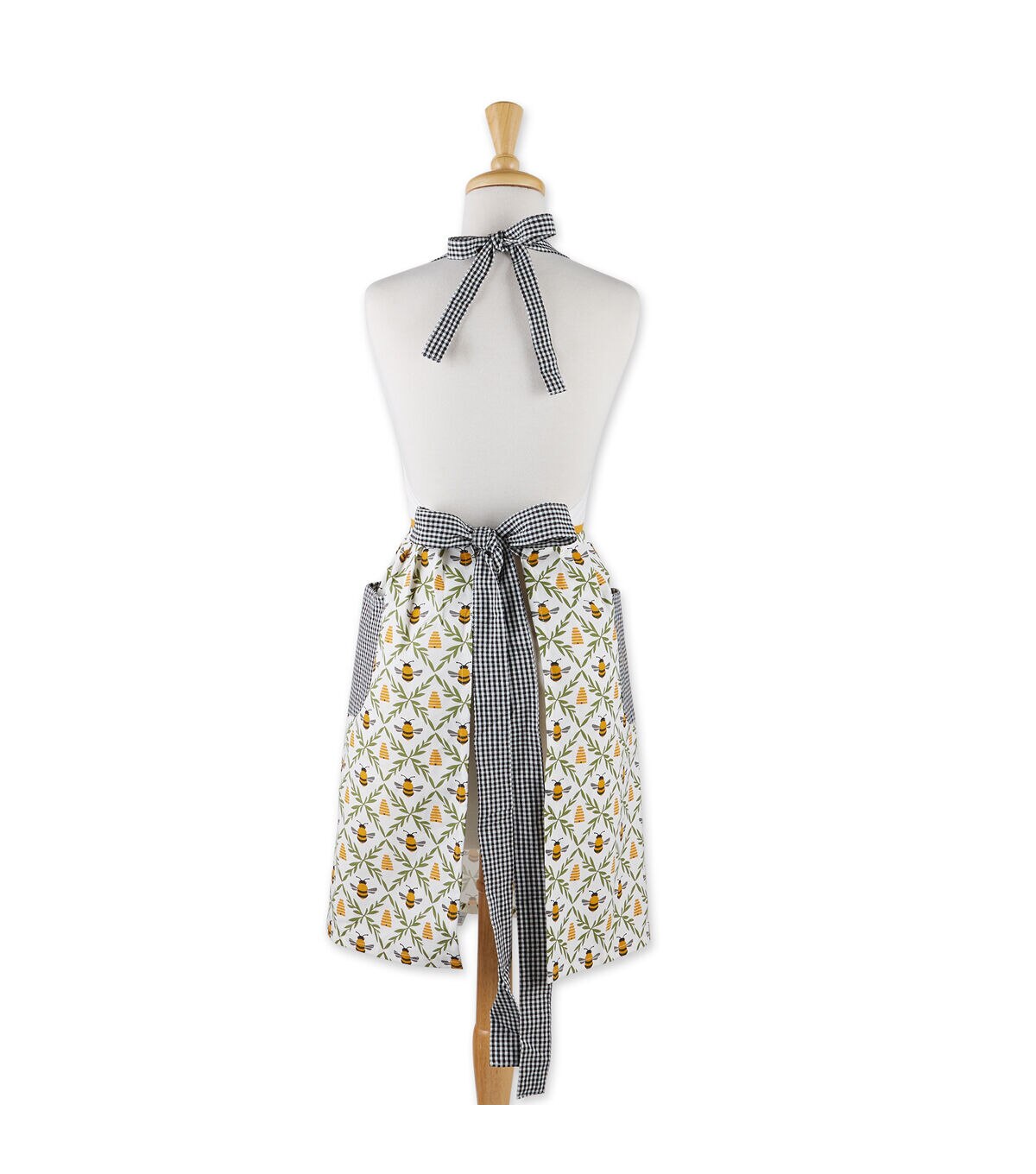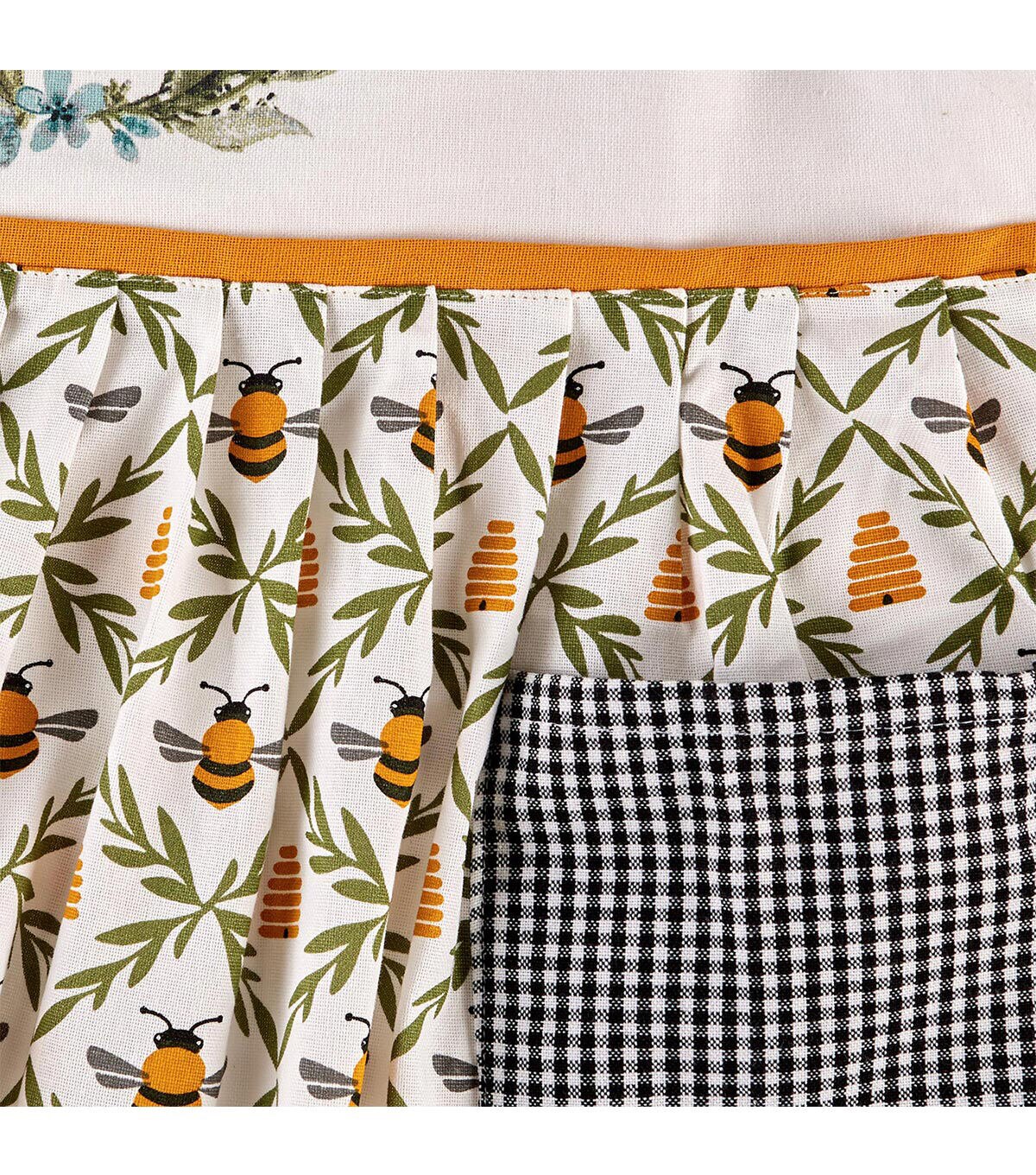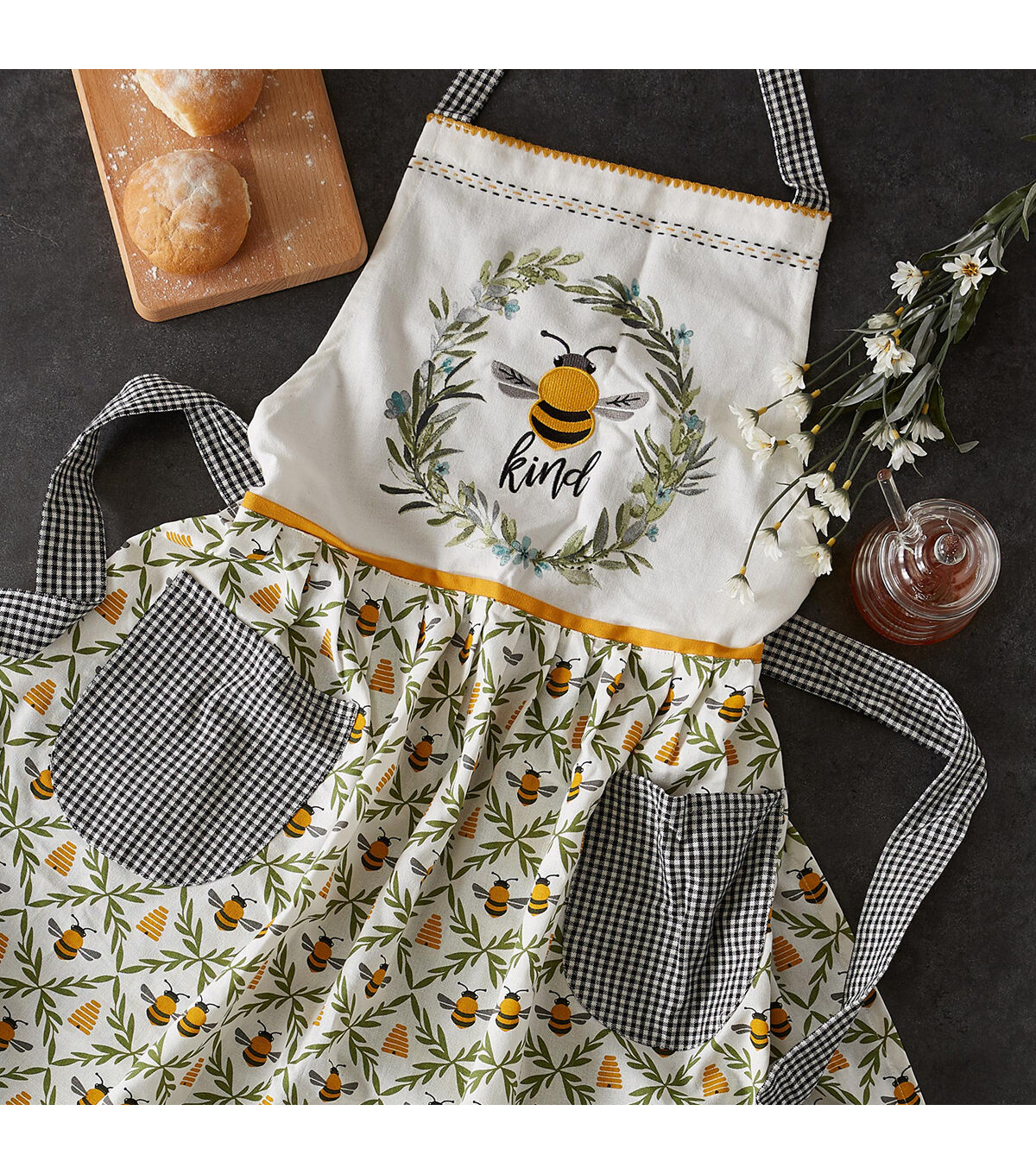 Design Imports Sweet Bee Apron - This apron measures 31"x40" (21.5" at waist). It is 100% cotton. The apron features our embroidered Bee Kind Wreath bib top,gingham neck ties and two pockets, great for keeping cell phone and supplies handy. The perfect apron to wear while preparing for a summer soirée. This apron is "bee"yond cute! An apron is a basic necessity while cooking or baking to protect your clothes from splatters and stains. Machine wash cold separately ,Gentle cycle ,Tumble dry low ,Low iron