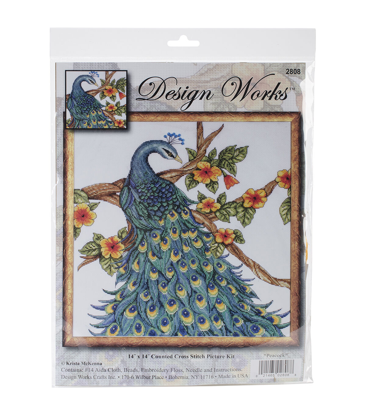 Tobin-Design Works: Counted Cross Stitch Kit. Beautiful designs and top quality materials make Tobin one of the top counted cross stitch kit makers worldwide. This package contains 14-count Aida cloth, beads, embroidery floss, one needle and instructions. Design: Peacock. Finished size: 14x14 inches. Made in USA.