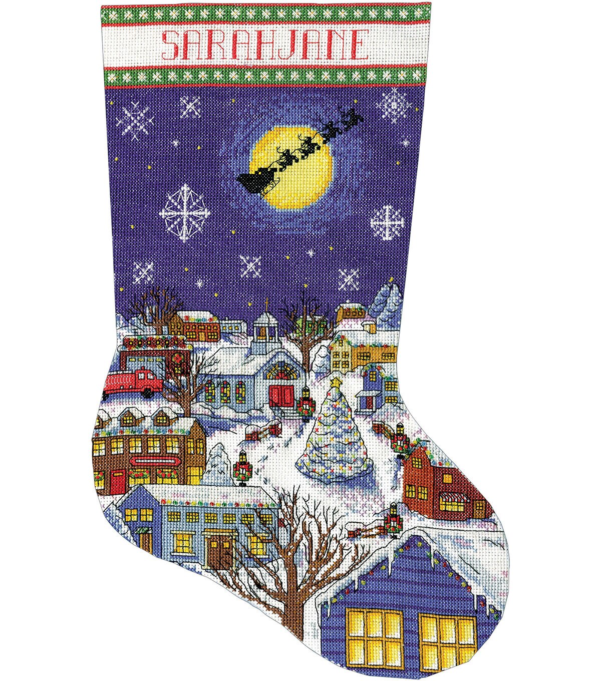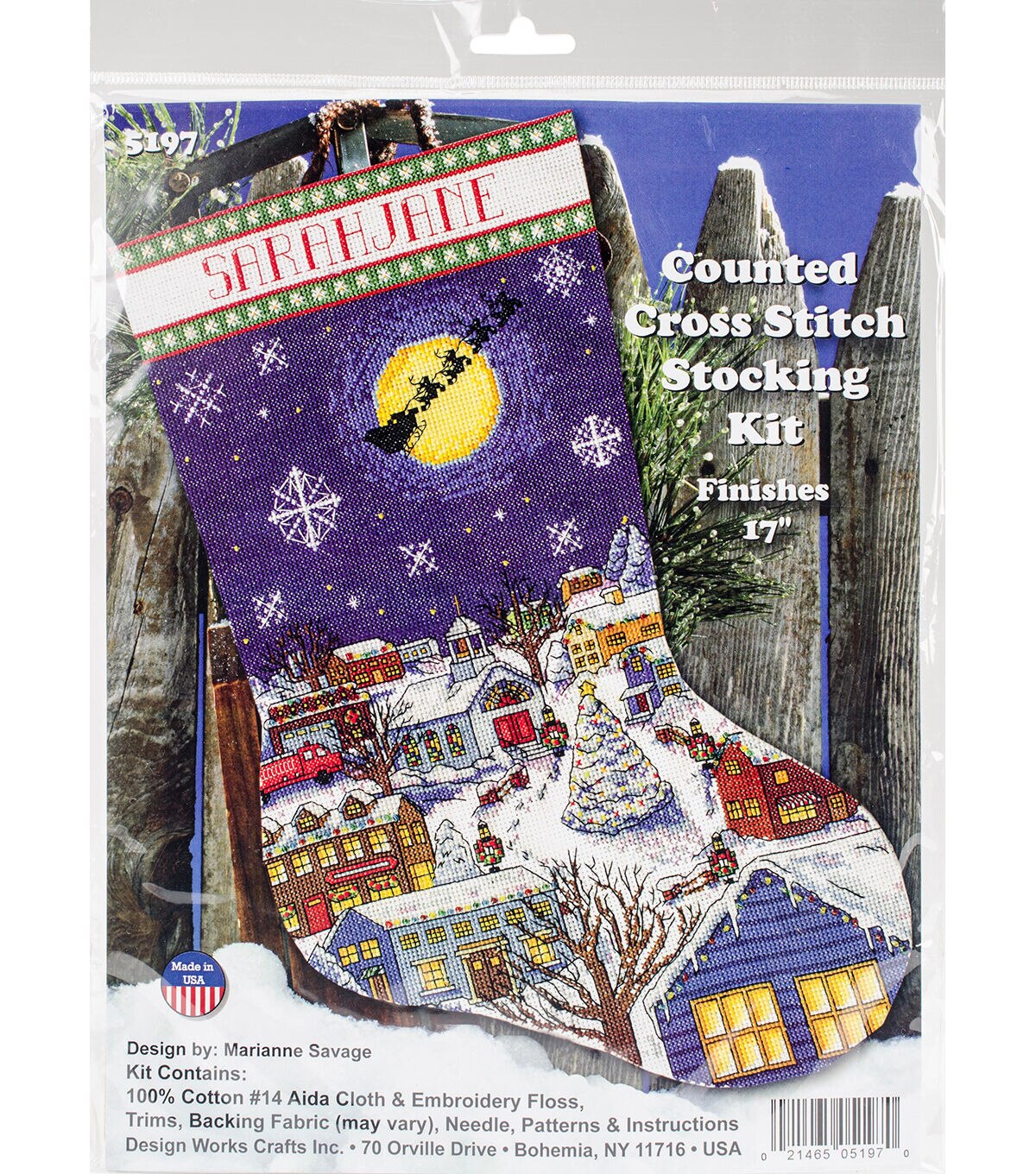 Create a beautiful cross stitch stocking with this kit. This package contains #14 Aida Cloth, embroidery floss, trims, backing fabric, needle, and instructions. Finished size: 17 inches long. Design: Christmas Eve. Made in USA.