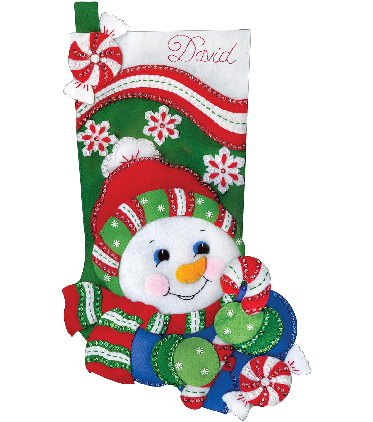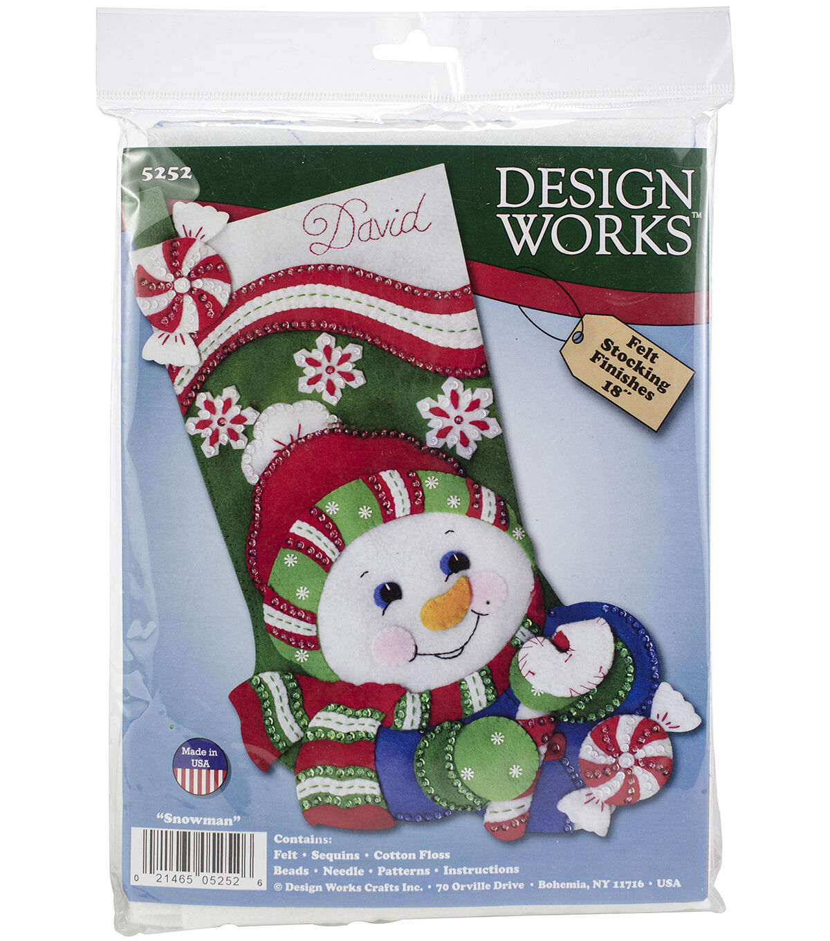Create a cute and festive stocking for your Christmas! This 7.8x10.5x1.6 inch package contains felt, sequins, cotton floss, beads, one needles, patterns, and instructions. Makes one 18 inch felt stocking. Design: Snowman. WARNING: Choking Hazard. Not suitable for children under 3 years. Made in USA.