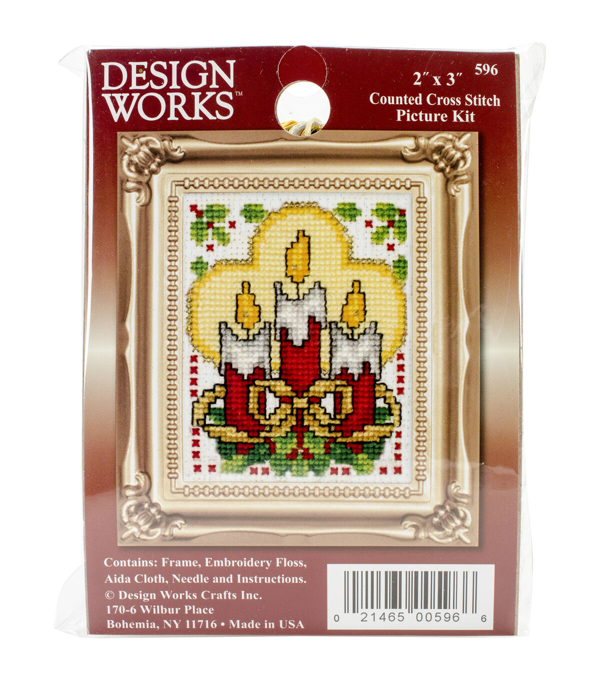 - Includes one frame, embroidery floss, aida cloth, one needle and instructions