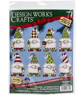 Beautiful designs and top-quality materials make Design Works one of the top cross stitch kit makers worldwide. This package contains 14-count plastic canvas, 100% cotton embroidery floss, one needle and fully illustrated instructions. Finished Size: Eight 2.25x4 inch ornaments. Design: Gnome. Made in USA.
