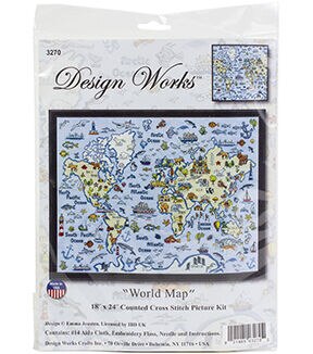 Beautiful designs and top quality materials make Design Works one of the top cross stitch kit makers worldwide. This package contains 14 count Aida, 100% cotton embroidery floss, one needle and fully illustrated chart and instructions. Finished Size: 18x24 inches. Design: World Map. Made in USA.