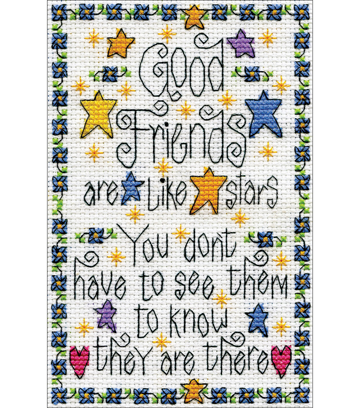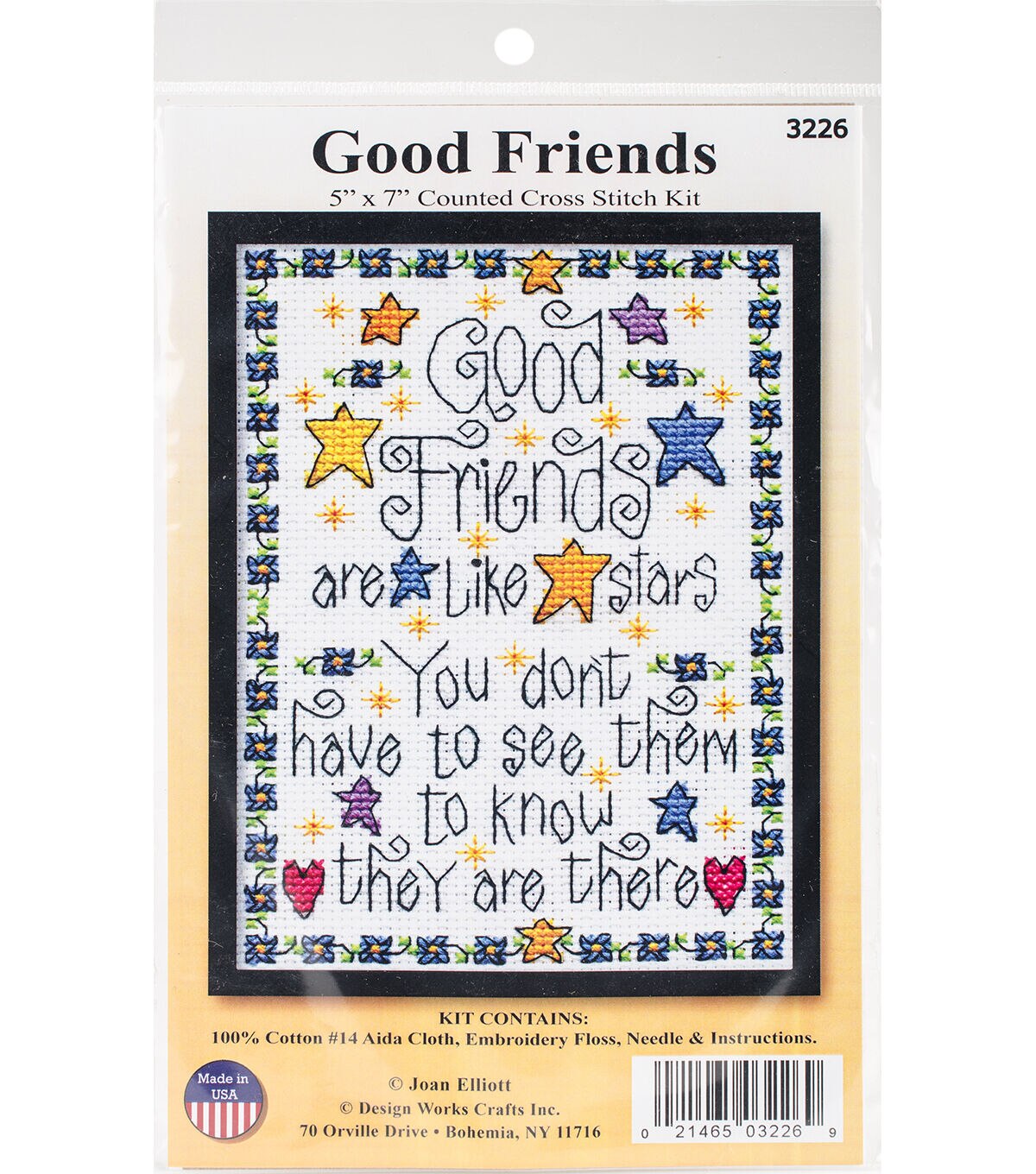 Beautiful designs and top quality materials make Tobin one of the top cross stitch kit makers worldwide. This package contains 14-count white Aida cloth, embroidery floss, one needle and instructions. Design: Good Friends. Finished size: 5x7 inches. Made in USA.