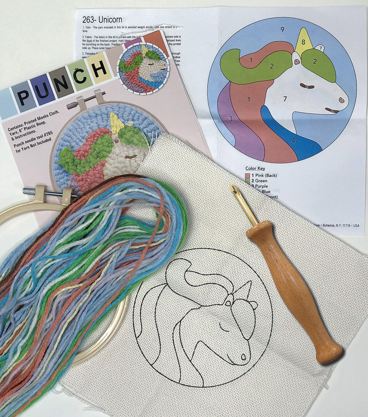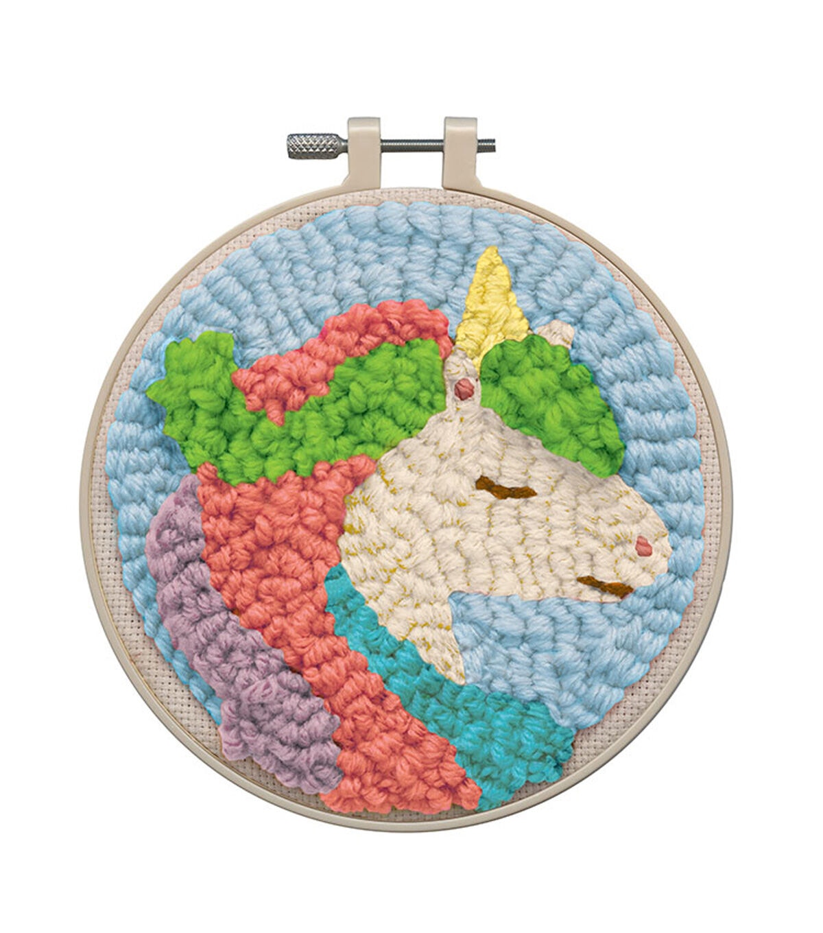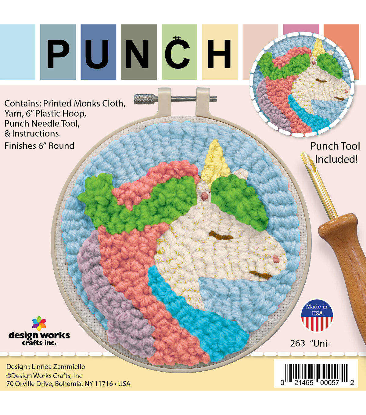 Unicorn 6 Inch Punch Needle Kit Made by Design Works Crafts, the leading manufacturer of needlework kits in the USA, this Punch Needle Kit includes a wood handle punch tool, all yarn and fabric needed to stitch this beautiful design in a 6 inch embroidery hoop.