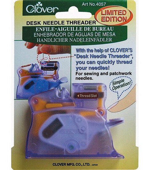 Clover Desk Needle Threader is the ultimate threader! Simply drop your needle in (any needle except tiny quilt petites), rest your thread in the slot, press the button and you will have your pre-threaded needle! Ideal for difficult to thread floss and met