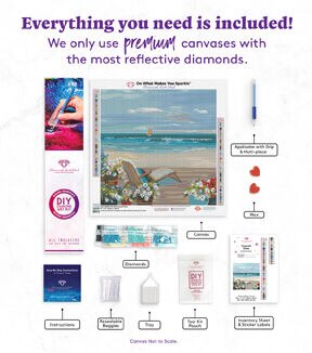 Relax by the water’s edge, surrounded by overflowing pots of flowers and the sounds of the sea. Dip your toes into an ocean of crystal-clear aquas and feel the breeze from a frothy, baby-blue sky. Diamond Art Club manufacturers the highest quality diamond art painting kits in the world today. Like a combination of cross-stitch and paint-by-numbers, diamond art painting is the new creative hobby that’s taking the crafting world by storm. No experience is necessary. You simply apply colorful resin rhinestones to richly-pigmented canvas paintings to create visually dazzling, mosaic diamond artworks that sparkle, shimmer and shine. Each Diamond Art Club kit includes everything you need to get started: our patented premium-quality canvas, extra-faceted reflective resin rhinestone diamonds, an applicator tool with soft grip and multi-placer, a crafting tray, two wax pads, resealable baggies, sticker labels, and a simple how-to instructions. Each kit comes with a lifetime warranty and accidental insurance. We hope you enjoy Diamond Art Club® and our labor of love.