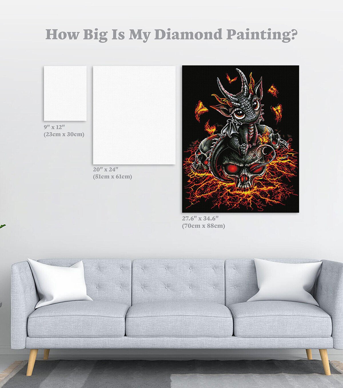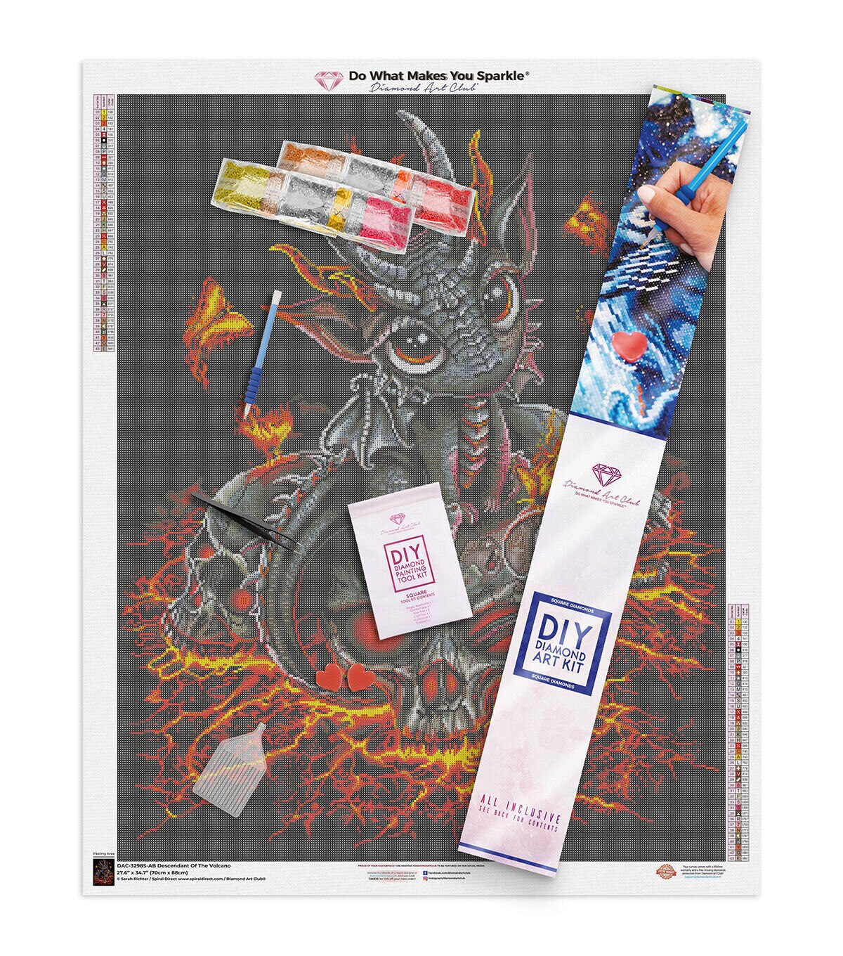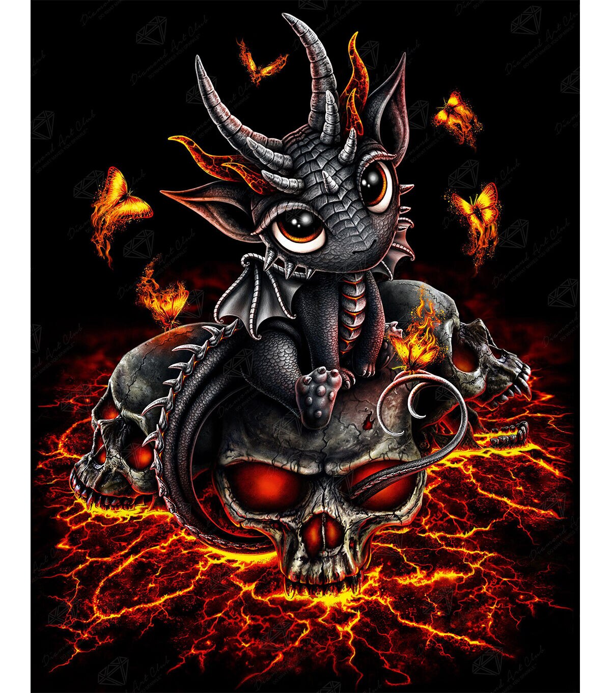 Step inside the caverns of eternal suffering to find an amazingly, adorable creature who has sprung from the ashes of death. Surrounded by flaming butterflies, symbolic of re-birth - its glowing ochre eyes, silvery horns and shimmering scales, inspire admiration and kindness. Even amongst the most devilish of places, life endures. Diamond Art Club® manufactures the highest quality diamond art painting kits in the world today. Like a combination of cross-stitch and paint-by-numbers, diamond art painting is the new creative hobby that’s taking the crafting world by storm. No experience is necessary. You simply apply colorful resin rhinestones to richly-pigmented canvas paintings to create visually dazzling, mosaic diamond artworks that sparkle, shimmer and shine. Each Diamond Art Club® kit includes everything you need to get started: our patented premium-quality canvas, extra-faceted reflective resin rhinestone diamonds, an applicator tool with soft grip, a crafting tray, tweezers, paddy wax, and simple how-to instructions. Each kit comes with a lifetime warranty and accidental insurance. We hope you enjoy Diamond Art Club® and our labor of love.