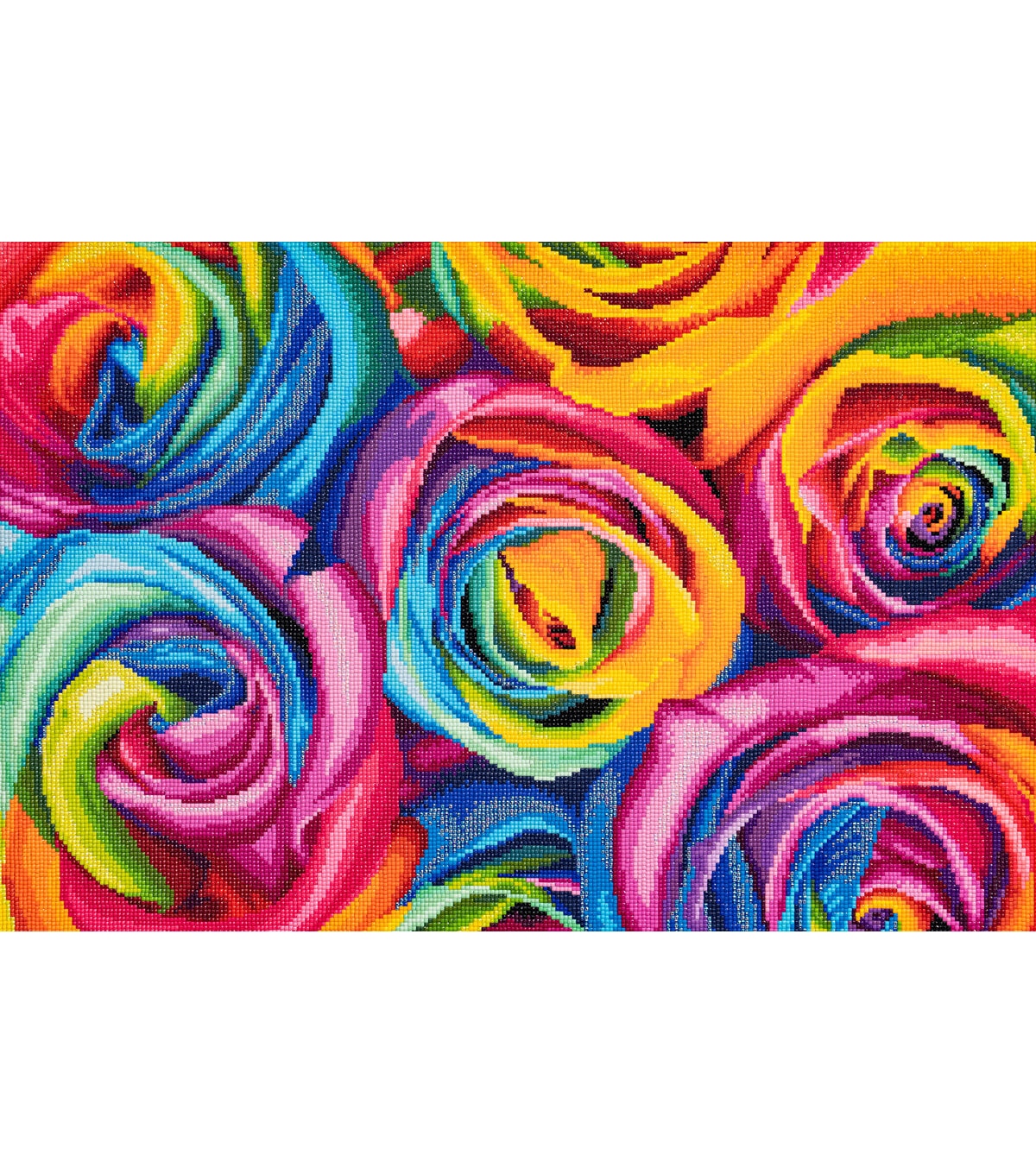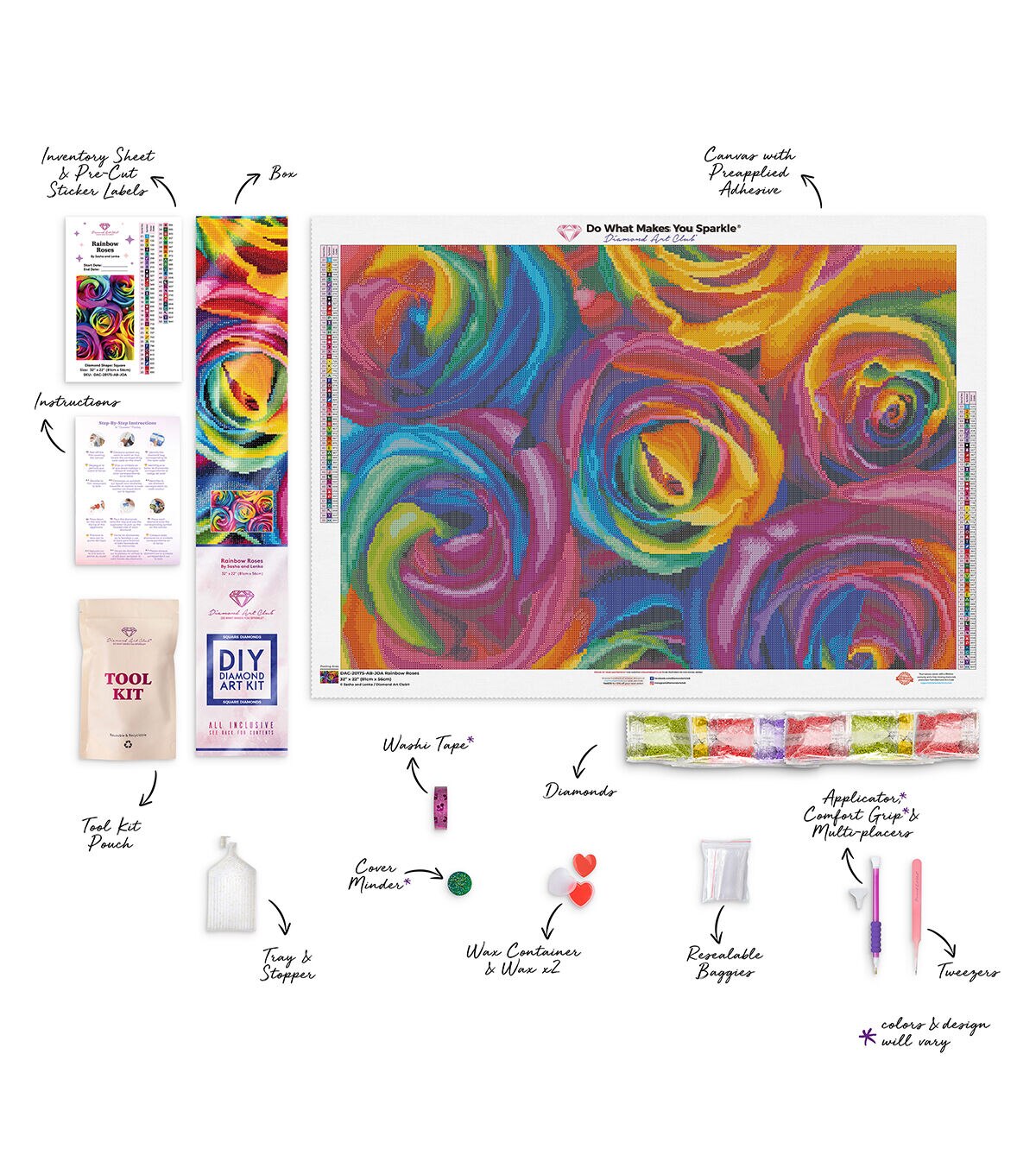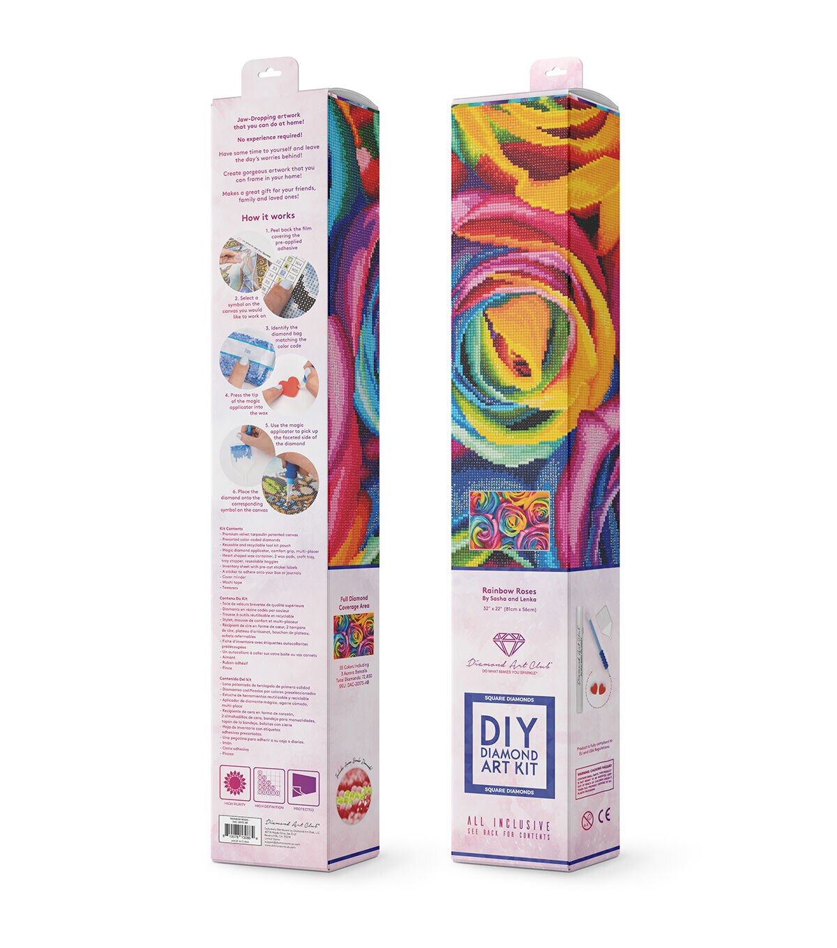 Savor the deep, intoxicating aroma of roses, just come into flower and bid goodbye to tension as you methodically bring their velvety textures to shimmering life. Go in close for an intriguing look at this dazzling kaleidoscope of petals curling into one another in soft, sweet embraces. Diamond Art Club manufacturers the highest quality diamond art painting kits in the world today. Like a combination of cross-stitch and paint-by-numbers, diamond art painting is the new creative hobby that’s taking the crafting world by storm. No experience is necessary. You simply apply colorful resin diamonds to richly-pigmented canvas paintings to create visually dazzling, mosaic diamond artworks that sparkle, shimmer and shine. Each Diamond Art Club kit includes everything you need to get started: our patented premium-quality canvas, extra-faceted reflective resin diamonds, an applicator tool with comfort grip and multi-placers, tweezers, a crafting tray with stopper, a cover minder, a roll of washi tape, 2 wax pads with heart container, a tool kit pouch, simple how-to instructions, resealable baggies, and pre-cut sticker labels. Each kit comes with a lifetime warranty and accidental insurance. We hope you enjoy Diamond Art Club and our labor of love.