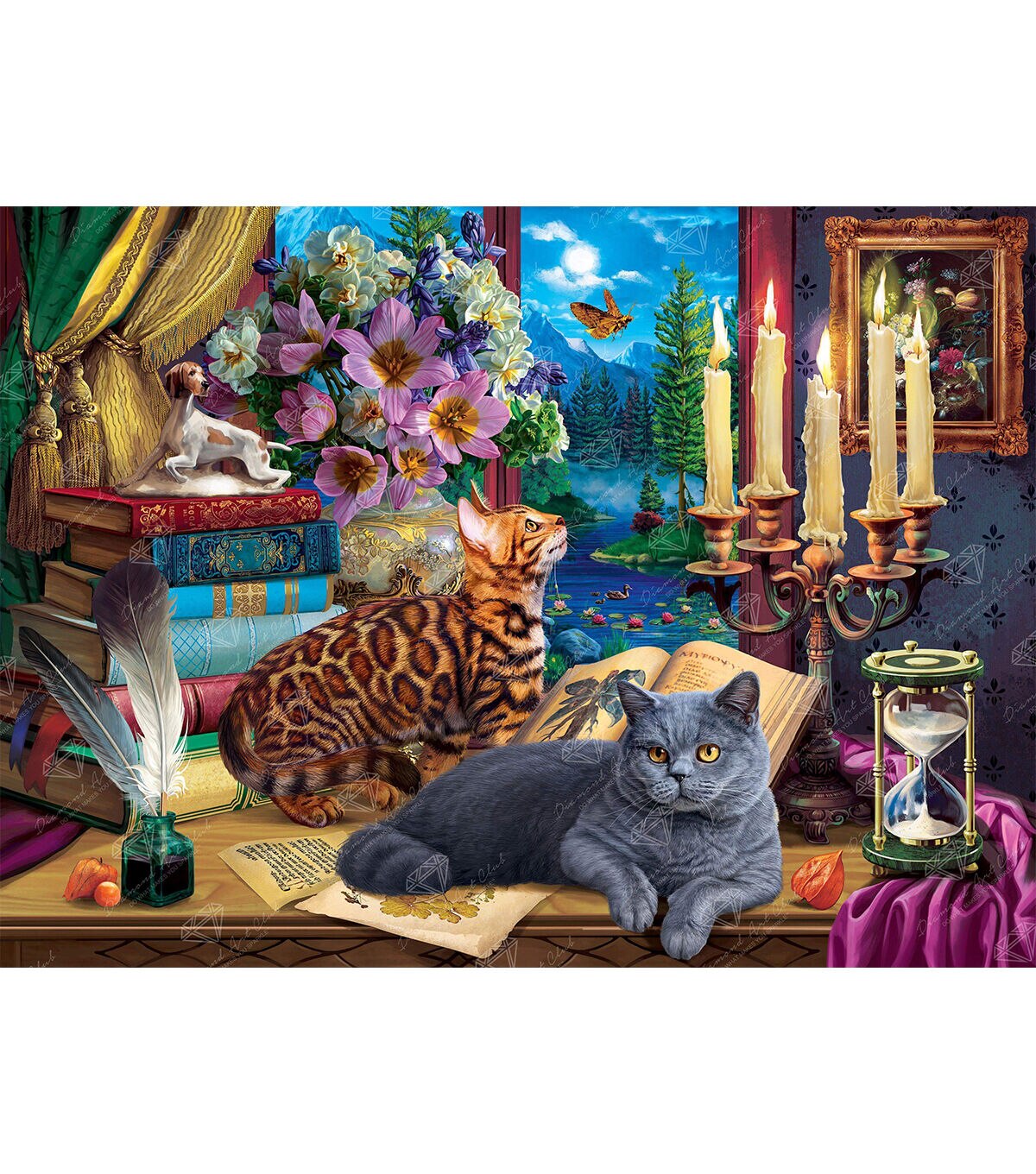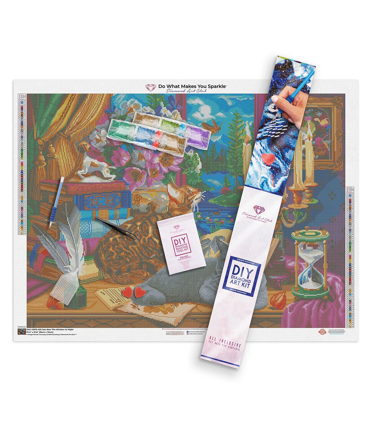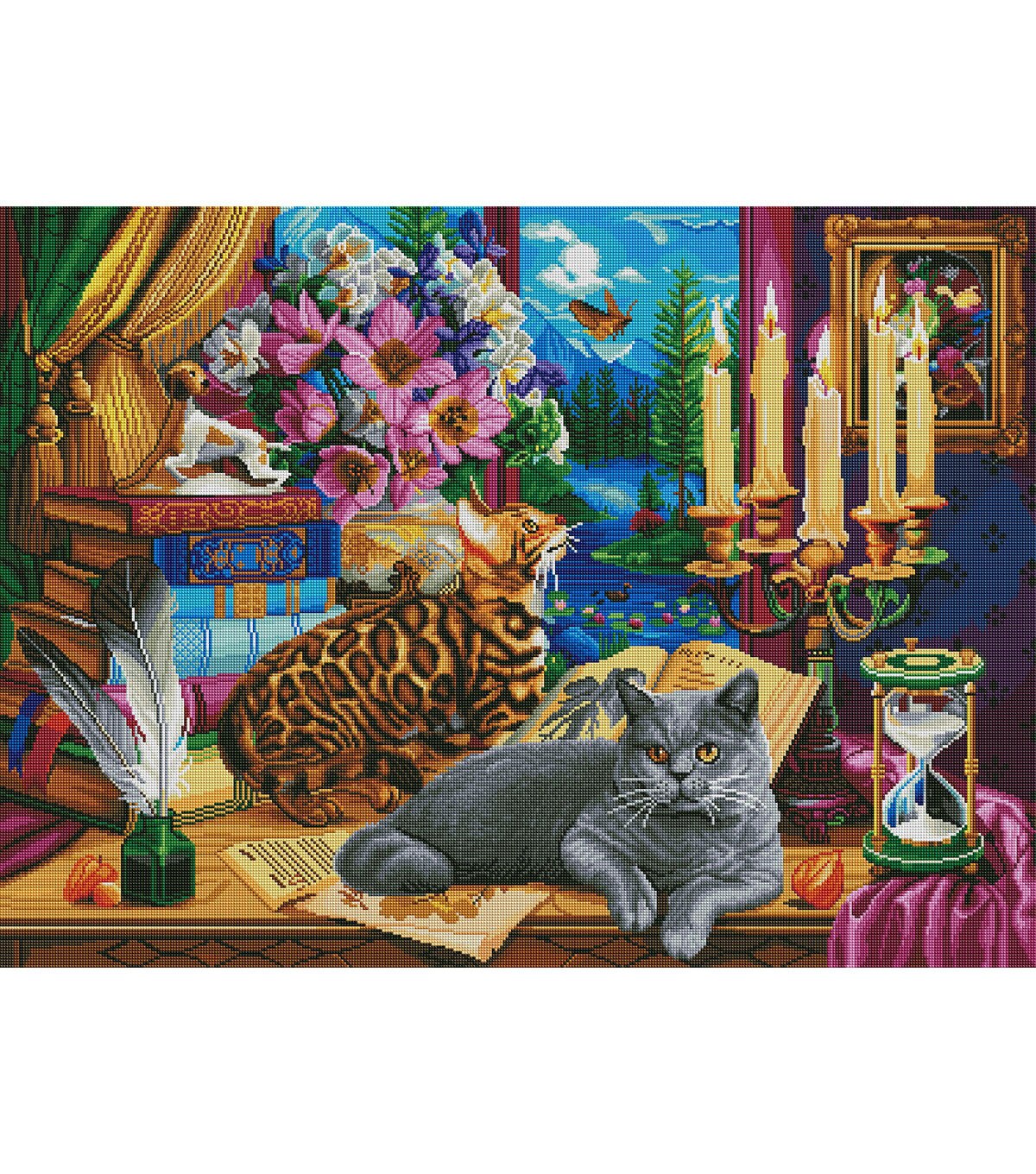 Capture the charmed life of an indoor cat in this beautiful painting where landscape meets decor. Pursue a fluttering moth in the flickering candlelight, contemplate the sand slowly trickling through an hourglass, or, perhaps, you'll simply decide to knock something off your perch just because you can. Diamond Art Club® manufactures the highest quality diamond art painting kits in the world today. Like a combination of cross-stitch and paint-by-numbers, diamond art painting is the new creative hobby that’s taking the crafting world by storm. No experience is necessary. You simply apply colorful resin rhinestones to richly-pigmented canvas paintings to create visually dazzling, mosaic diamond artworks that sparkle, shimmer and shine. Each Diamond Art Club® kit includes everything you need to get started: our patented premium-quality canvas, extra-faceted reflective resin rhinestone diamonds, an applicator tool with soft grip, a crafting tray, tweezers, paddy wax, and simple how-to instructions. Each kit comes with a lifetime warranty and accidental insurance. We hope you enjoy Diamond Art Club® and our labor of love.