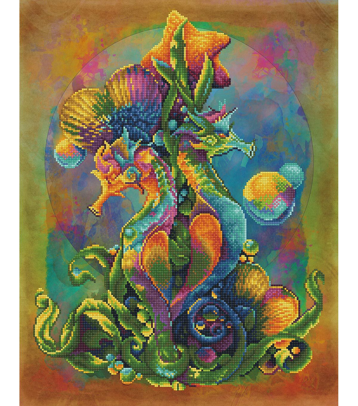 Quick, easy and fun to do! Just use the Diamond Dotz Stylus to pick up a dot and place it onto the matching square on the sticky print. This package contains one 23.6x29.1 inch piece of high quality colors printed fabric, Diamond Dotz, one stylus, one craft tray, one wax caddy and multi-lingual instructions. Design: Sea Horses. Design Size: 20.5x26 inches. Imported.