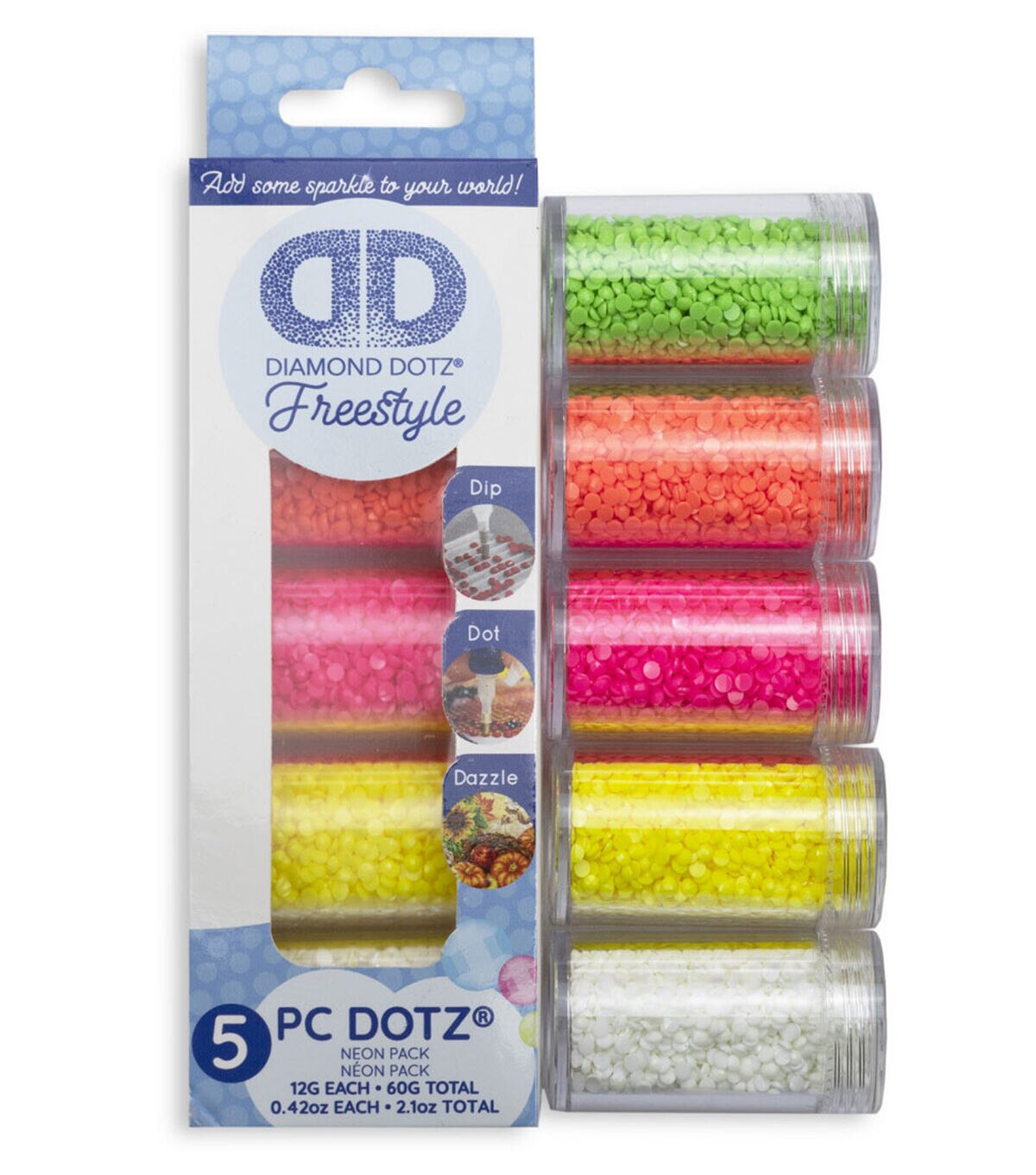 The perfect try me dotz® sampler 5 pack in your favorite neon colors. Also includes glow-in-the-dark dotz®