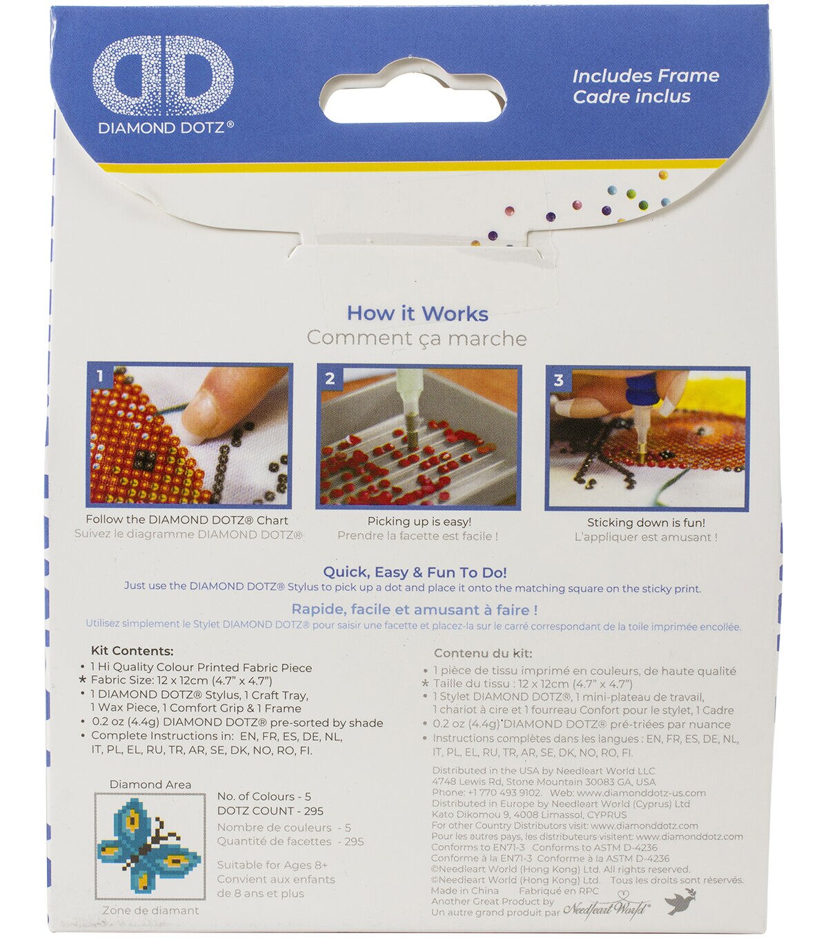 Diamond Dotz is a phenomenal new craft that is quick, easy and fun to do. Your design is created with Diamond like facets that shimmer in the light. Using the Diamond Dotz stylus, simply pick up a facet and place it onto the sticky design surface. Nothing can prepare you for the spectacular sparkling result of your finished project! This package contains one high-quality piece of color printed fabric, one Diamond Dotz stylus, one craft tray, .2oz of pre-sorted Diamond Dotz and instructions. Design: Butterfly Sparkle. Design size: 3x3 inches. Imported.