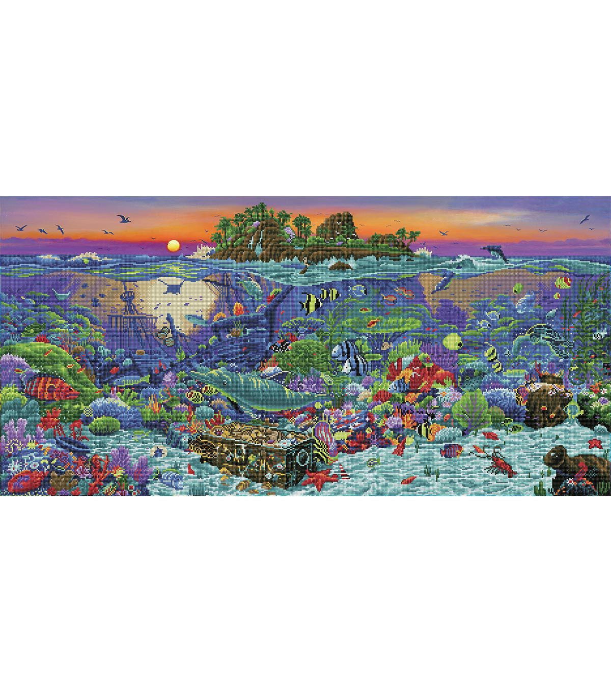 Quick, easy and fun to do! Just use the Diamond Dotz Stylus to pick up a dot and place it onto the matching square on the sticky print. This package contains one piece of high quality colors printed fabric, Diamond Dotz, one stylus, one craft tray, one wax caddy and multi-lingual instructions. Design: Coral Reef Island. Design Size: 52x25.6 inches. Imported.