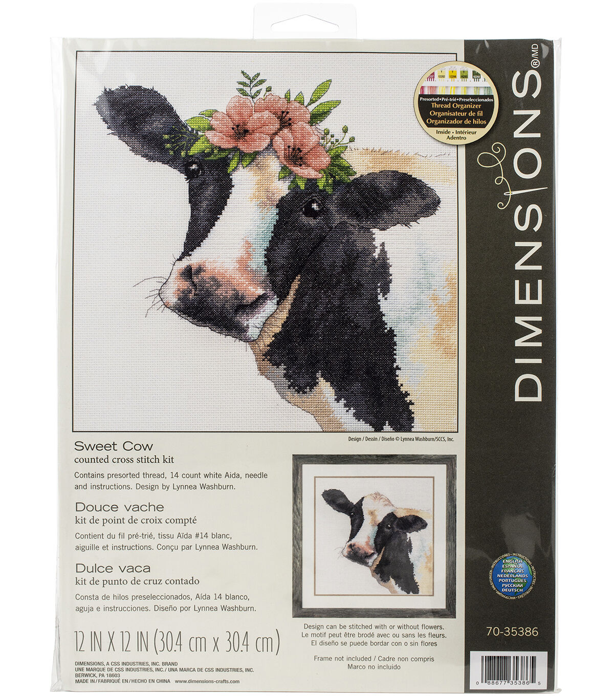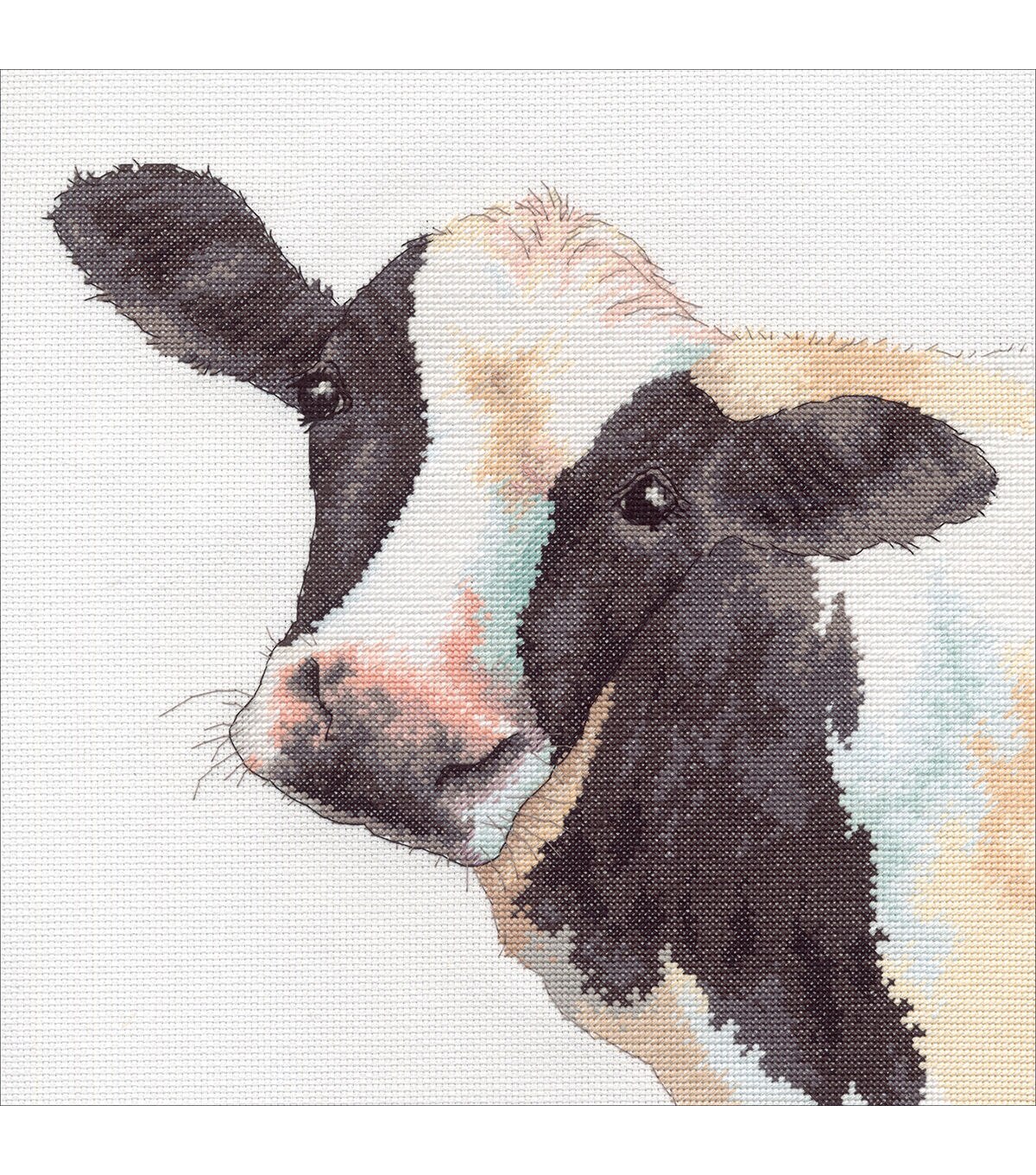Dress up your home with one of Dimensions creative kits. This kit contains 14 count white Aida, cotton thread, thread palette, needle and easy to follow instructions. Mat and frame are not included. Finished size: 12x12 inches. Design: Sweet Cow. Designer: Lynnea Washburn. Imported.