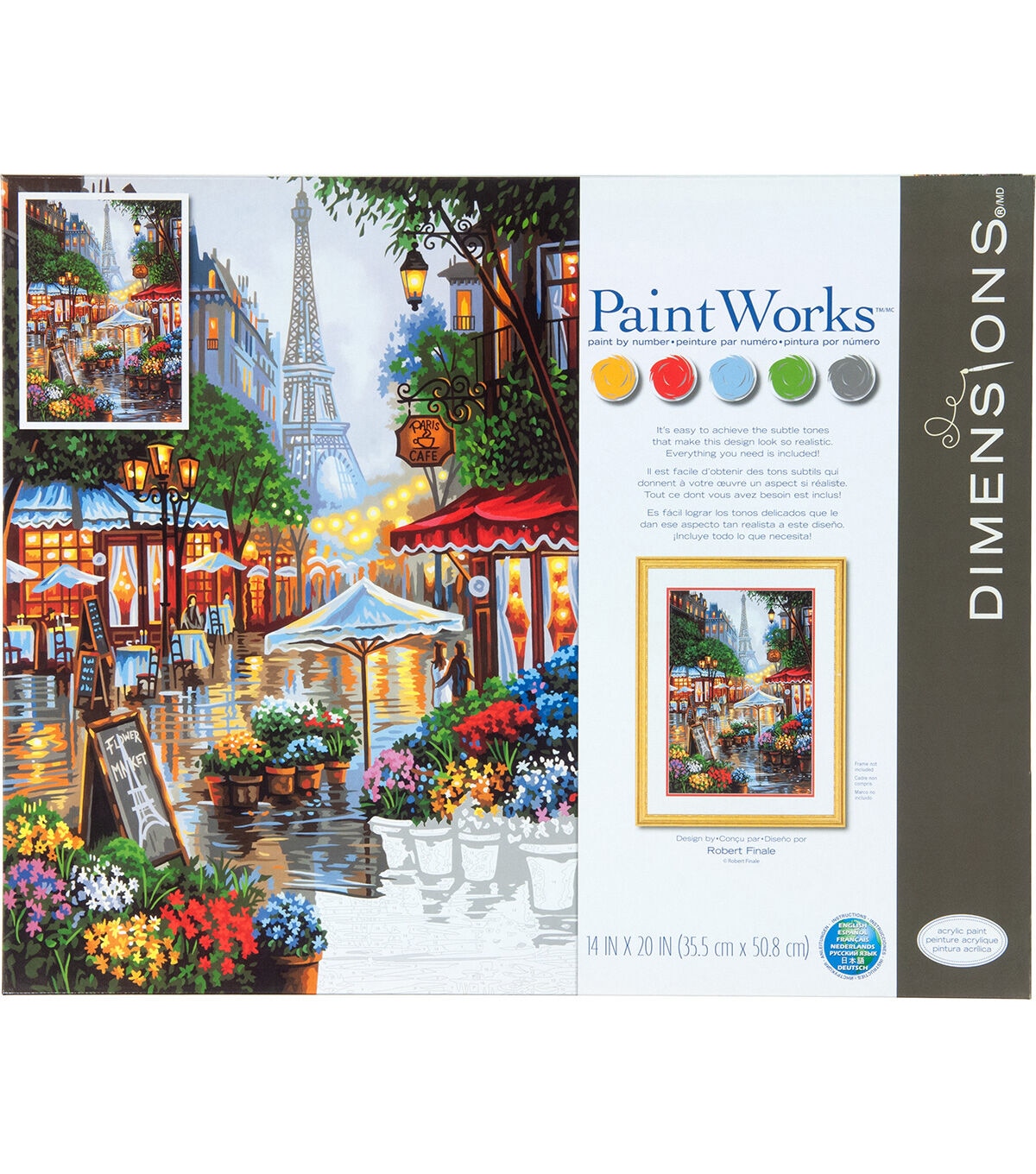 Imagine yourself walking among the cafés and floral shops of a quaint street in Paris as you paint this charming scene. Springtime in Paris from PaintWorks is created with easy-to-use acrylic paints. © Robert Finale.