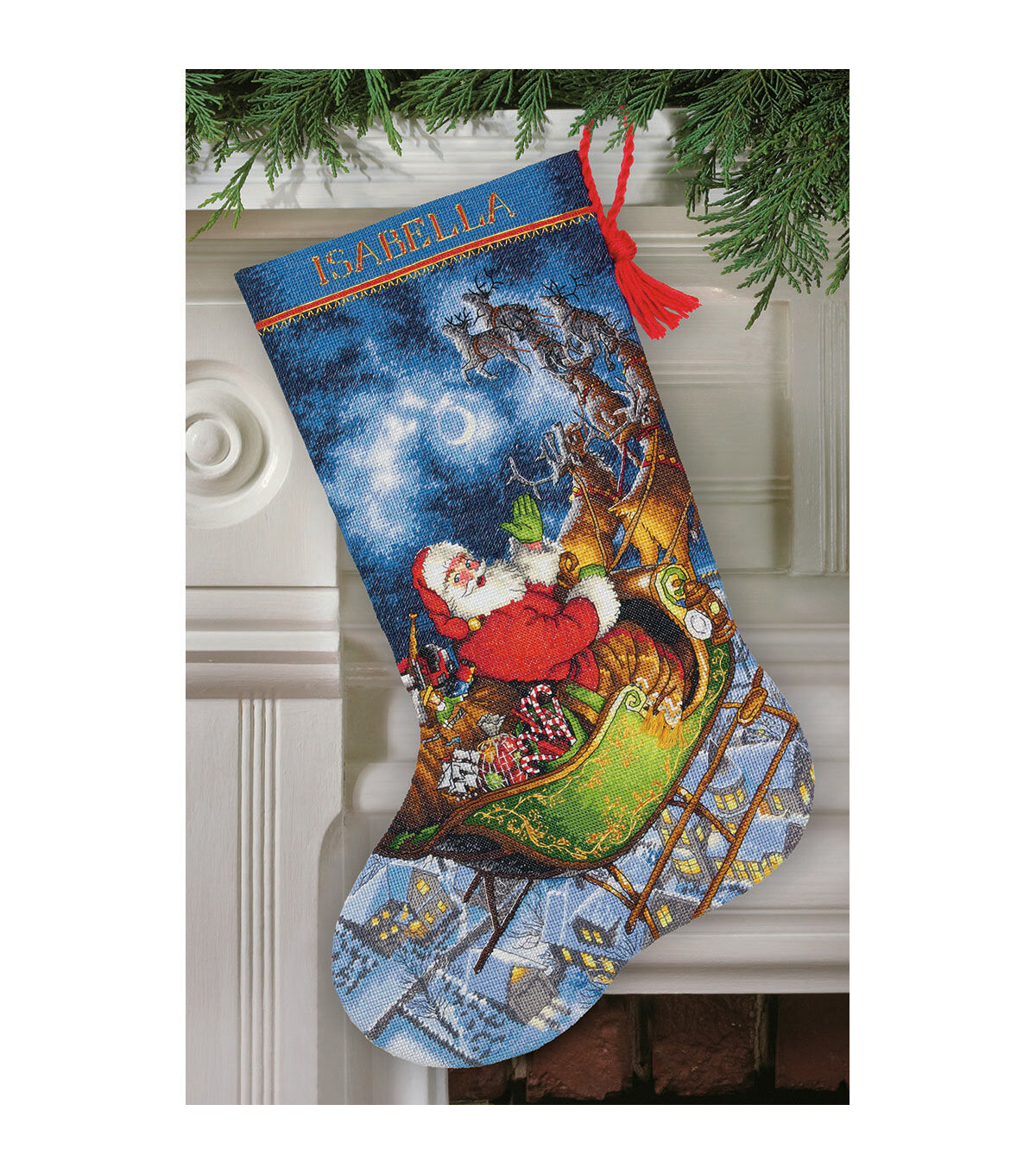 DIMENSIONS-The Gold Collection: Counted Cross Stitch Kit. The Gold Collection kits are wonderfully detailed with full and half cross stitches. This package contains 16-count gray Aida, felt, presorted thread, metallic thread, needle and easy instructions. 100% wool yarn included for hanger. Finished size: 16 inches long. Design: Santa's Flight Stocking. Designer: Tom Newsom. Imported.