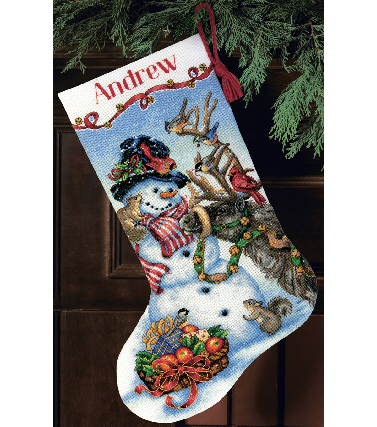 Create a lovely cross-stitched tree decoration using the Dimensions Gold Collection Snowman Gathering Stocking Counted Cross Stitch Kit 18 Count 13'' x 20''. Featuring a cheerful festive design of a smiling snowman in a wintry scene, it makes for a seasonal keepsake. This pack includes a 18-count white Aida fabric, wool yarn, metallic thread, needle, presorted thread, felt and easy instructions and alphabet for personalization. You can also frame this cross stitch design as a creative wall decor accent.