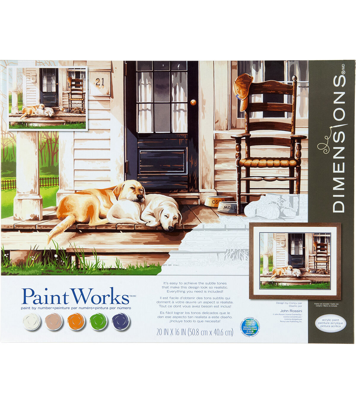 It's a rough life for these canines! Let your cares drift away as you paint the heartwarming Lazy Dog Day from PaintWorks. Finished size: 20" x 16". © John Rossini. License Granted by Penny Lane Publishing, Inc.