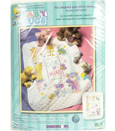 Create a lovely handmade quilt, using the Dimensions Baby Hugs Stamped Cross Stitch Pre-finished Quilt 43" x 34". This pre-finished quilt features a delightful visual of animals playing with toys, wearing bibs and holding feeders along with initial letters from the alphabet and a fun phrase. The set includes simple instructions which can be followed to create a finished design measuring 43 x 34 inches by using the needle and embroidery thread on the pre-printed poly/cotton blend quilt.