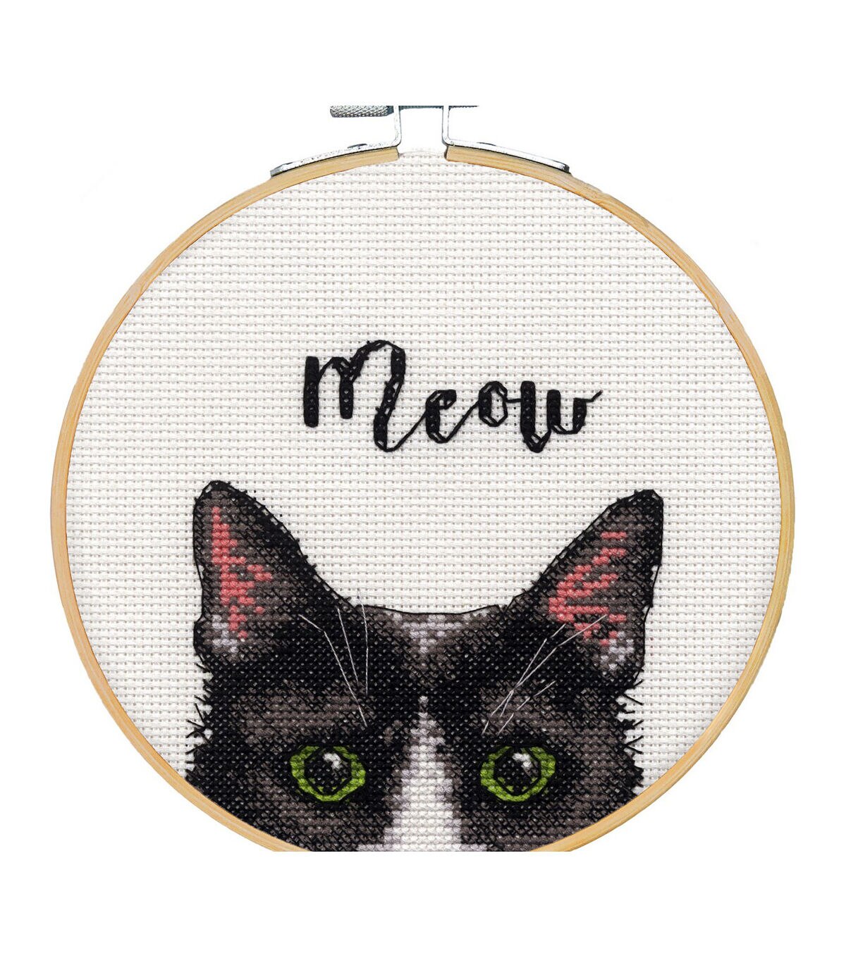 Featuring a very curious kitty, Meow in counted cross stitch by Dimensions will delight any feline enthusiast. Kit contains presorted thread, 14 count white Aida, six inch wood hoop for stitching and finishing, needle and instructions.