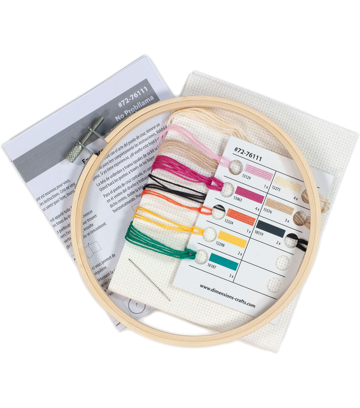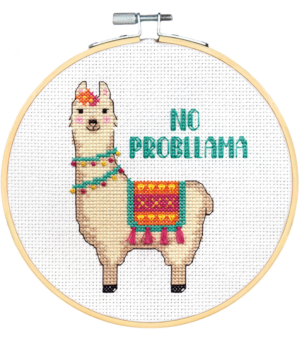 No worries, a friendly llama is here to make you smile! Featuring a fun play on words, No Probllama in counted cross stitch by Dimensions is quick and easy to stitch. Finished size: 6" diameter. Kit contains presorted thread, 14 count white Aida , 6-inch bamboo hoop, needle, and instructions.