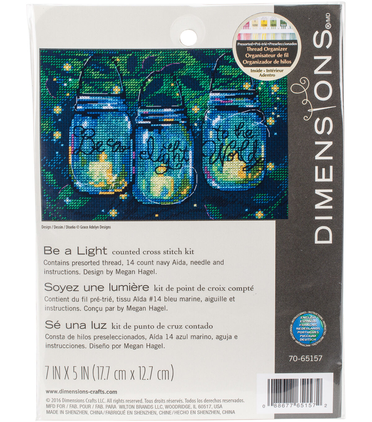 Dimensions-Mini Counted Cross Stitch Kit. From elegant to whimsical, landscapes to still-life's, realistic to fantasy, no matter your style Dimensions has a fabulous needle-craft kit for you. This package contains 14-count navy Aida, presorted thread, one needle and easy to follow instructions. Finished size: 5x7 inches. Design: Be A Light. Designer: Grace Adelyn. Imported.