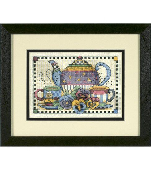 Quaintly illustrated in vibrant hues, this teatime will cheer your heart and home. Dimensions Mini Counted Cross Stitch kit includes 14 count Aida cloth, embroidery floss, gold plated needle and tri-lingual instructions. 7''x5''