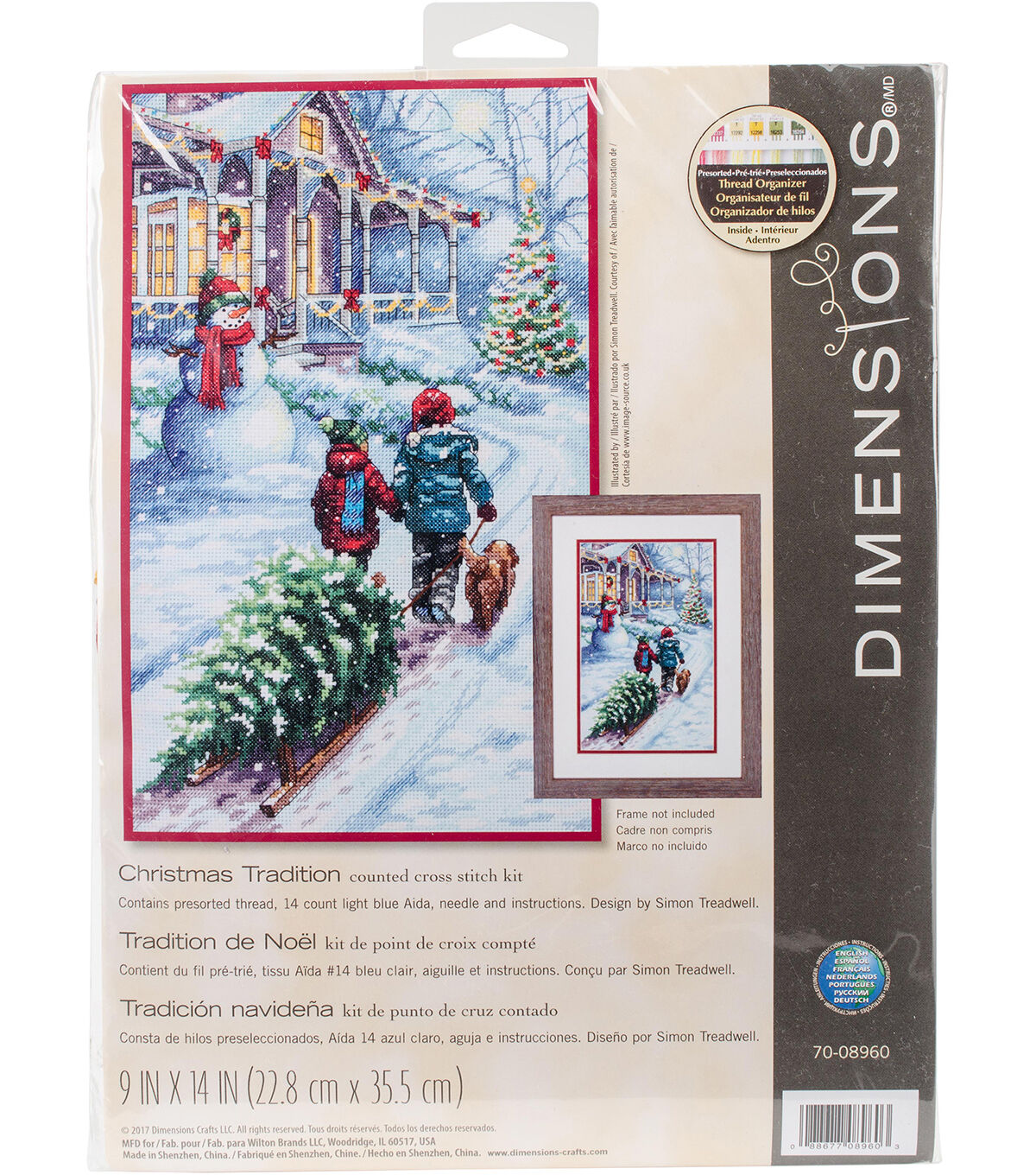 From elegant to whimsical, landscapes to still-life's, realistic to fantasy, no matter your style Dimensions has a fabulous needle- craft kit for you. This package contains 14-count light blue Aida, presorted thread, one needle and easy to follow instructions. Size: 9x14 inches. Design: Christmas Tradition. Designer: Simon Treadwell. Imported.